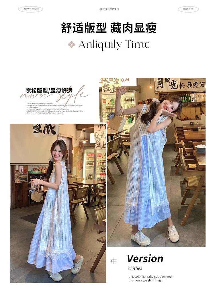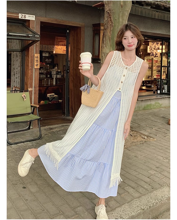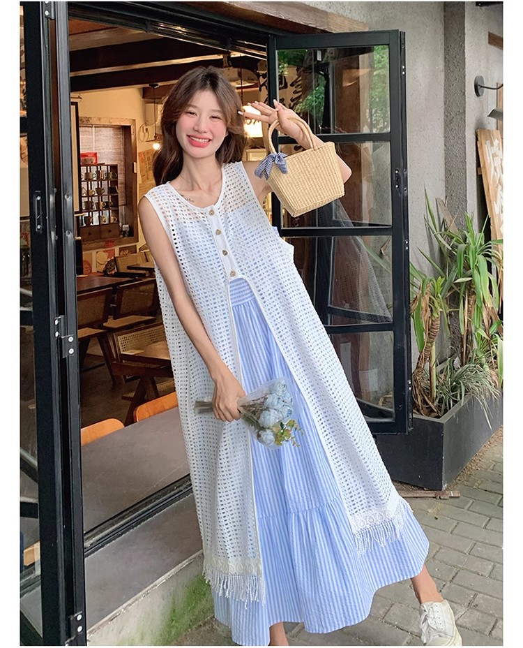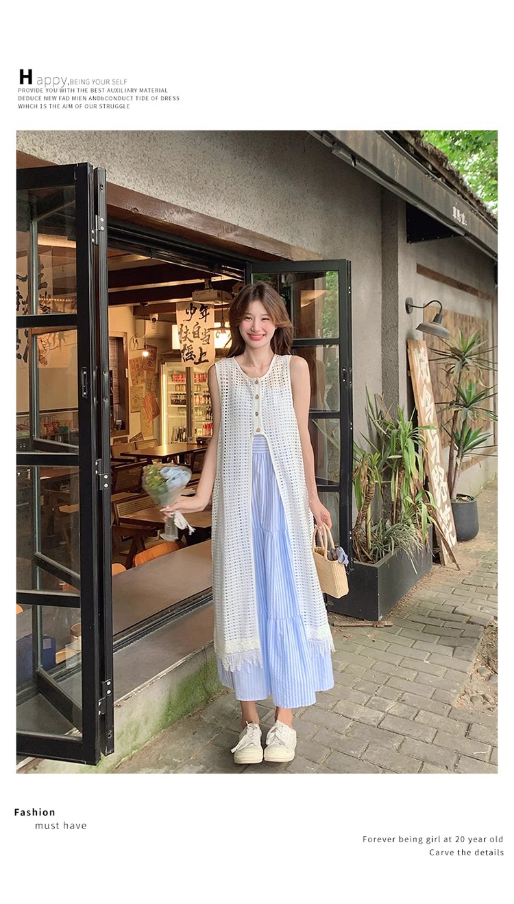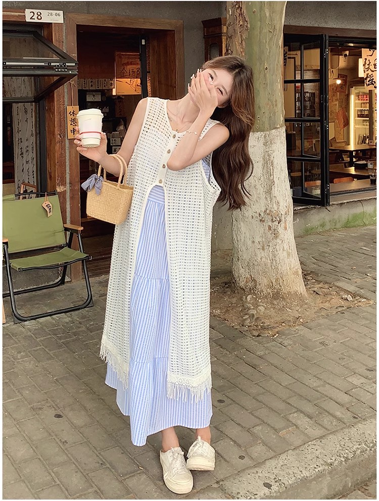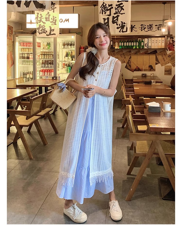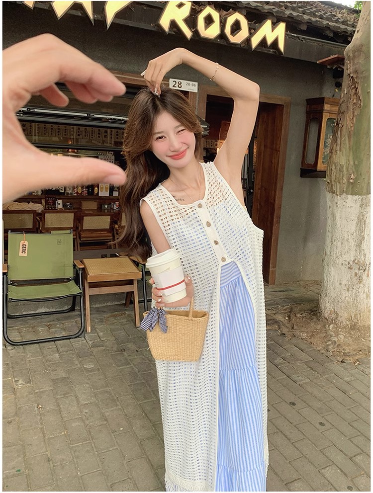蓝色条纹吊带裙套装女夏2026新款超好看罩衫连衣裙夏季搭配一整套