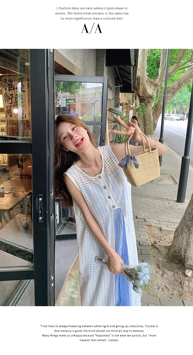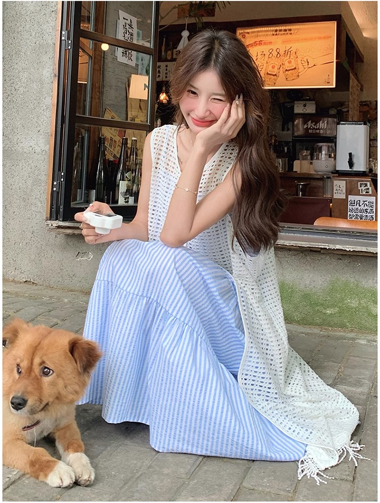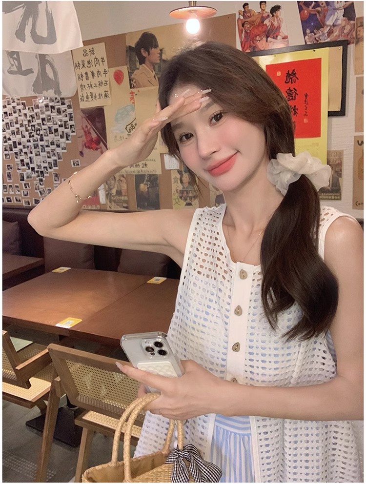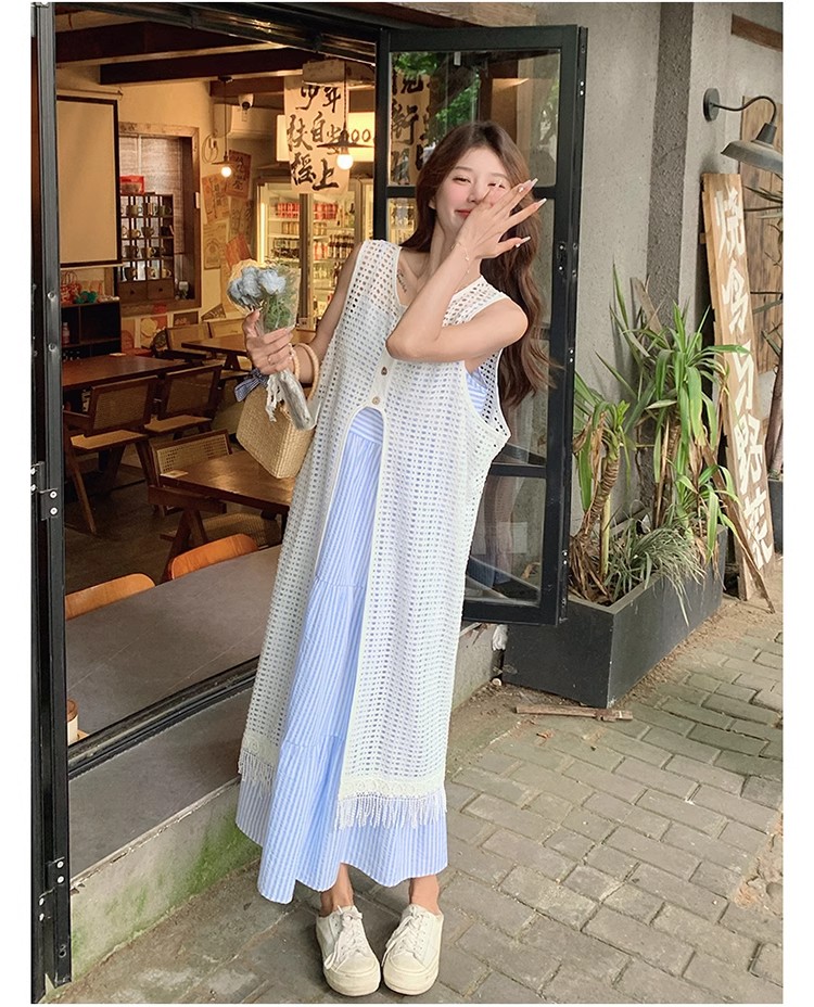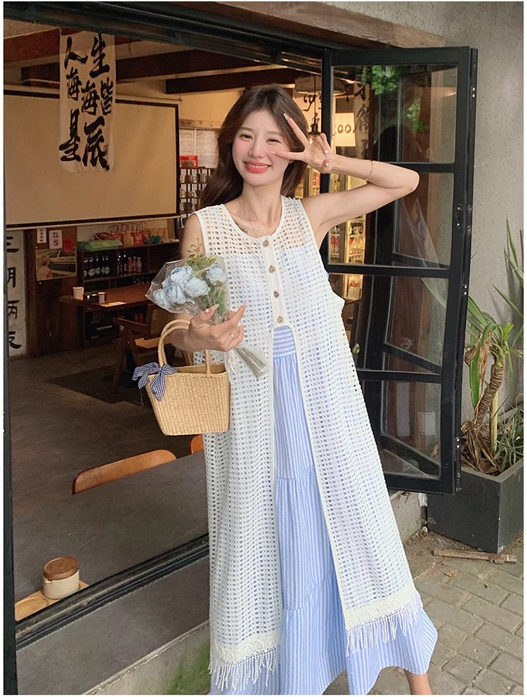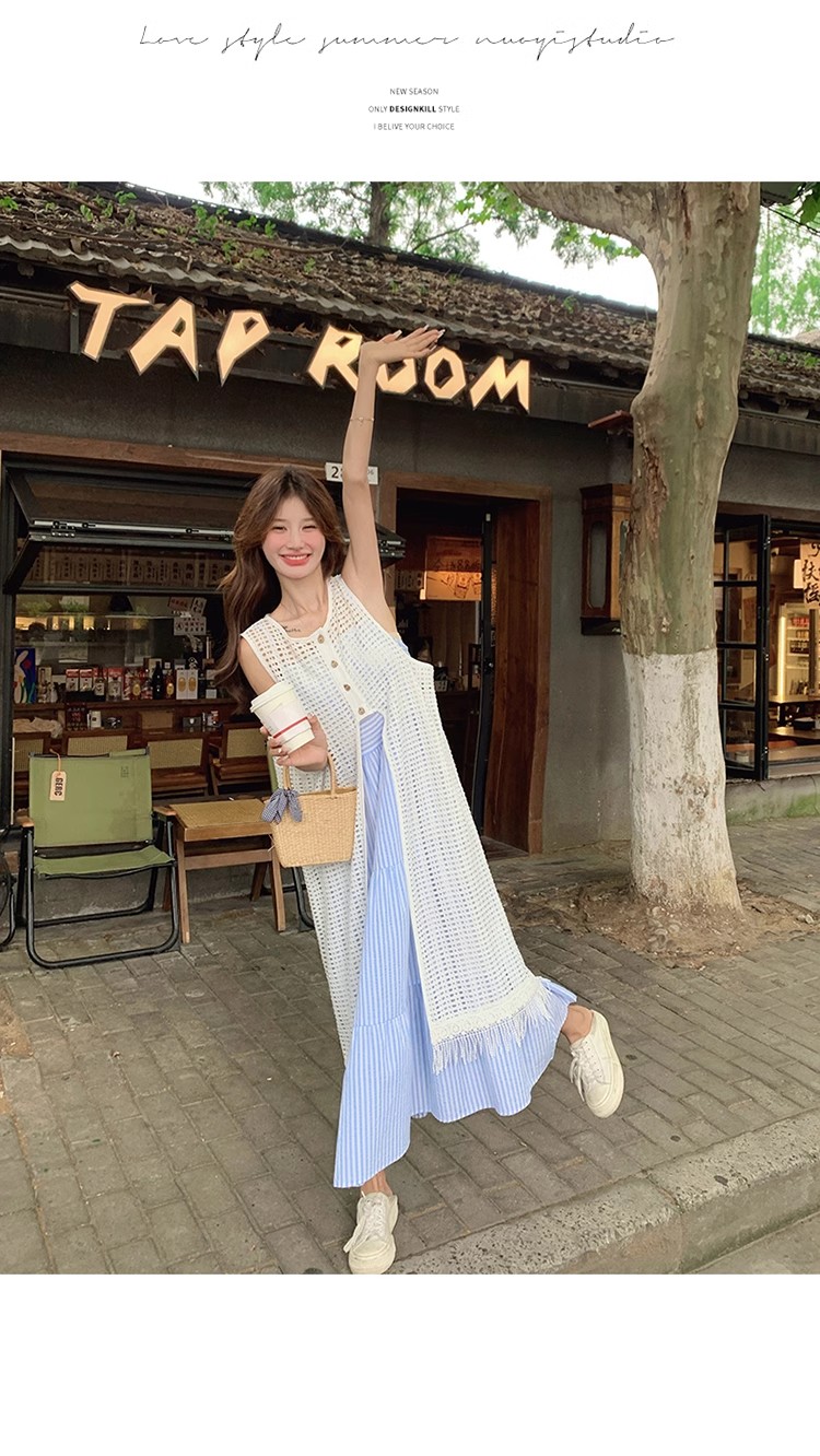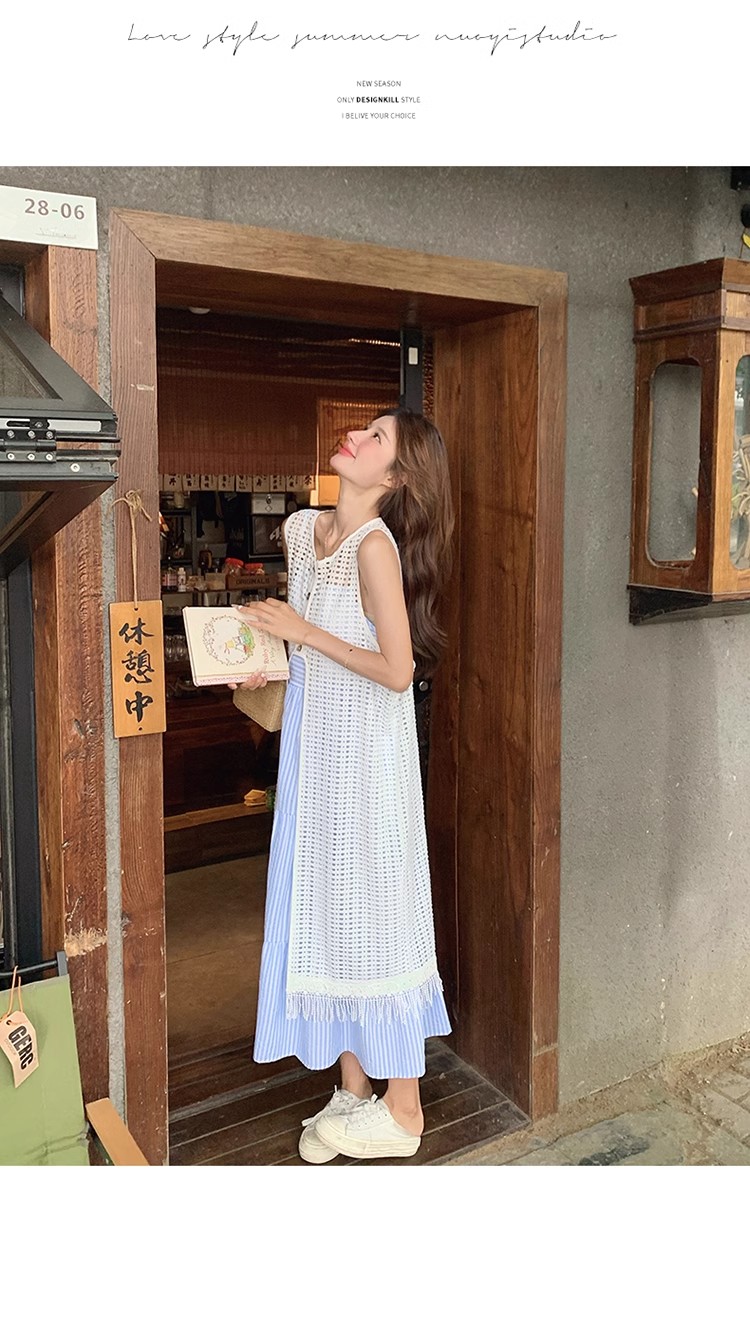 蓝色条纹吊带裙套装女夏2026新款超好看罩衫连衣裙夏季搭配一整套