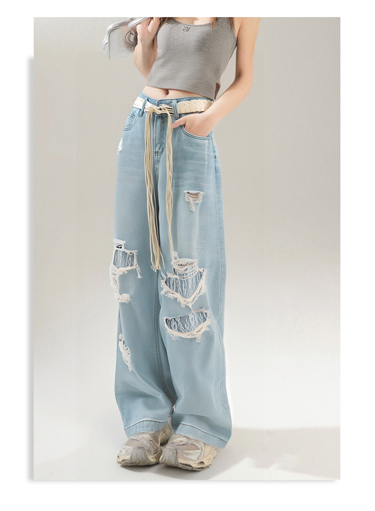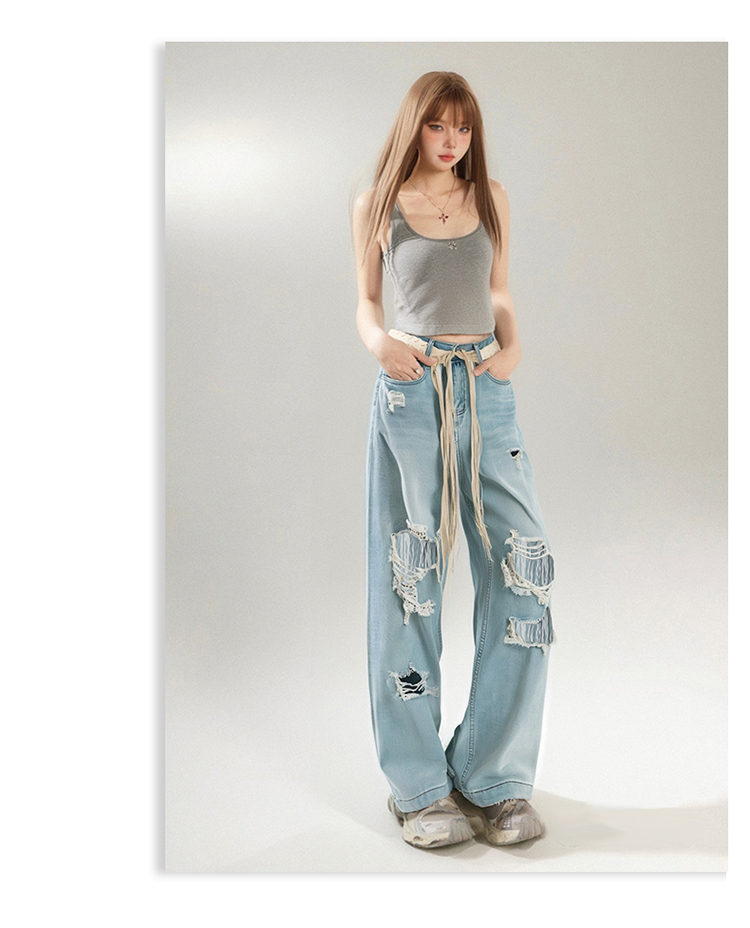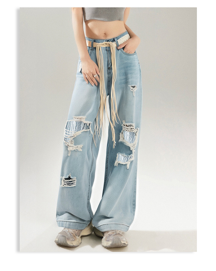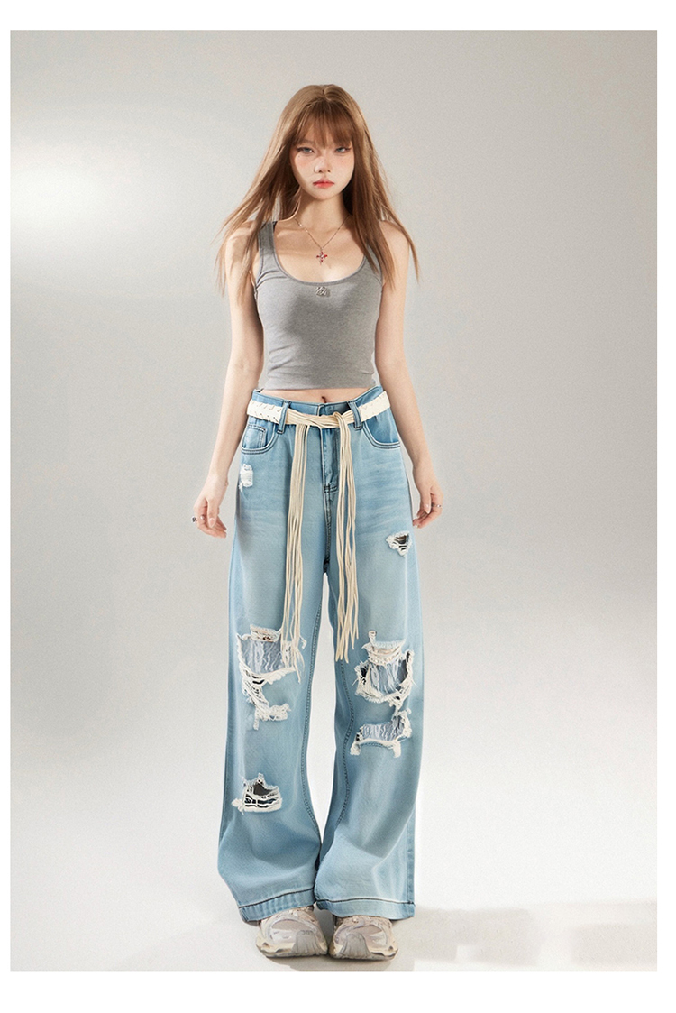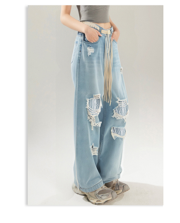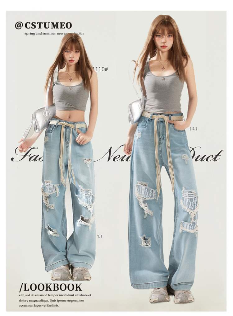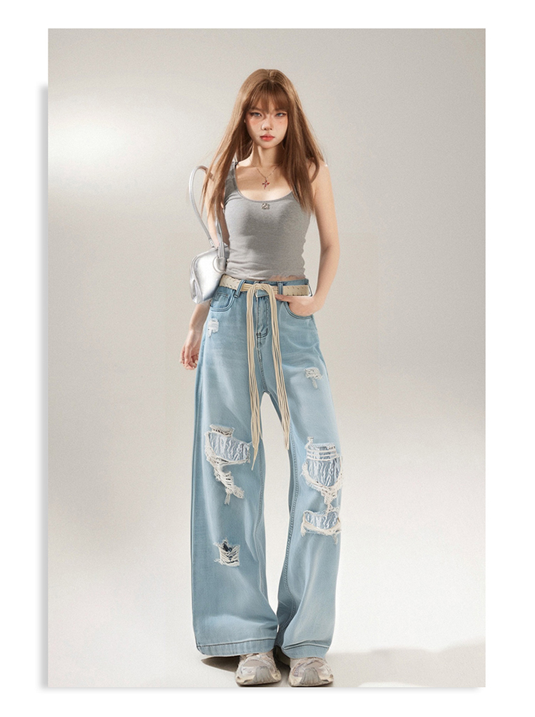 蕾丝破洞阔腿牛仔裤女2026年夏季设计感网纱拼接高腰宽松直筒长裤
