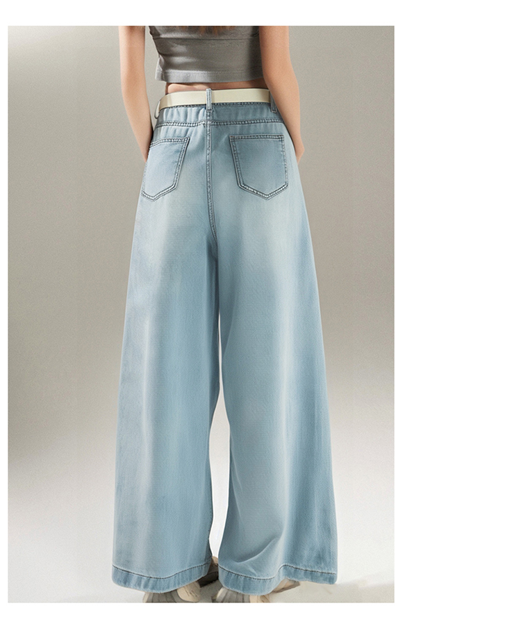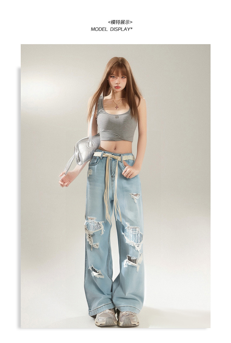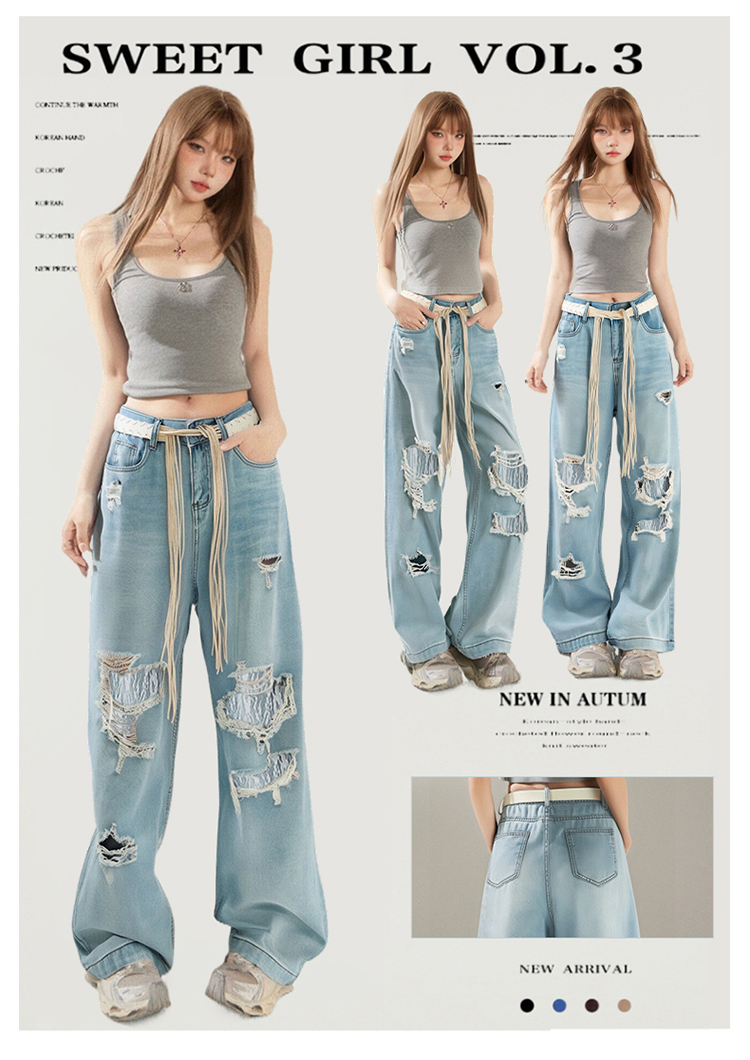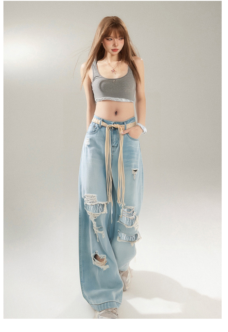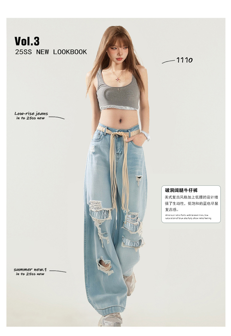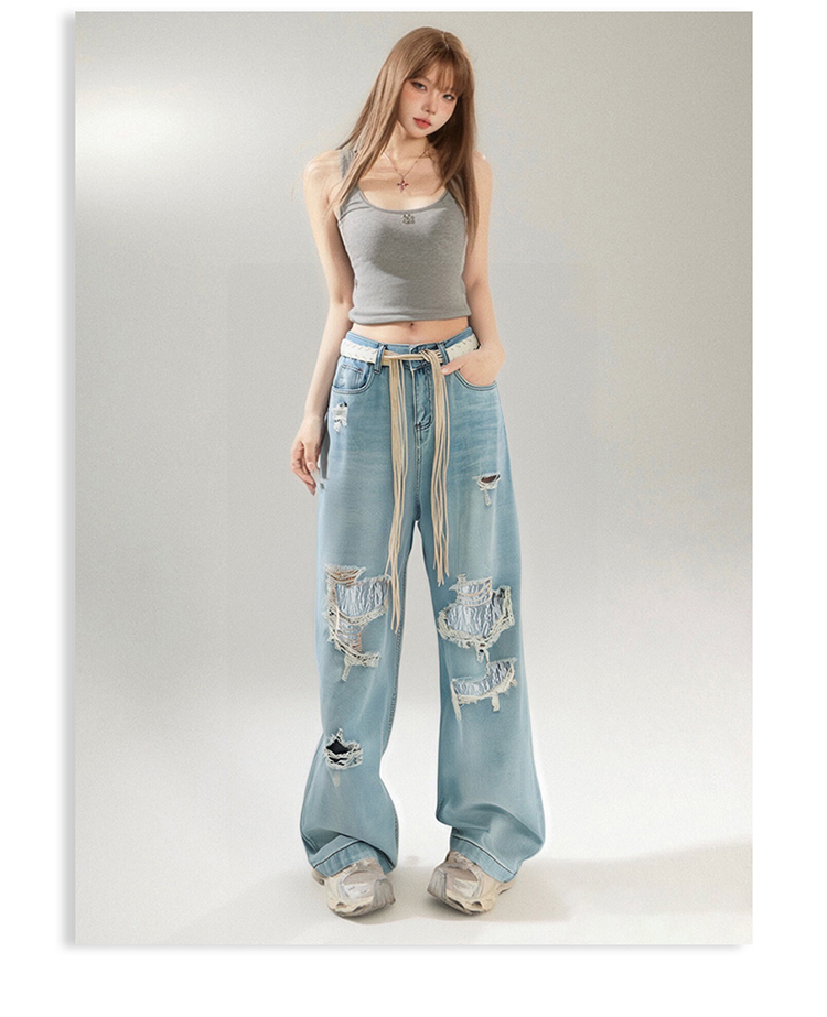 蕾丝破洞阔腿牛仔裤女2026年夏季设计感网纱拼接高腰宽松直筒长裤