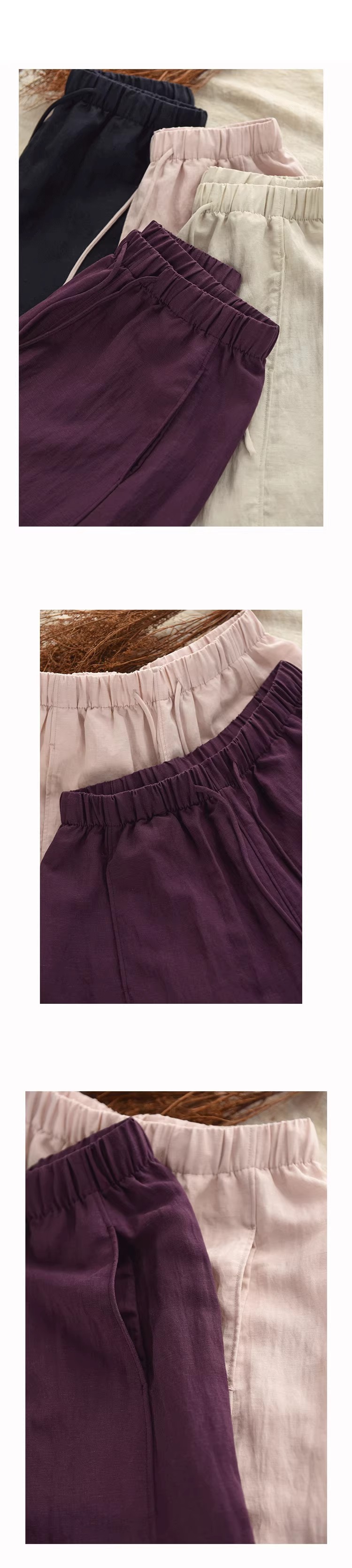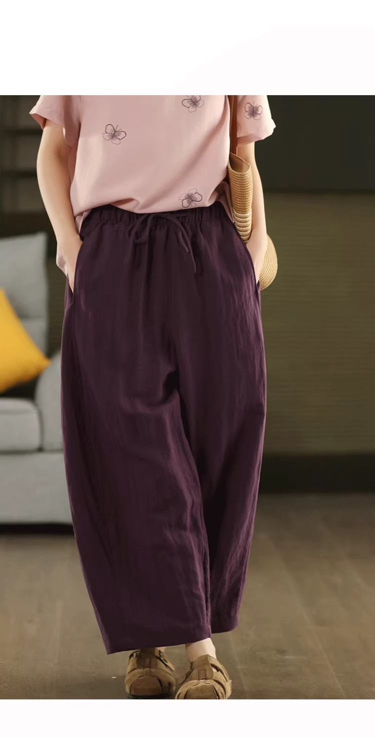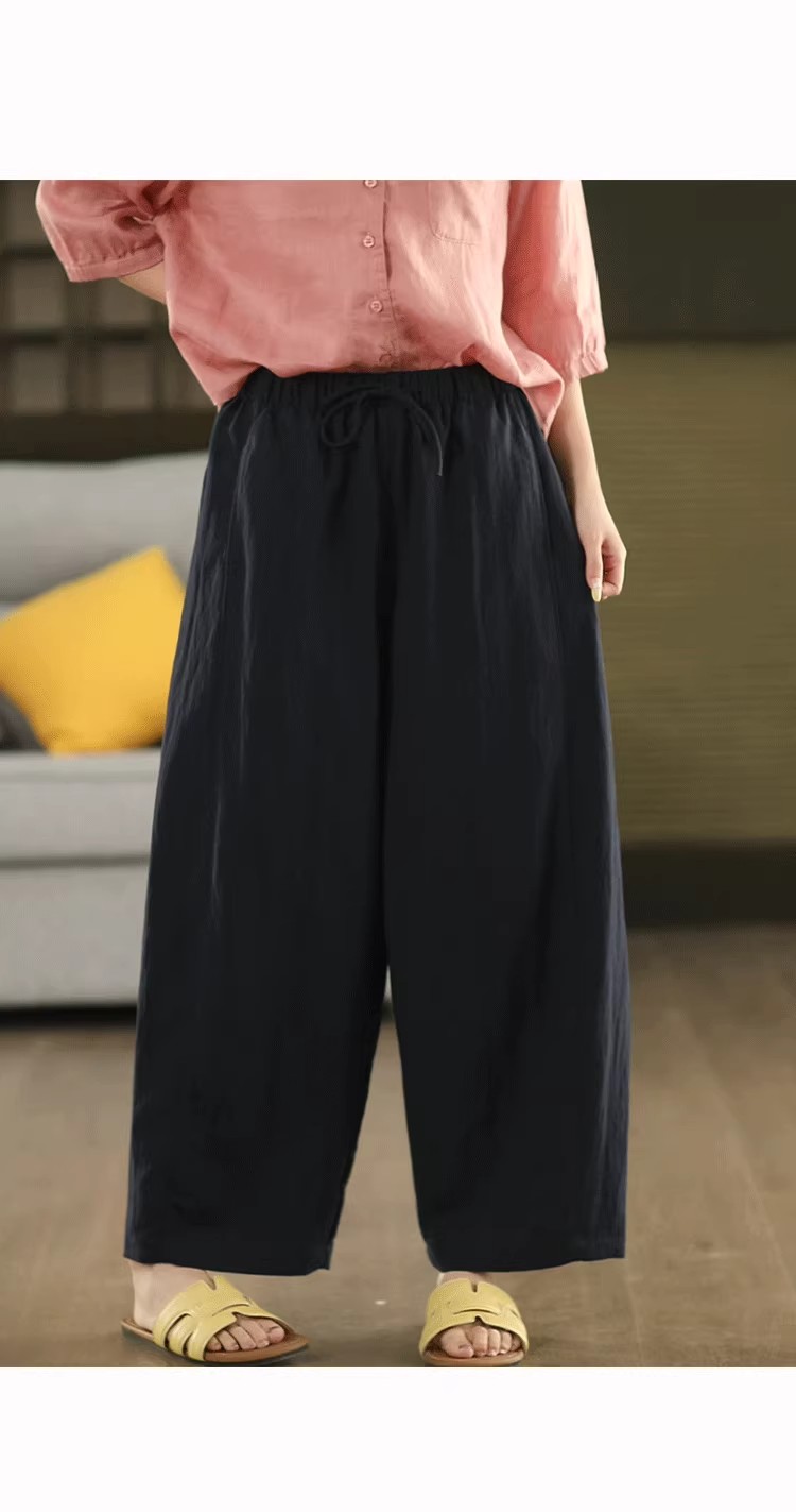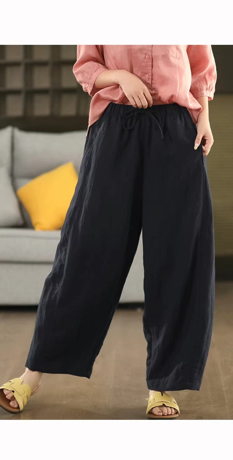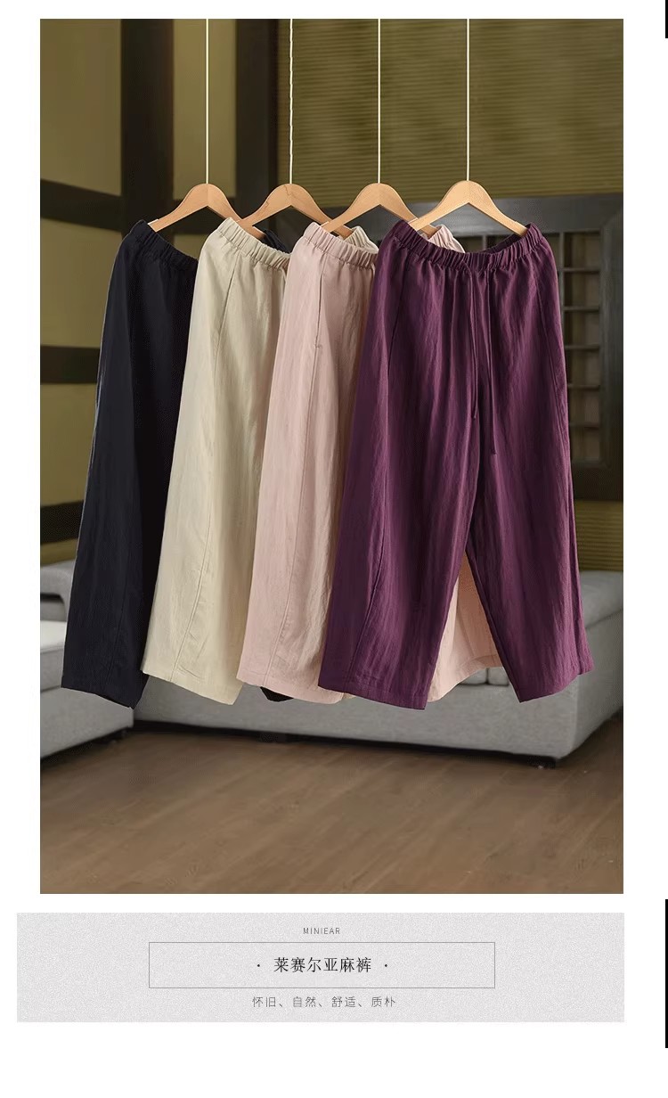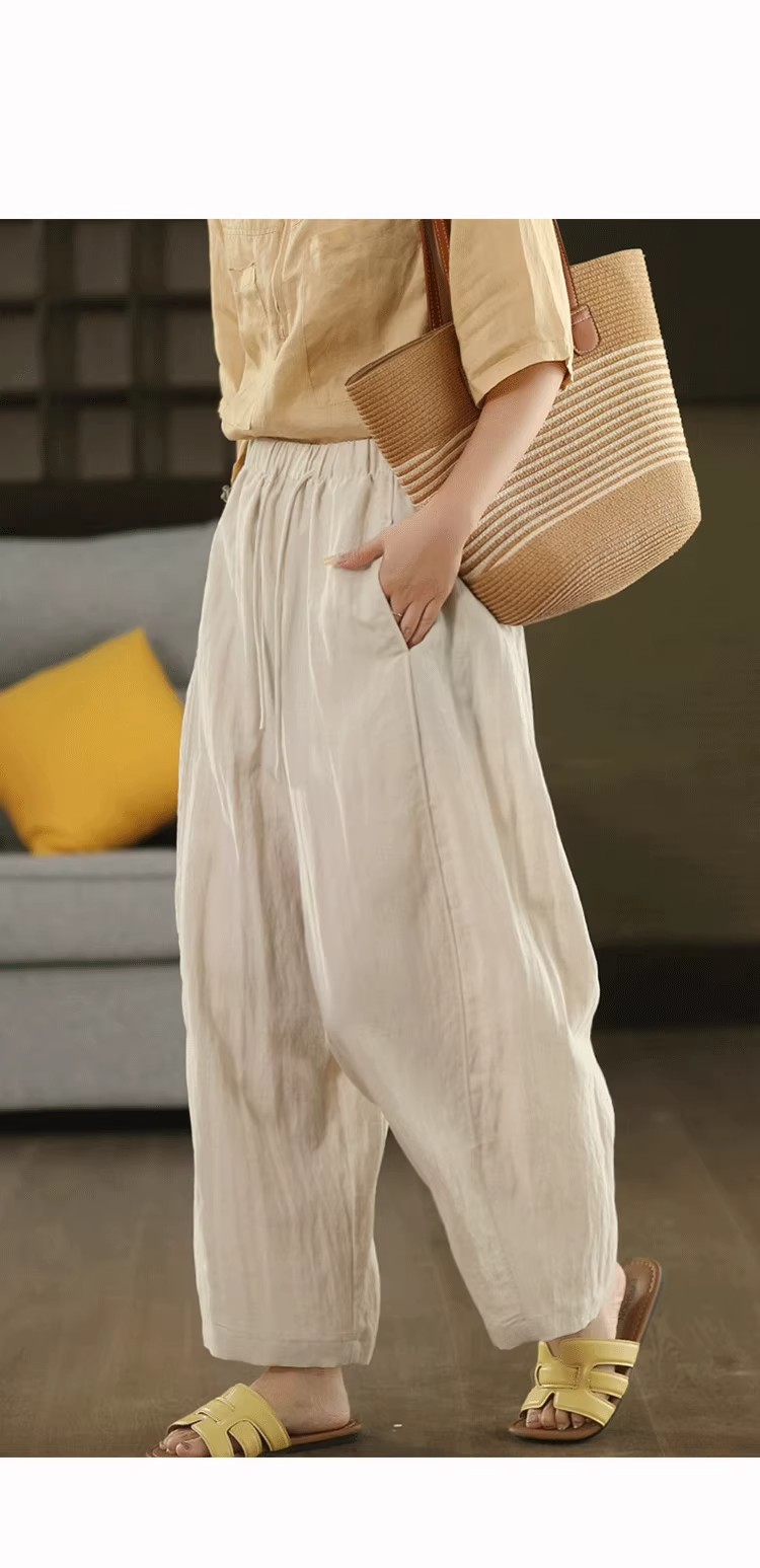 复古莱赛尔亚麻显瘦哈伦裤松紧腰休闲裤百搭宽松文艺长裤