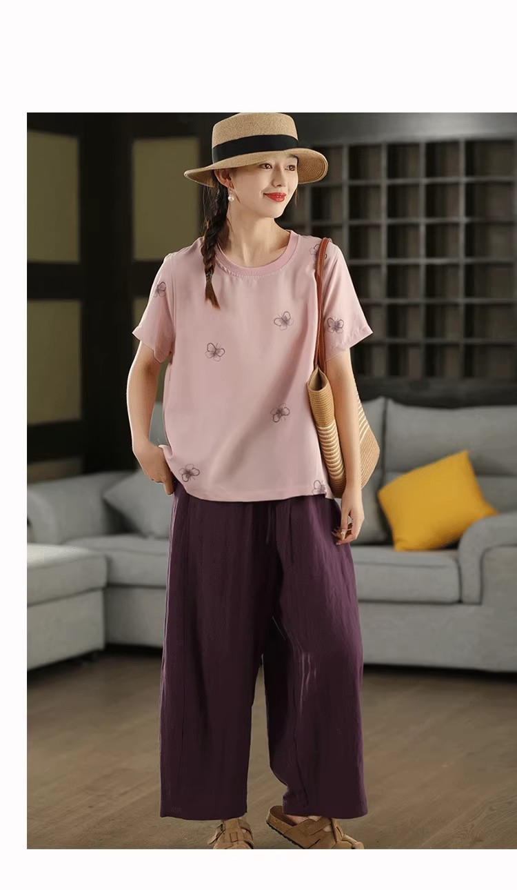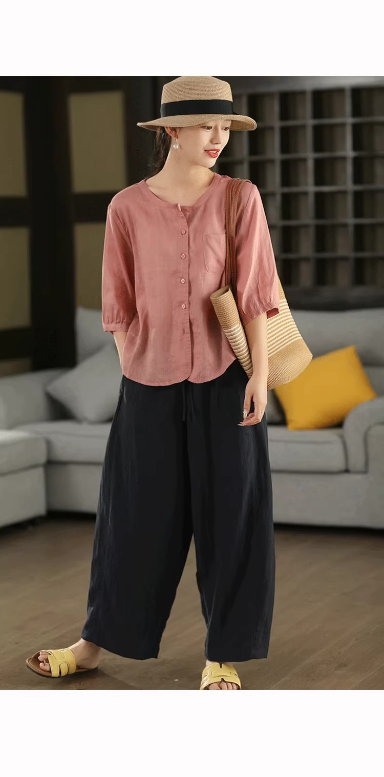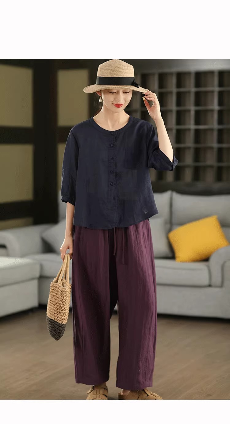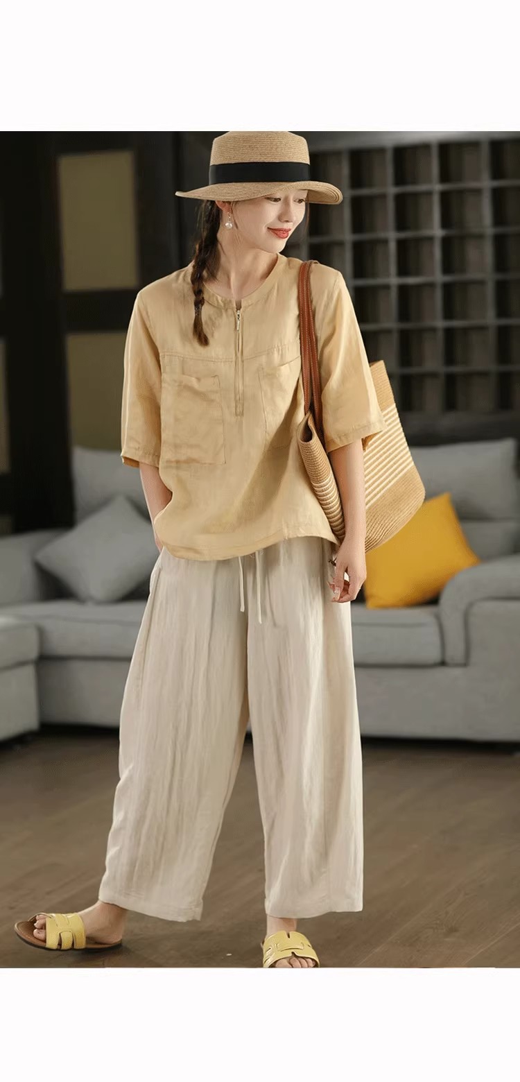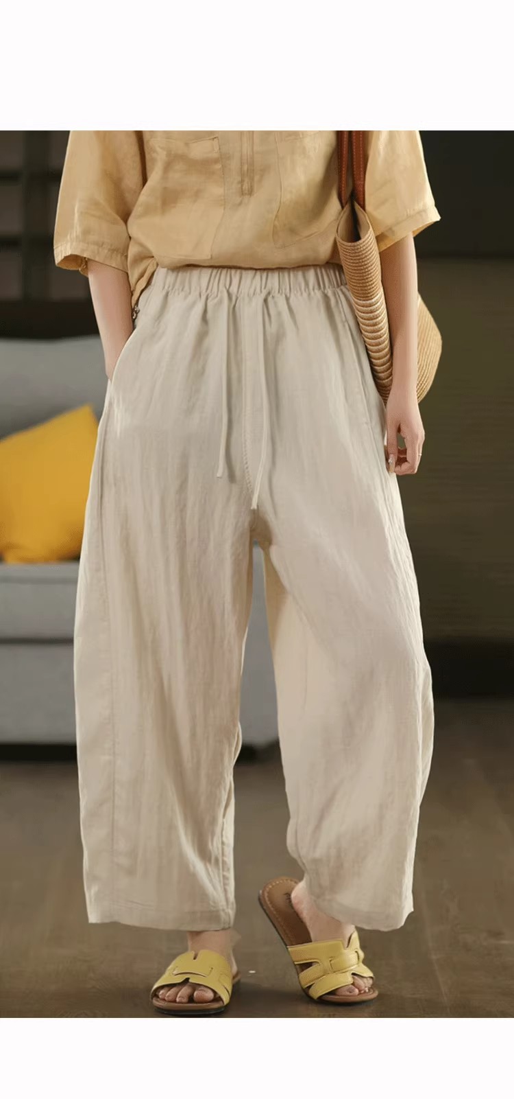 复古莱赛尔亚麻显瘦哈伦裤松紧腰休闲裤百搭宽松文艺长裤