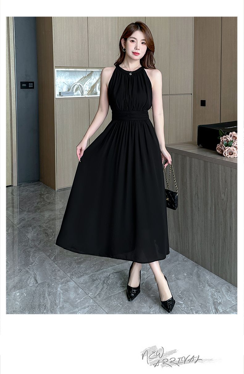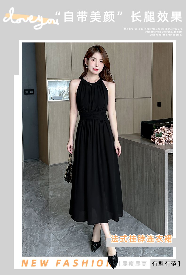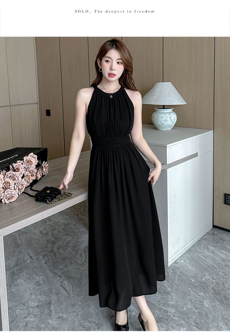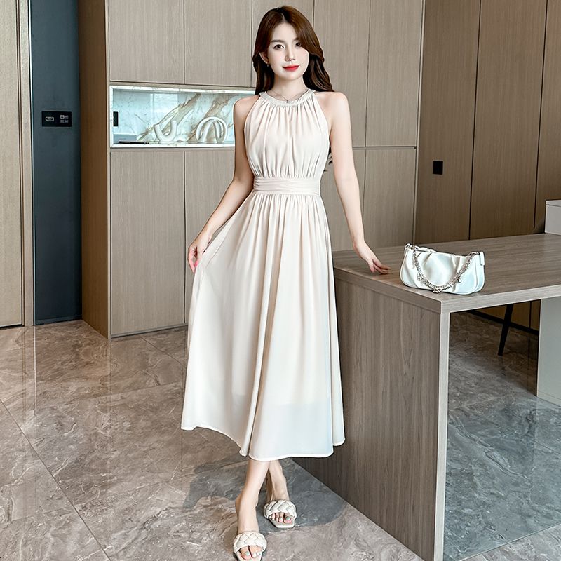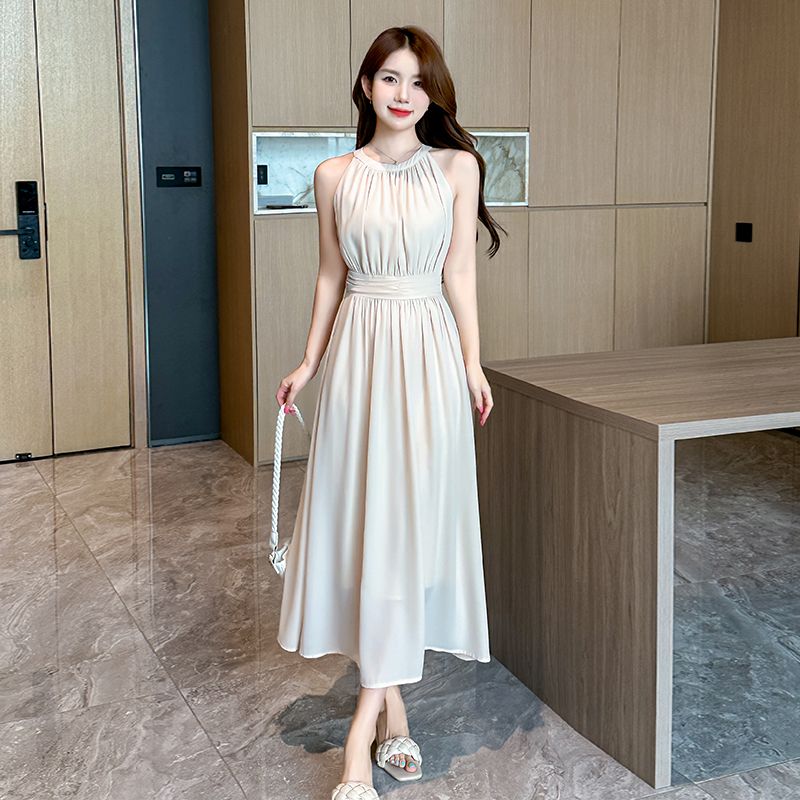 2026新款杏色雪纺长裙春夏温柔气质通勤收腰A字裙无袖挂脖连衣裙