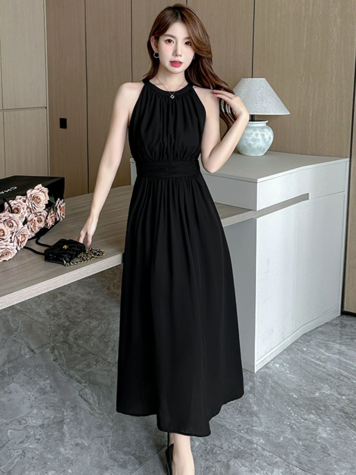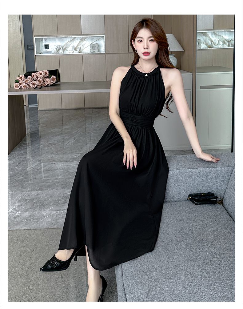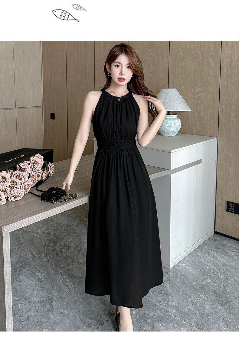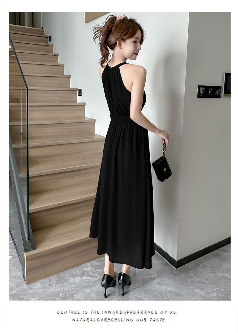 2026新款杏色雪纺长裙春夏温柔气质通勤收腰A字裙无袖挂脖连衣裙