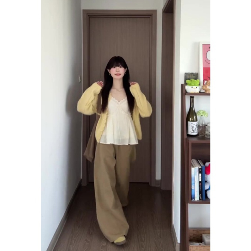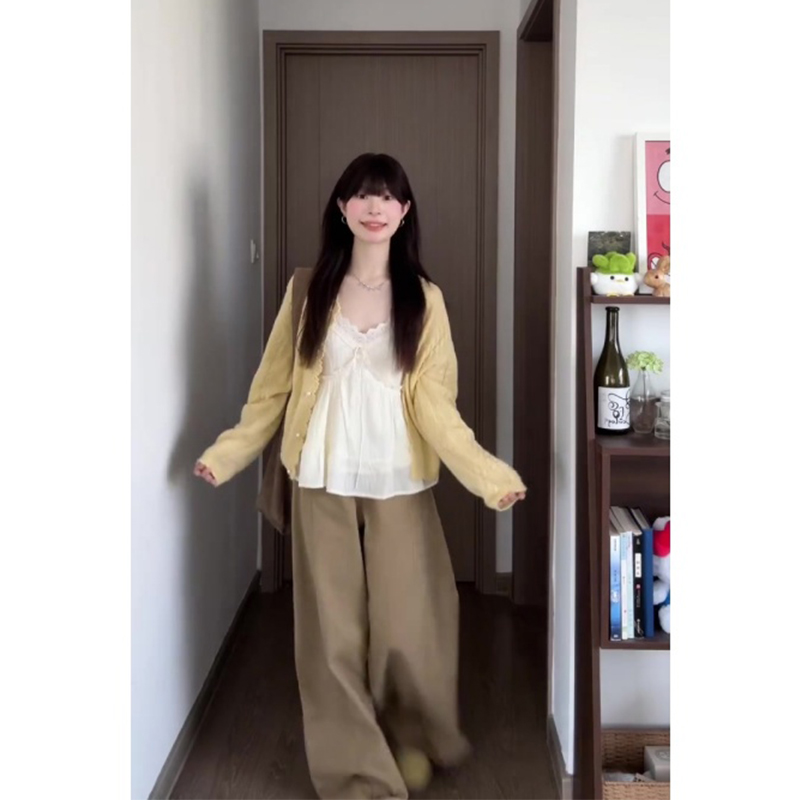 实价有货早春超好看黄色长袖开衫蕾丝边吊带背心阔腿裤子三件套
