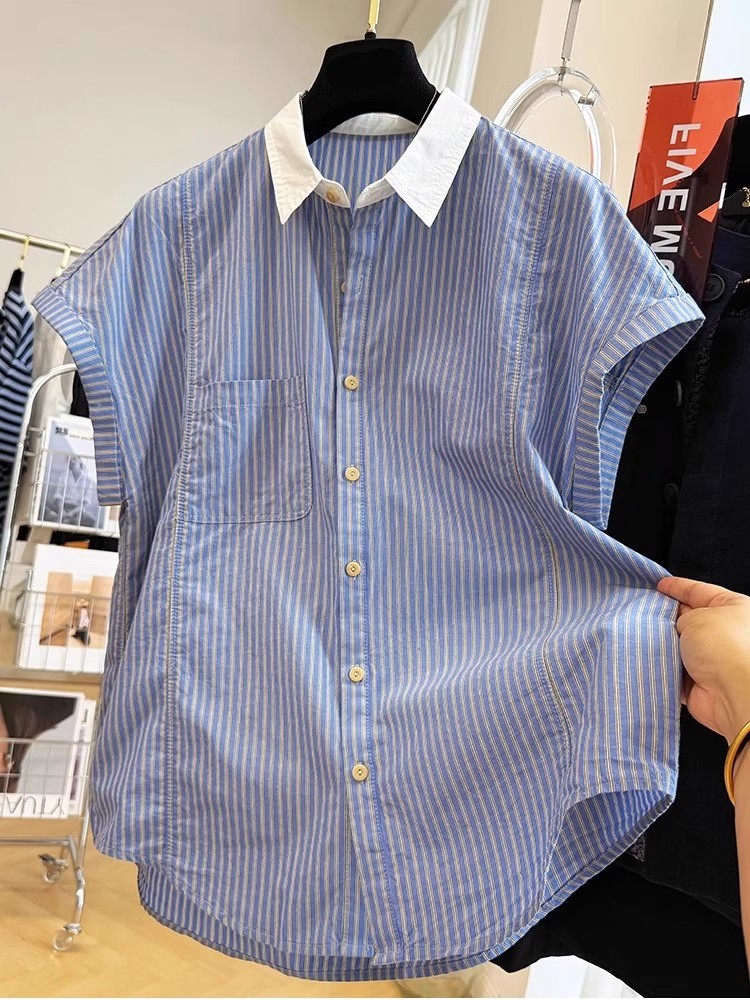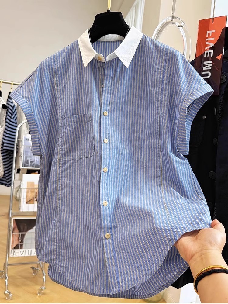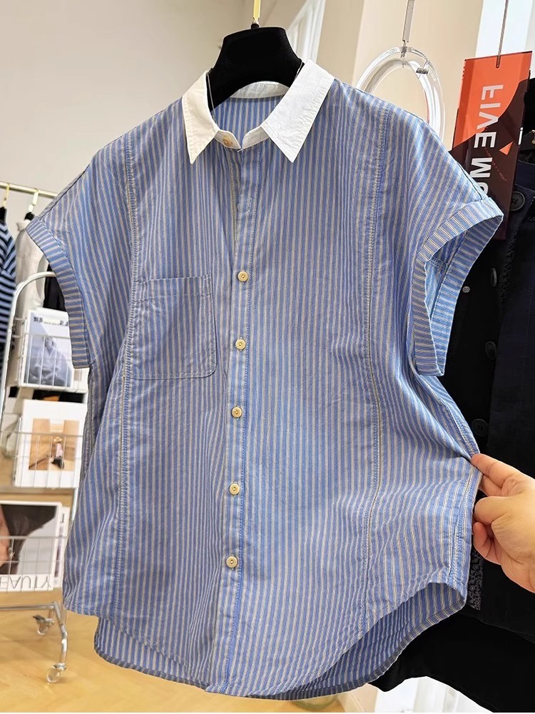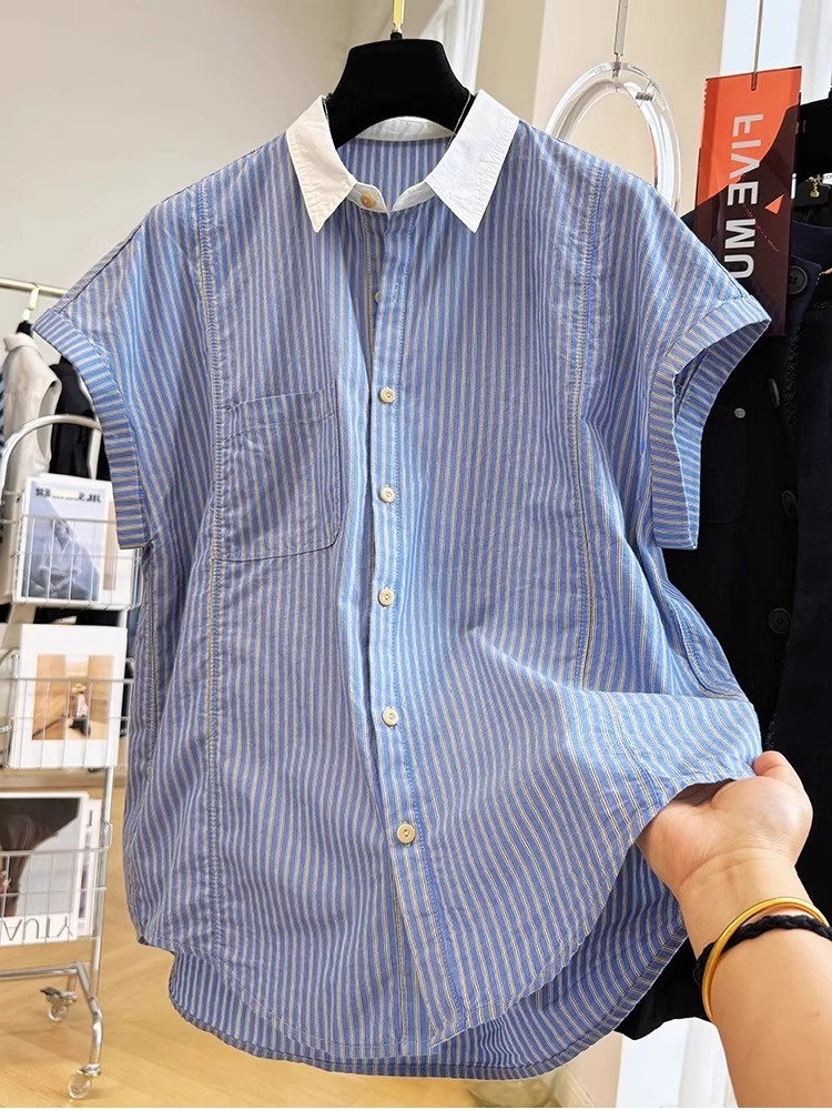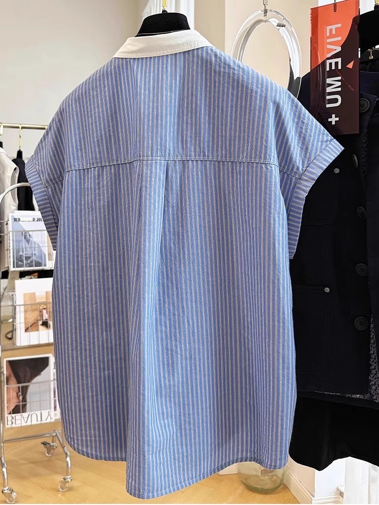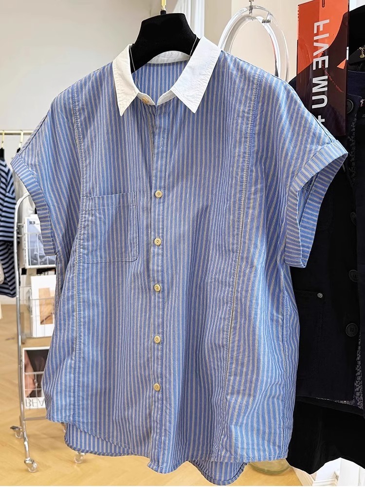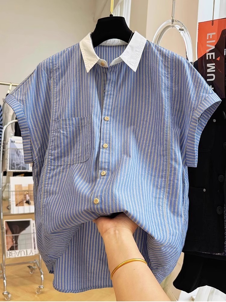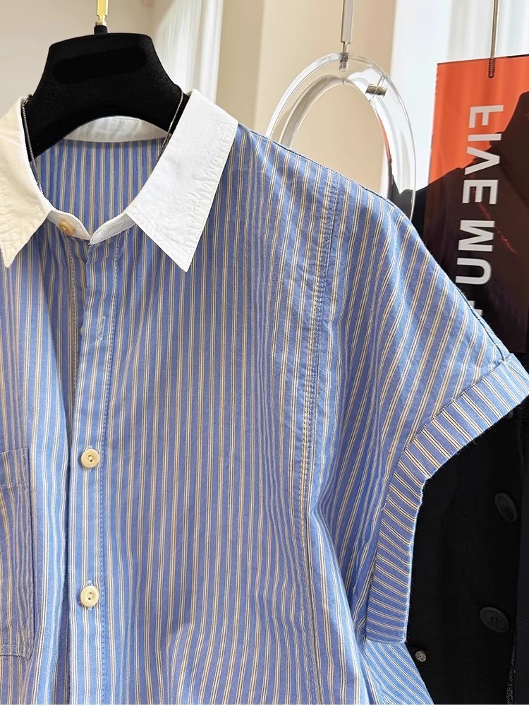 夏装新款大码女装法式温柔风复古竖条纹翻领短袖衬衫减龄洋气衬衣
