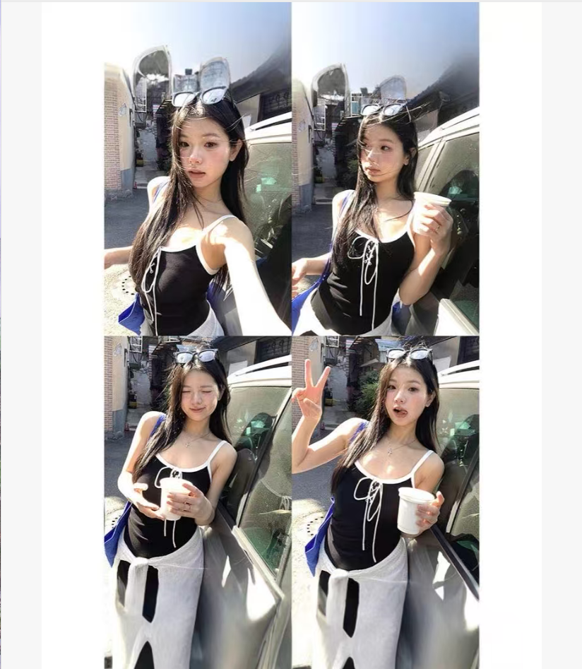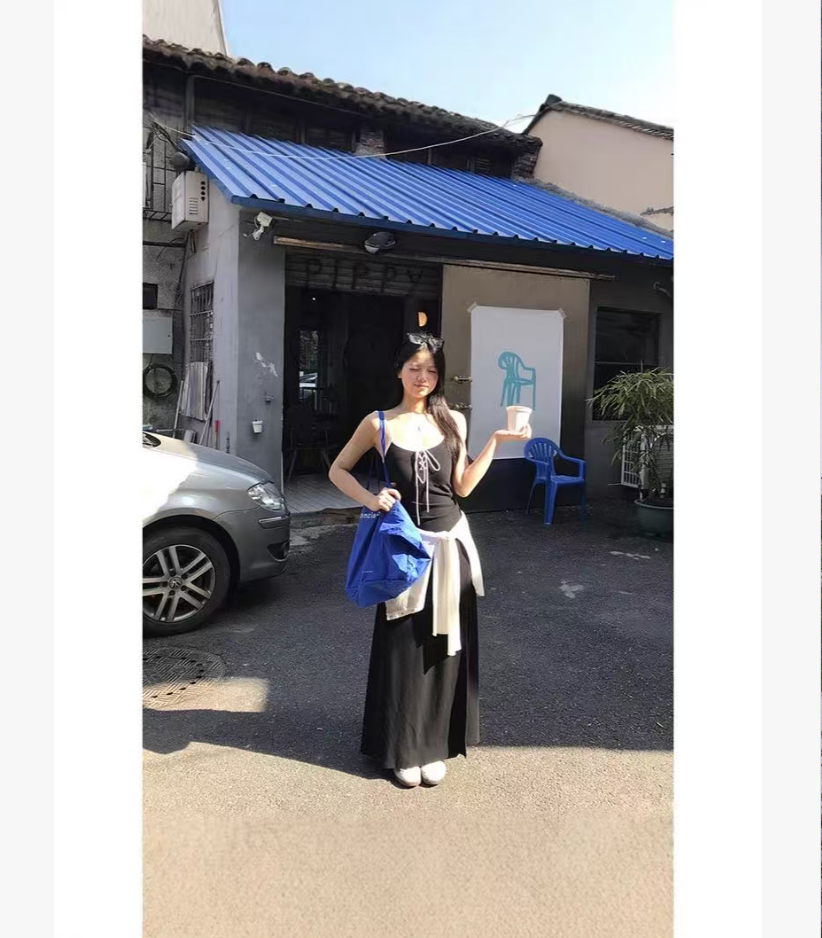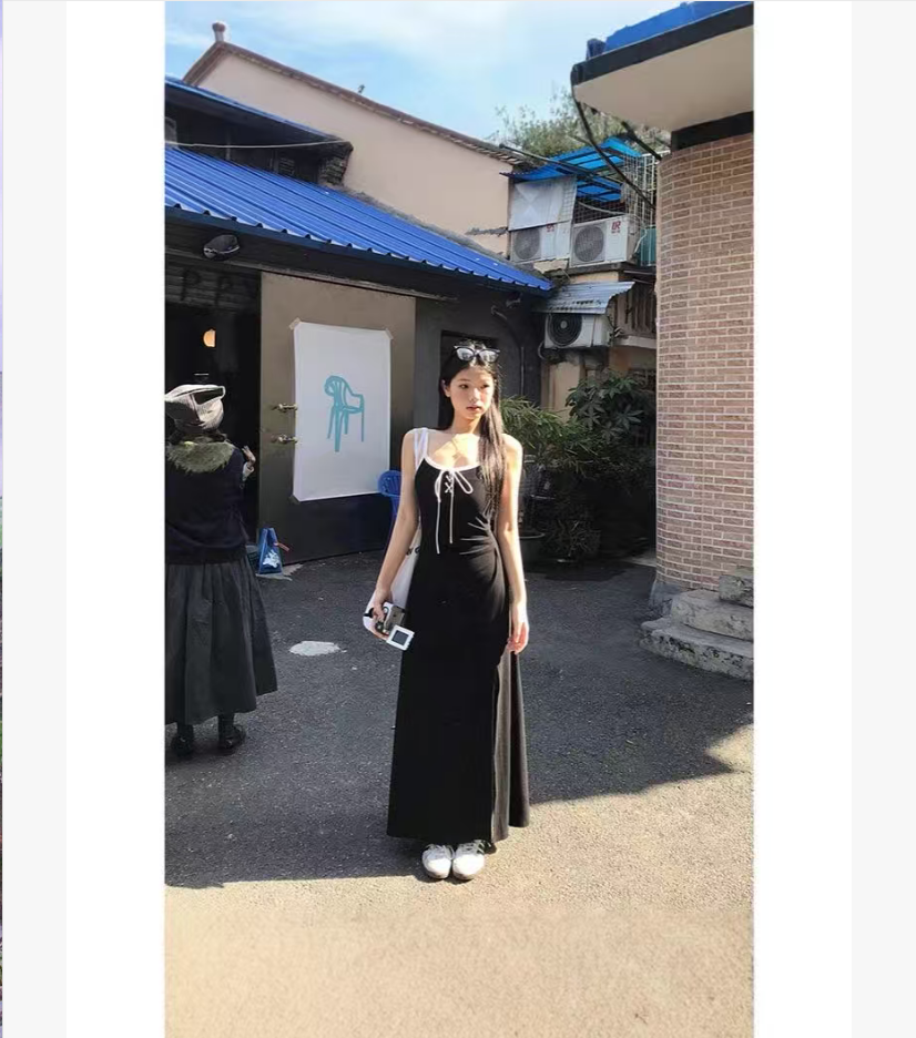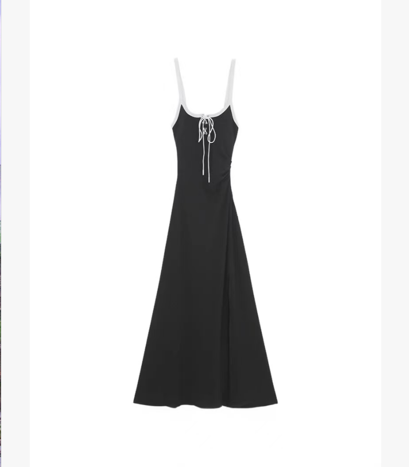 美式辣妹黑色A字吊带连衣裙女新款别致收腰绑带开叉长裙