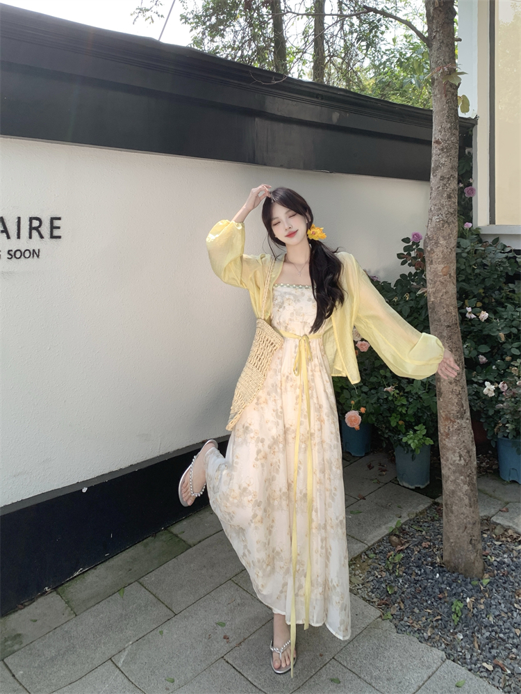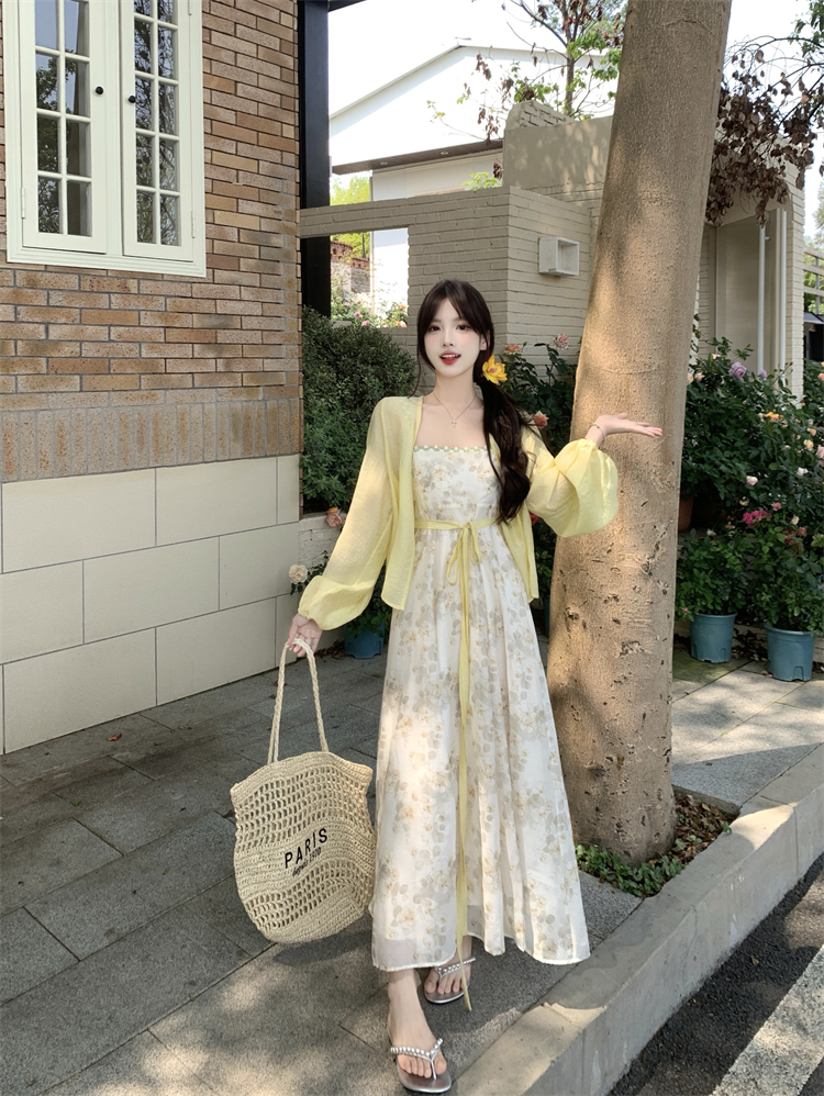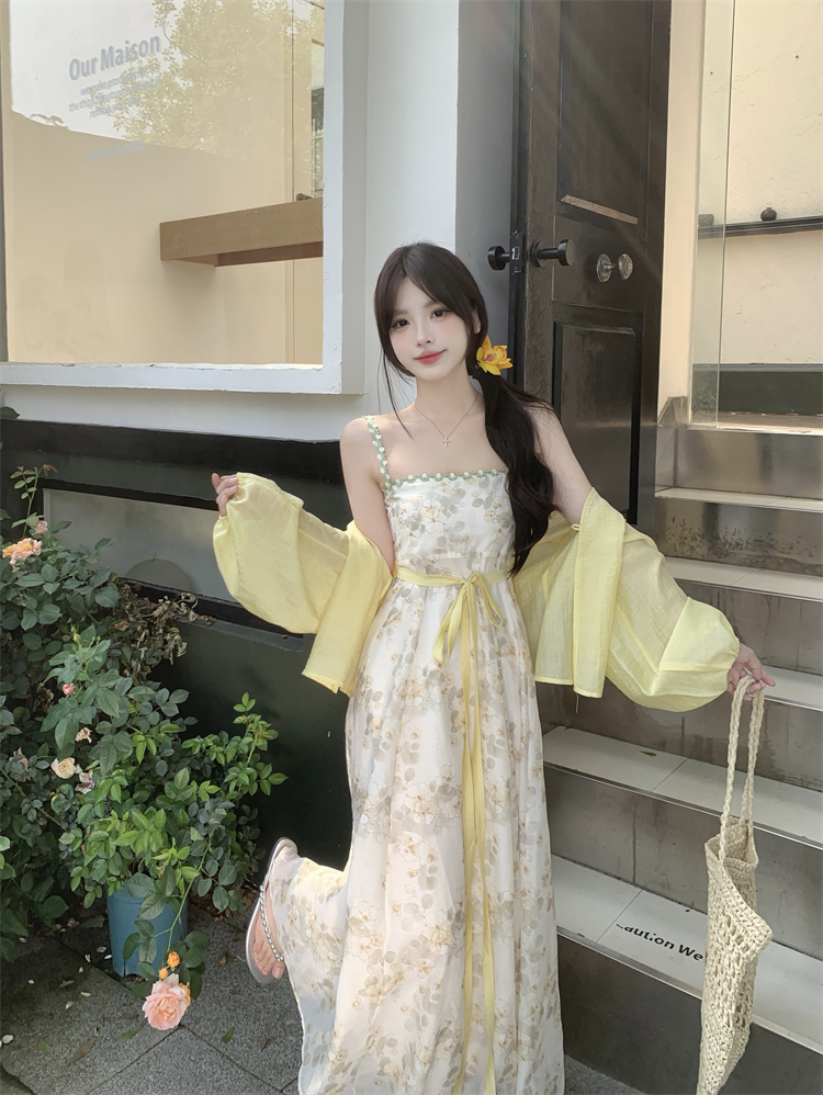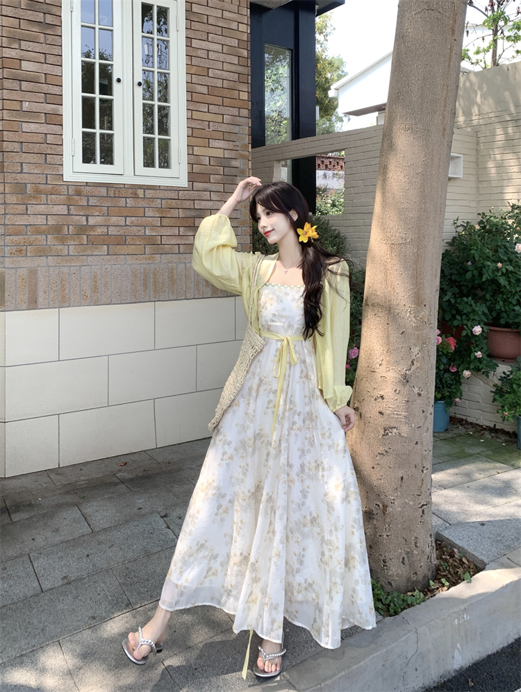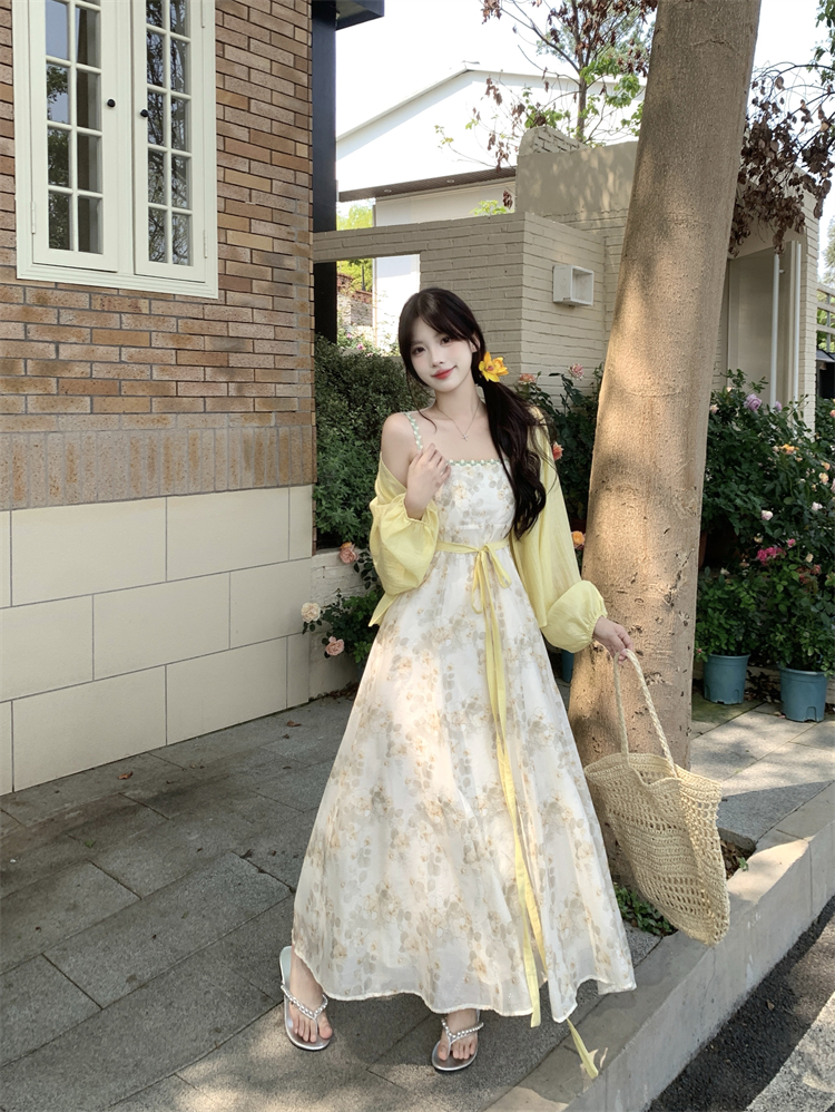 实拍大码女装超火套装女温柔风减龄显瘦开衫碎花吊带连衣裙两件套