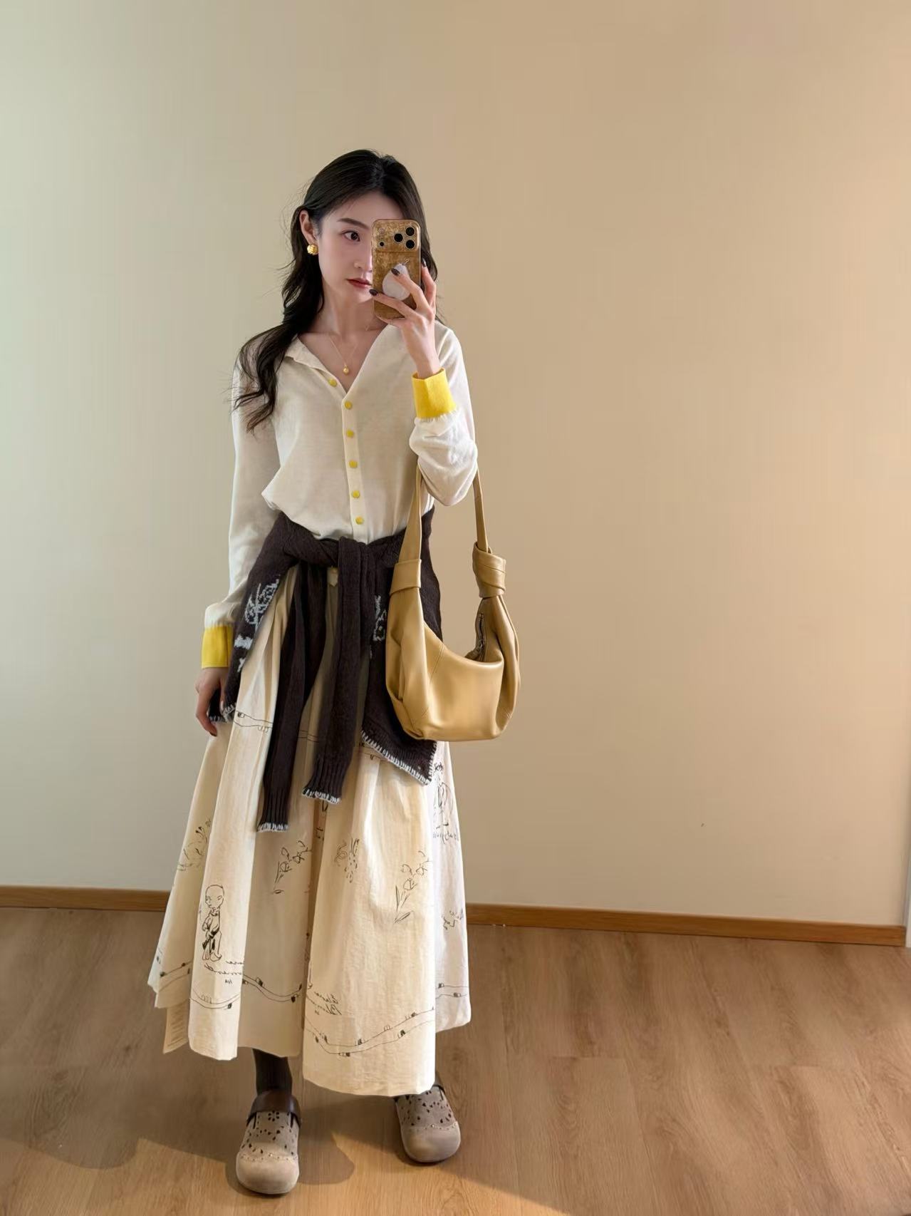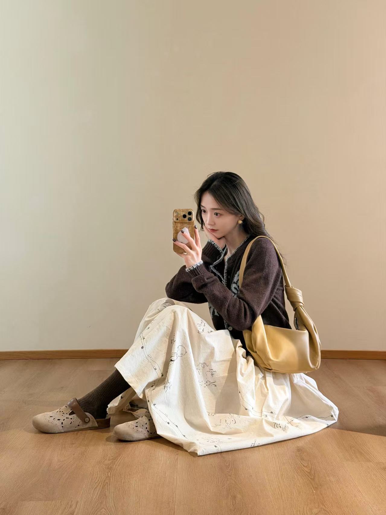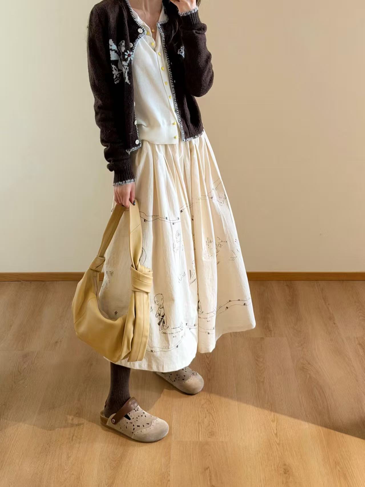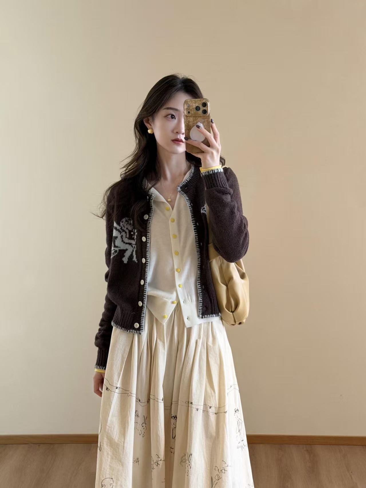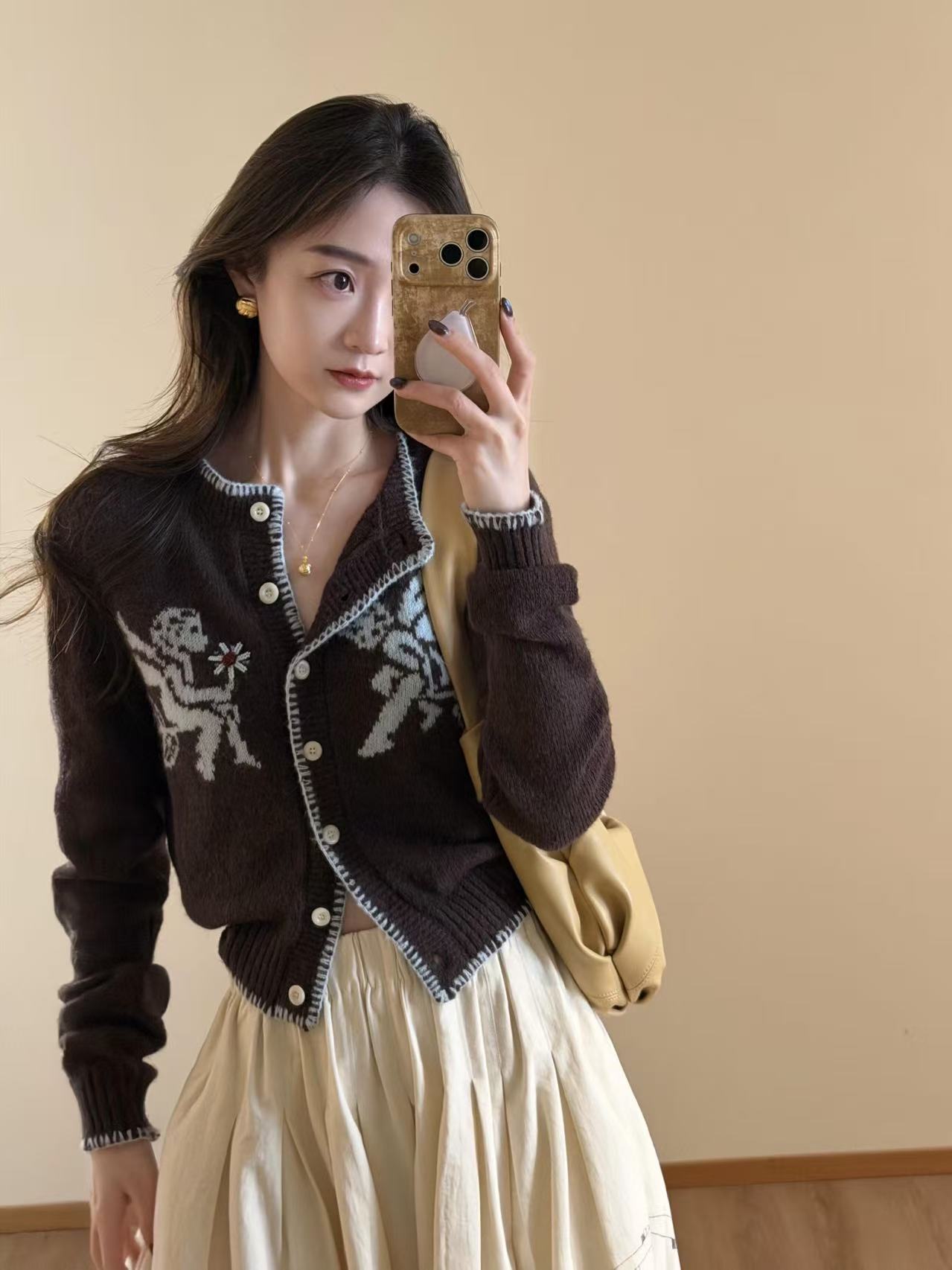 2026早春新款美拉德咖色针织开衫丘比特提花慵懒风毛衣卡通半身裙