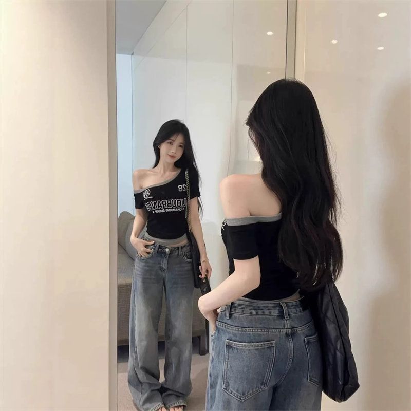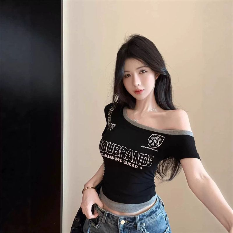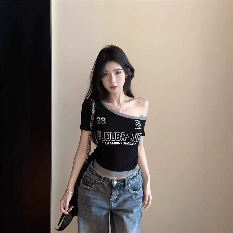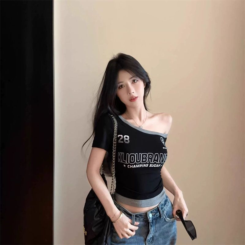 已出货 斜肩拼色假两件短袖T恤女美式修身显瘦短款上衣