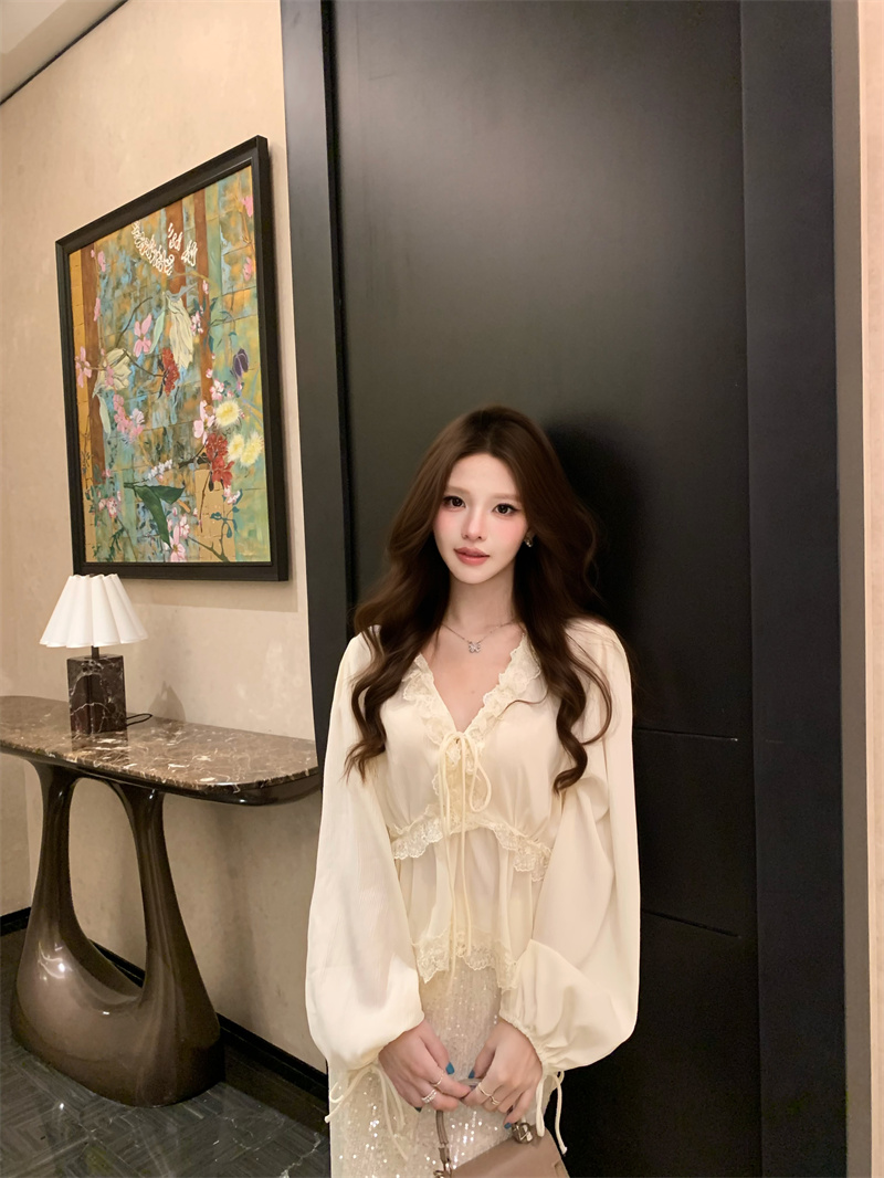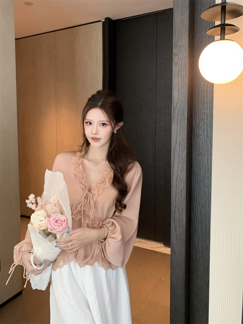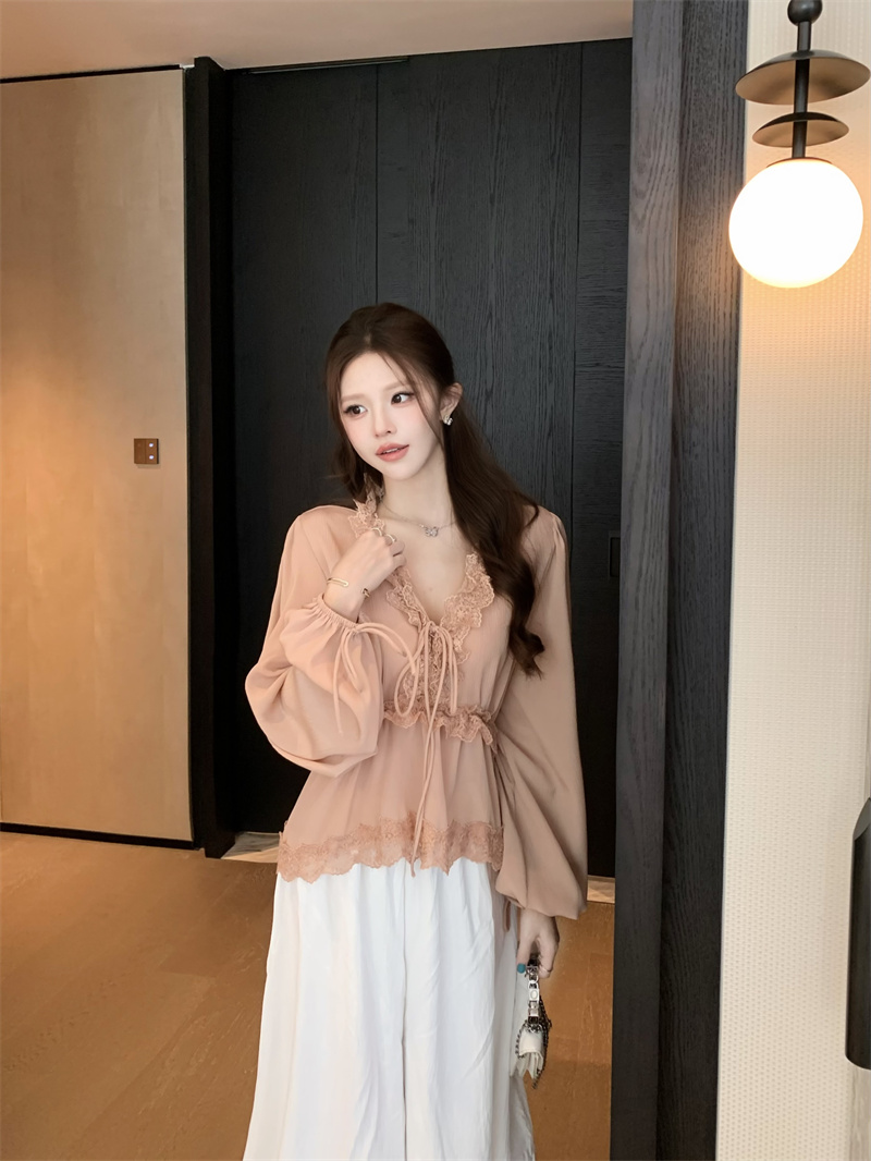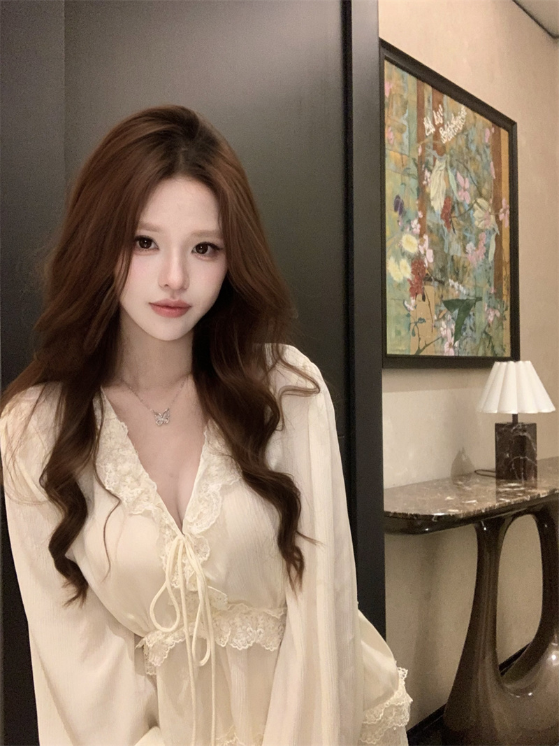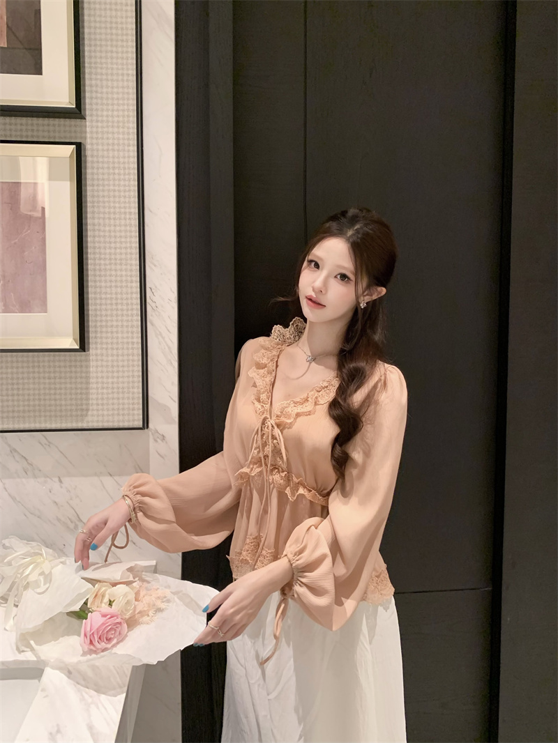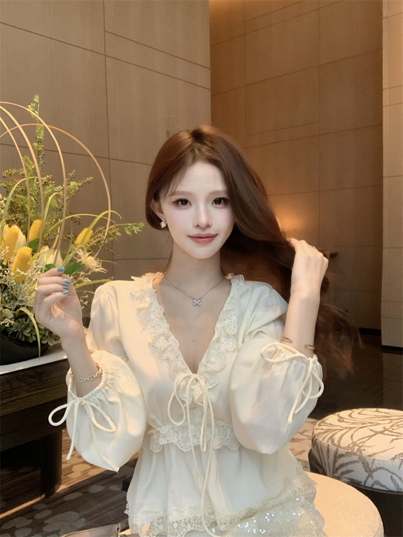 实价实拍~莱赛尔混纺肌理感灯笼袖上衣女轻薄透气防晒蕾丝小衫女
