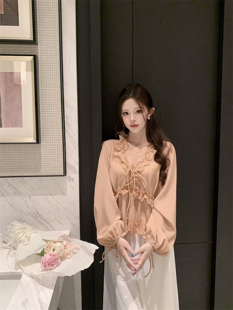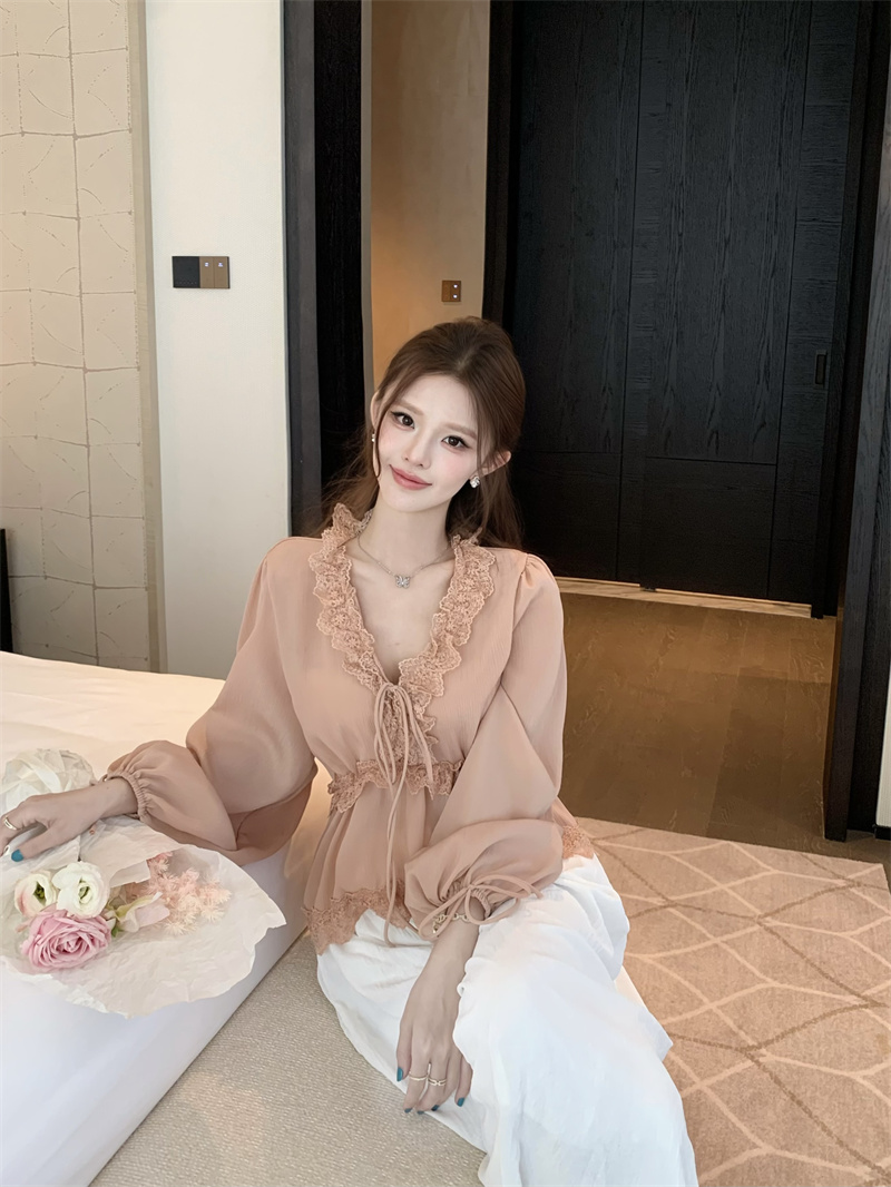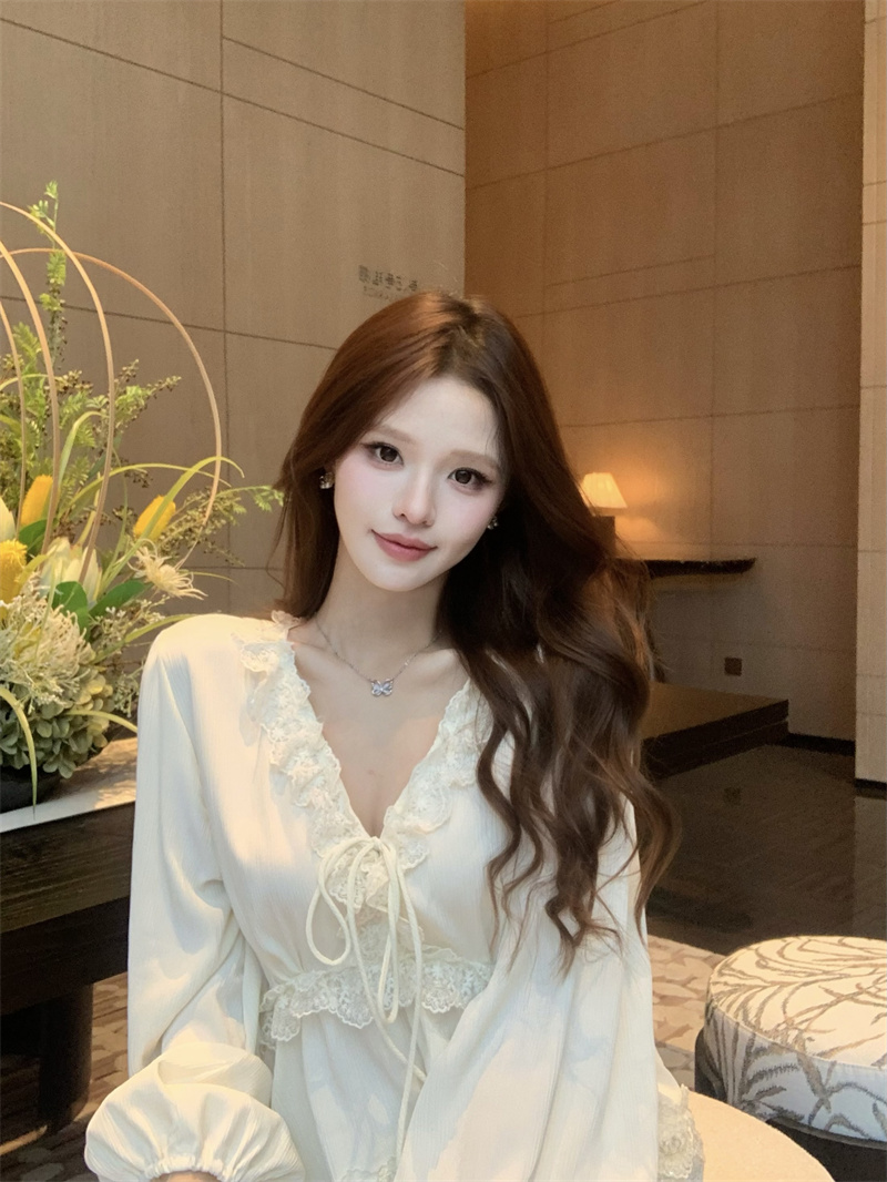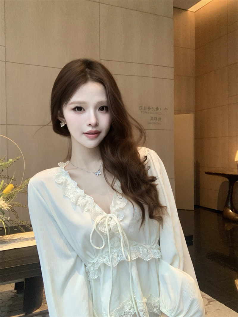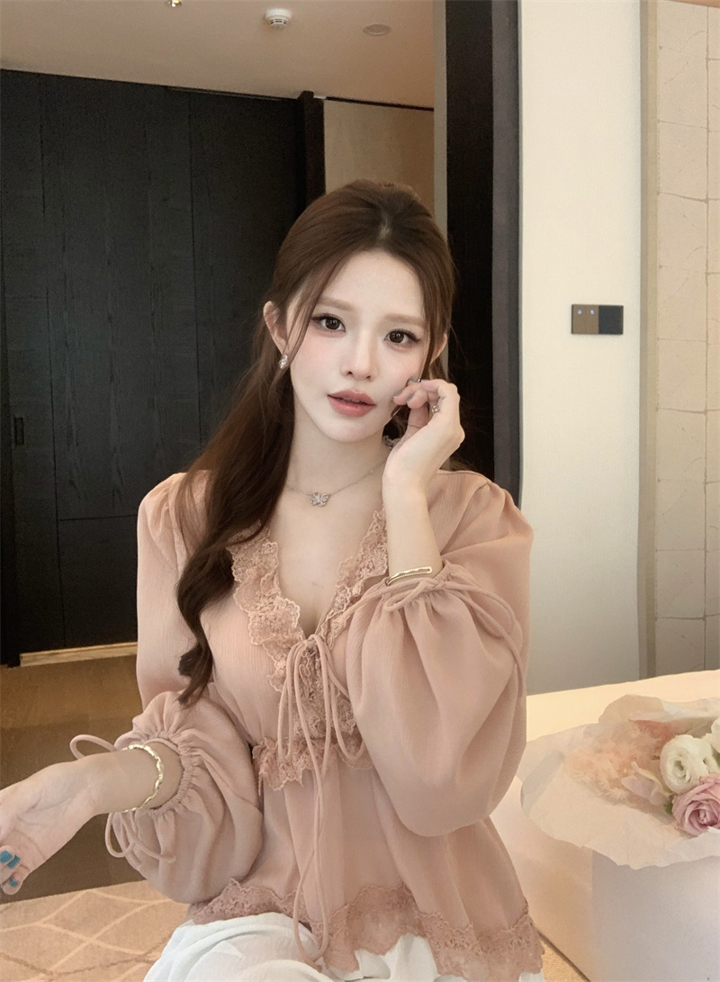 实价实拍~莱赛尔混纺肌理感灯笼袖上衣女轻薄透气防晒蕾丝小衫女