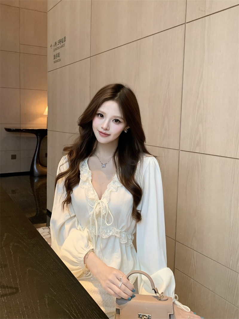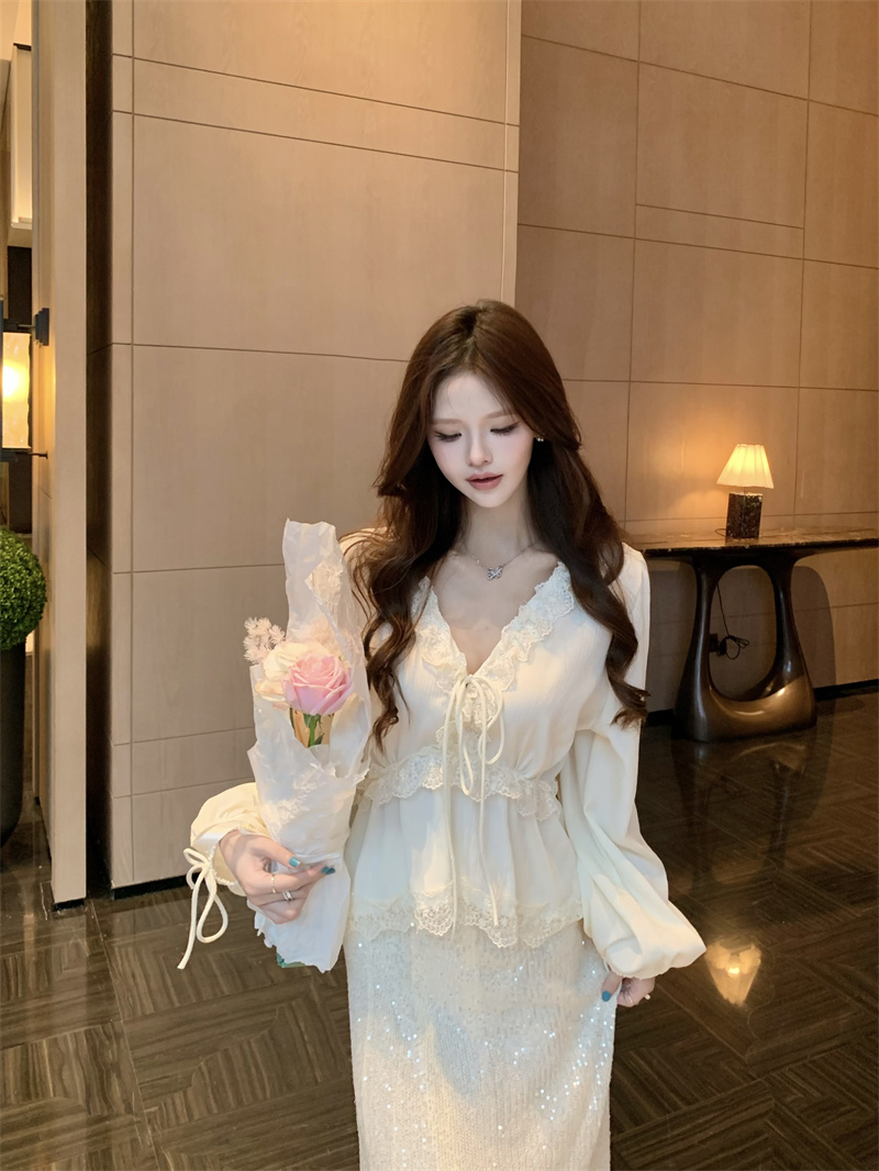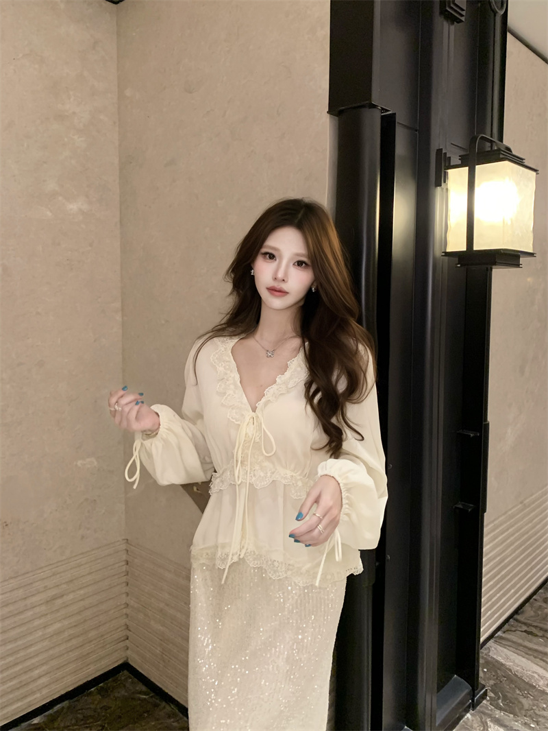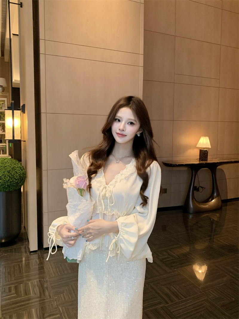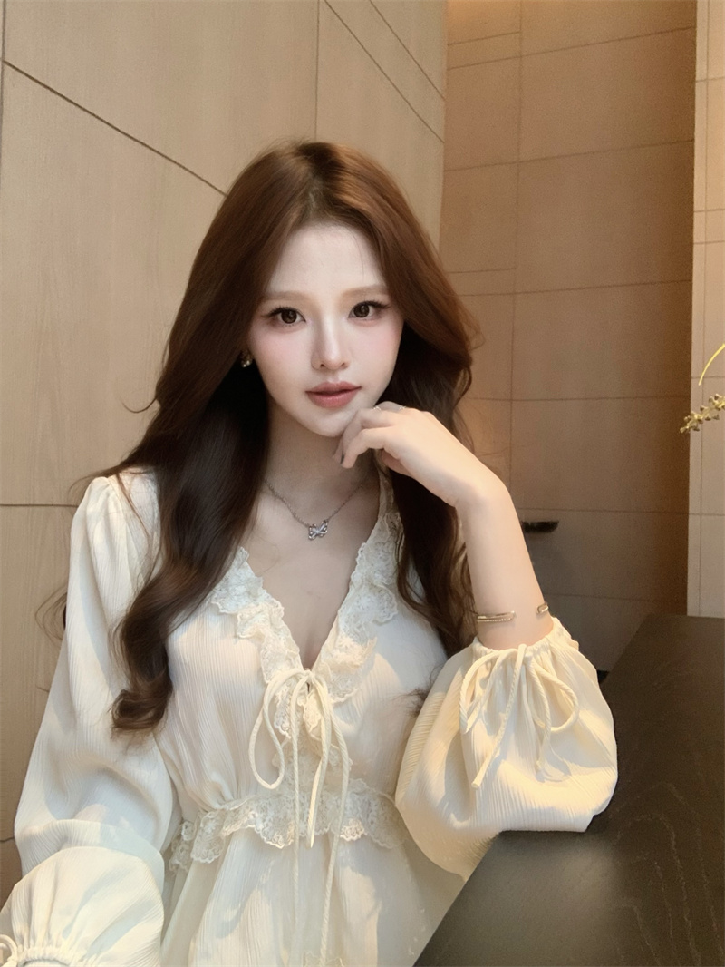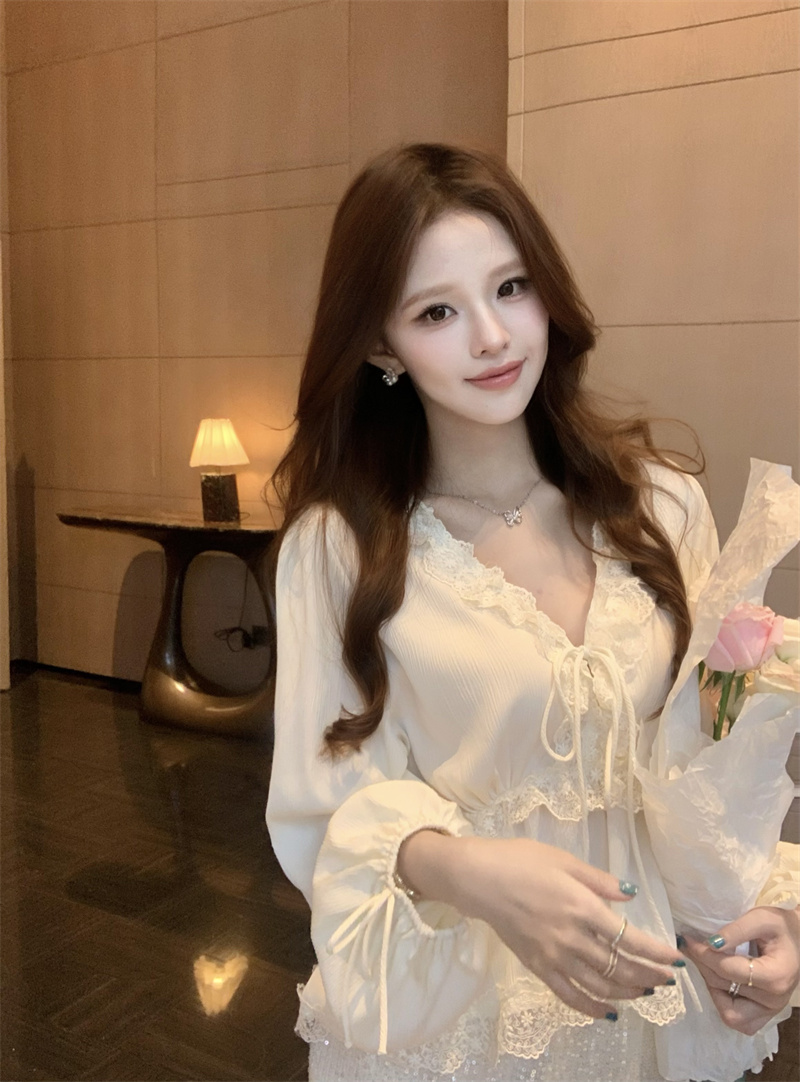 实价实拍~莱赛尔混纺肌理感灯笼袖上衣女轻薄透气防晒蕾丝小衫女