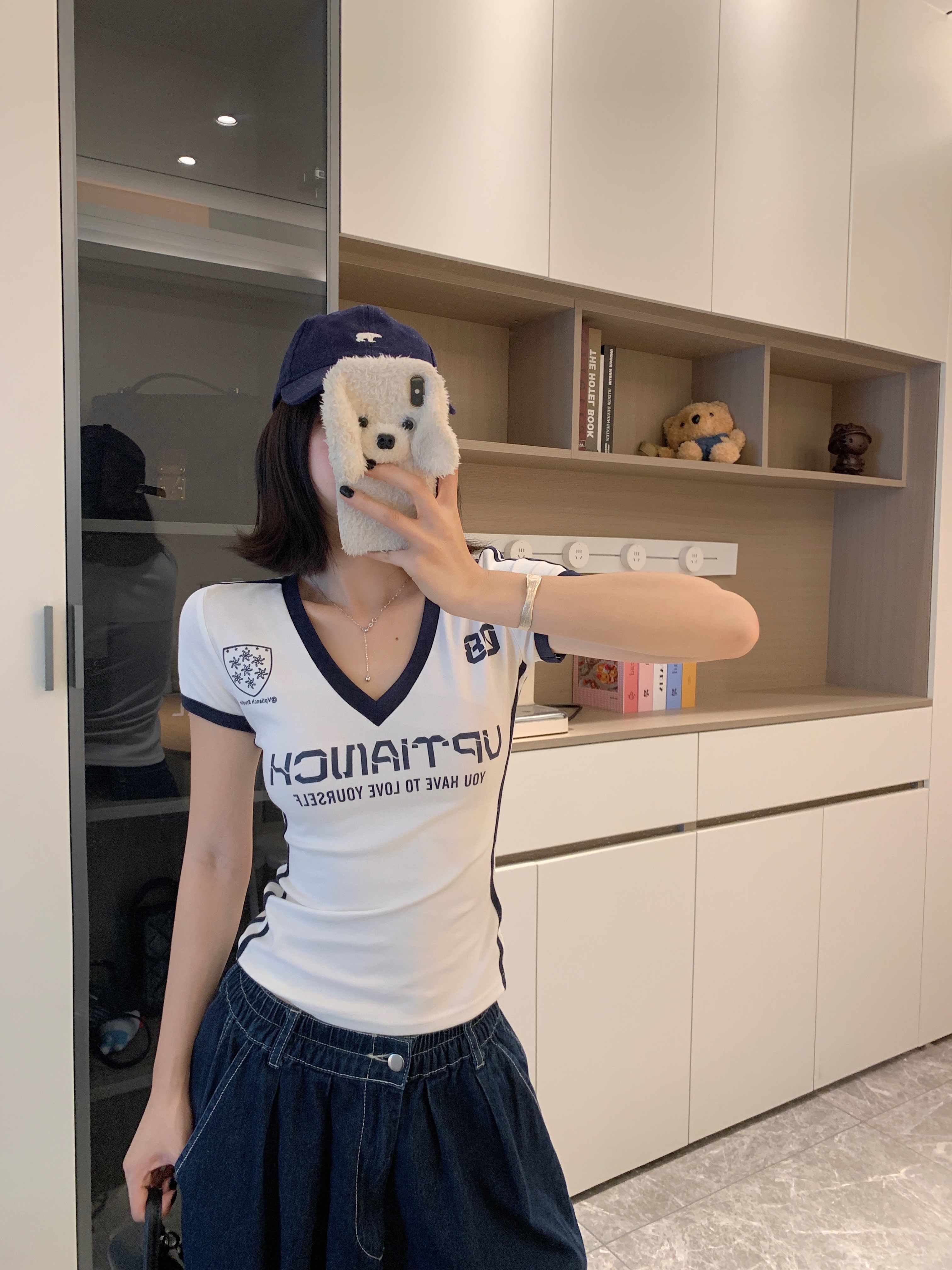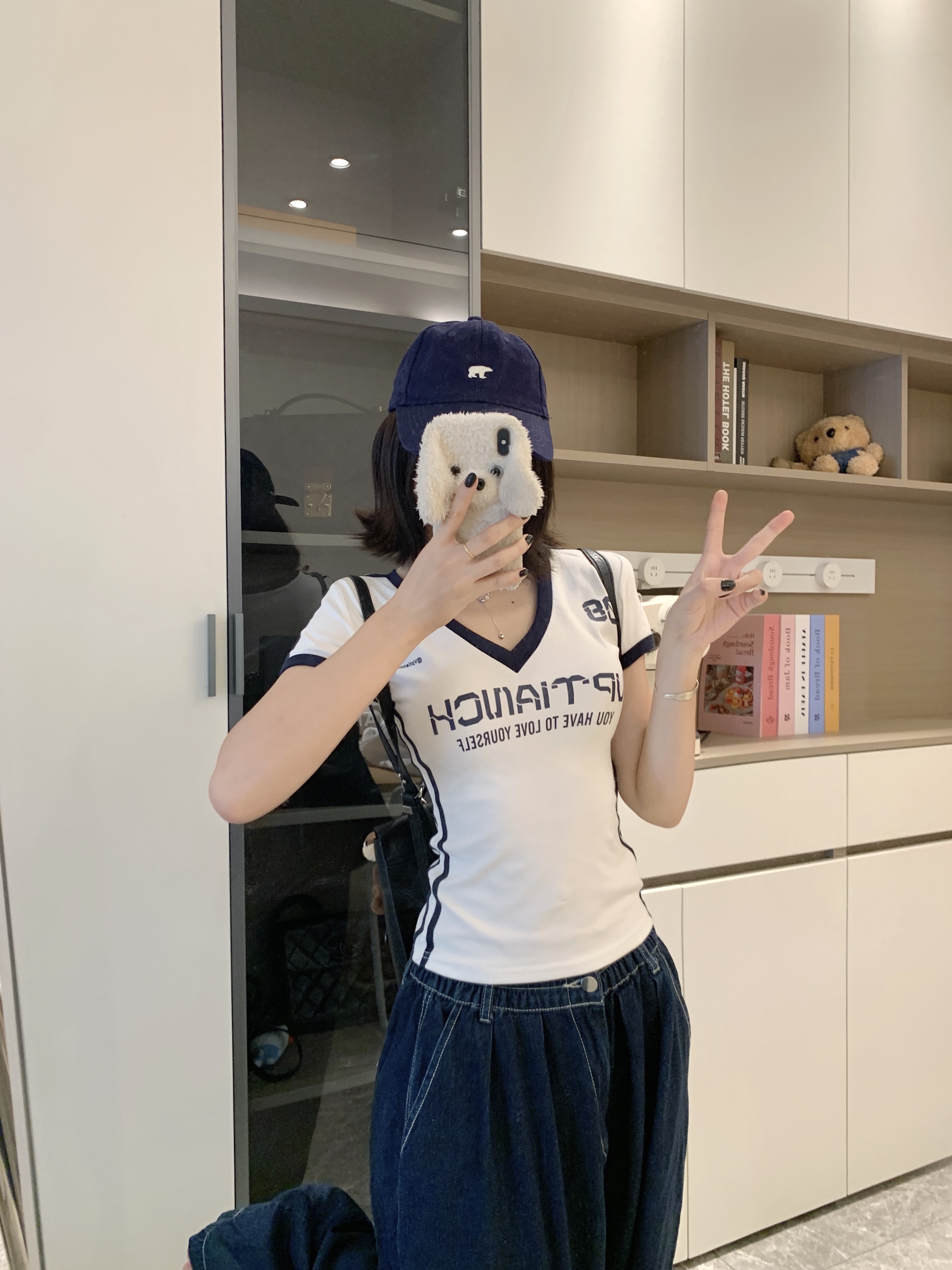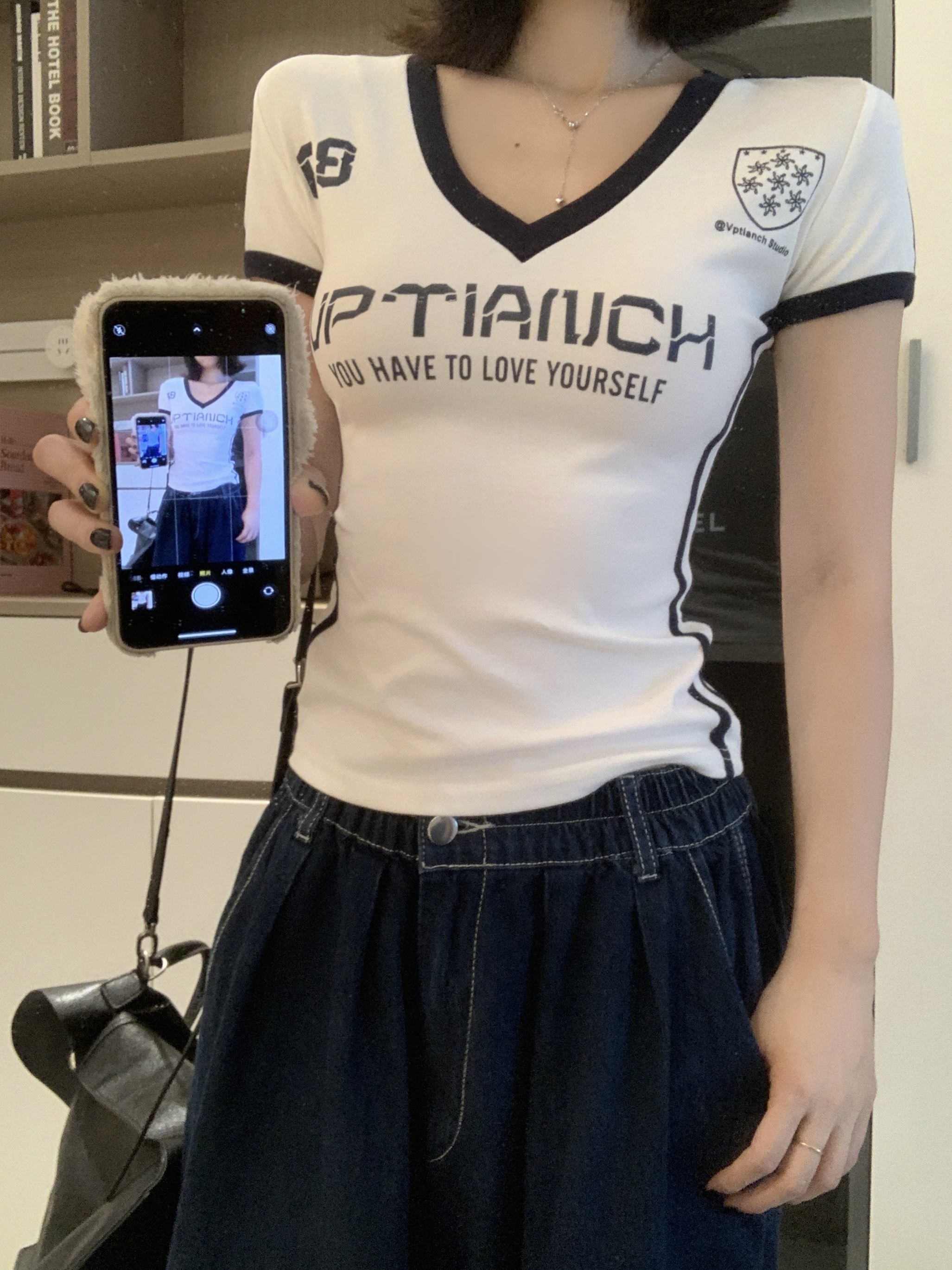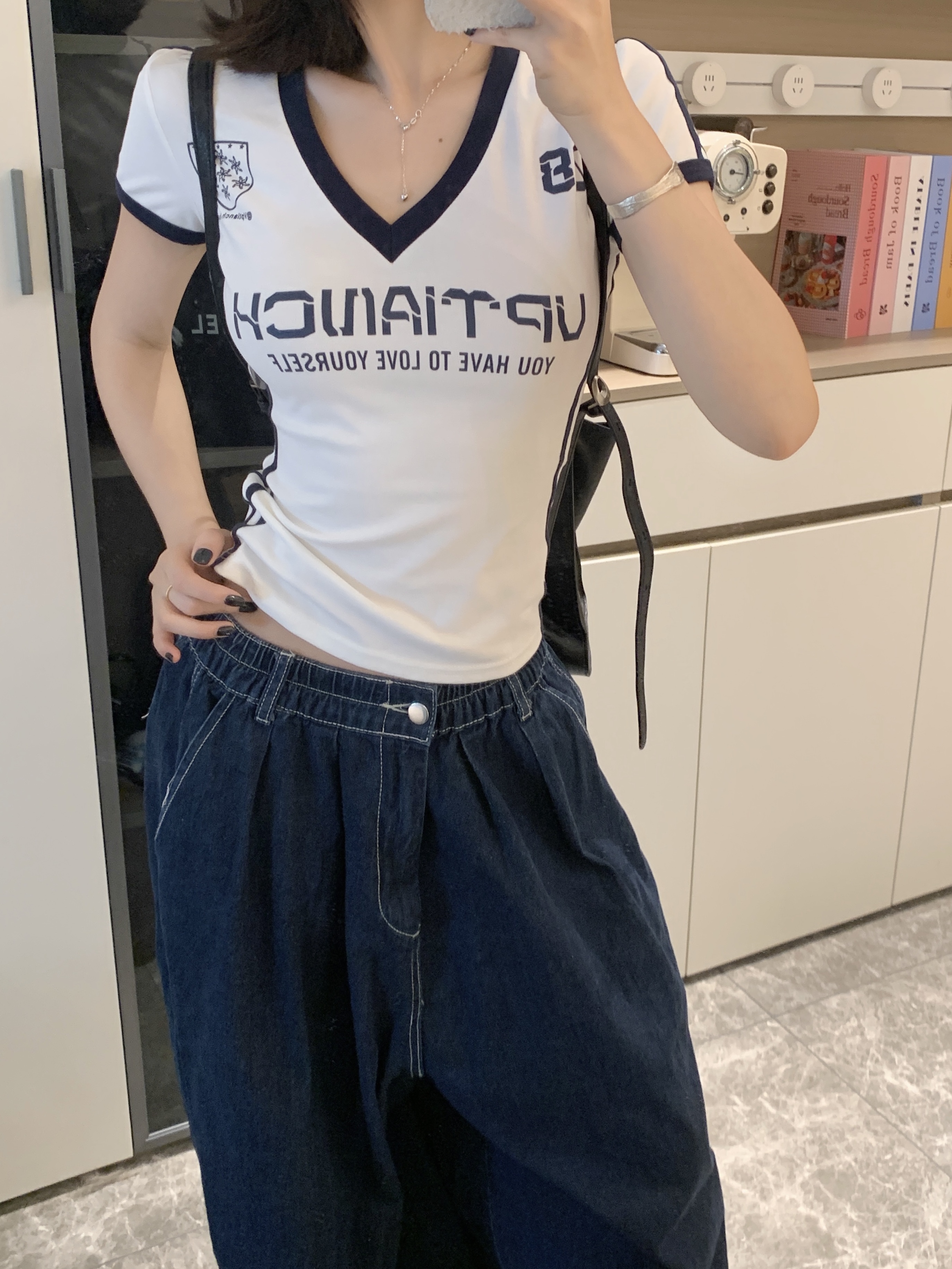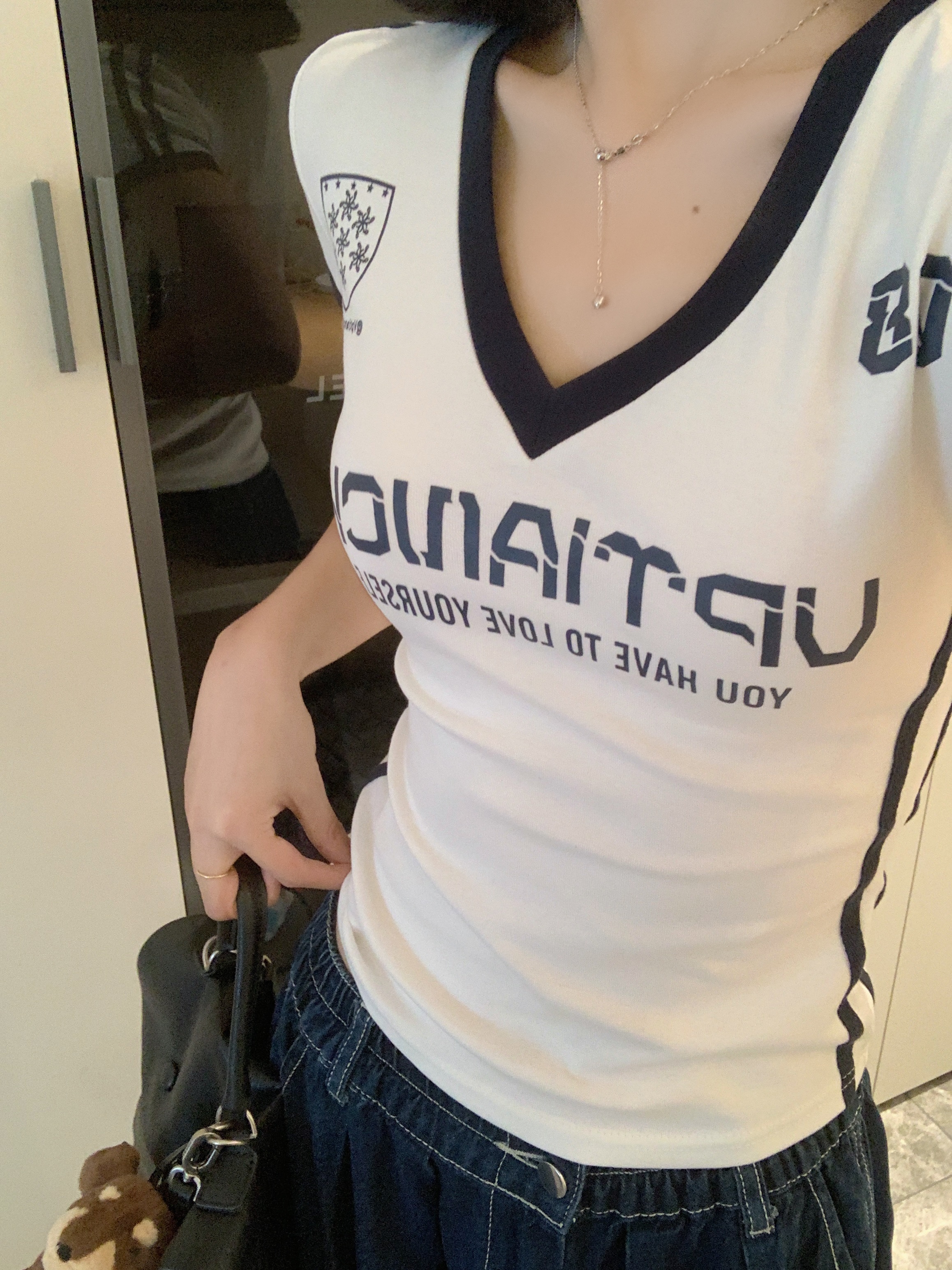 实拍 大码胖MM美式辣妹球衣V领短袖修身显瘦运动百搭短款上衣