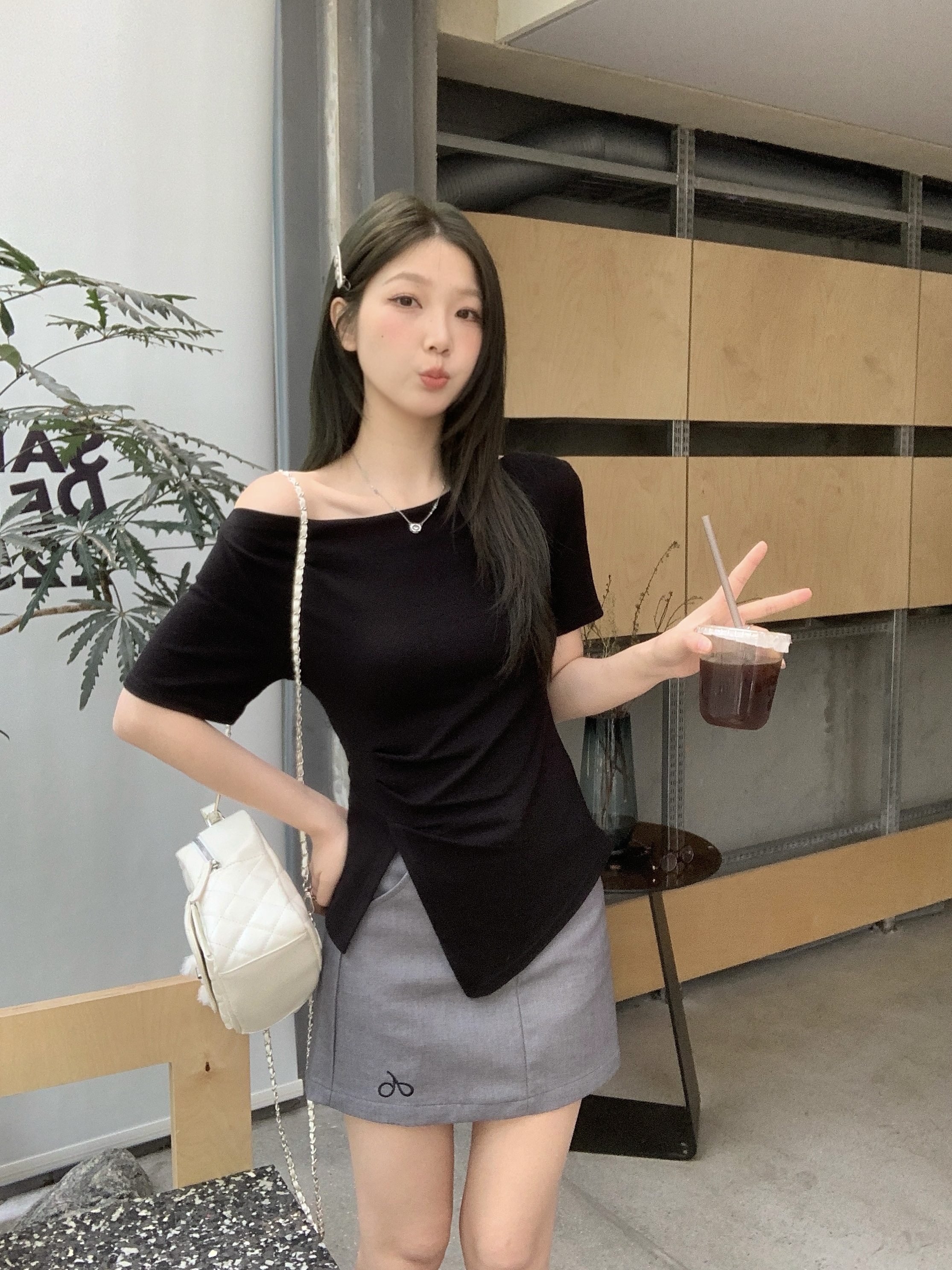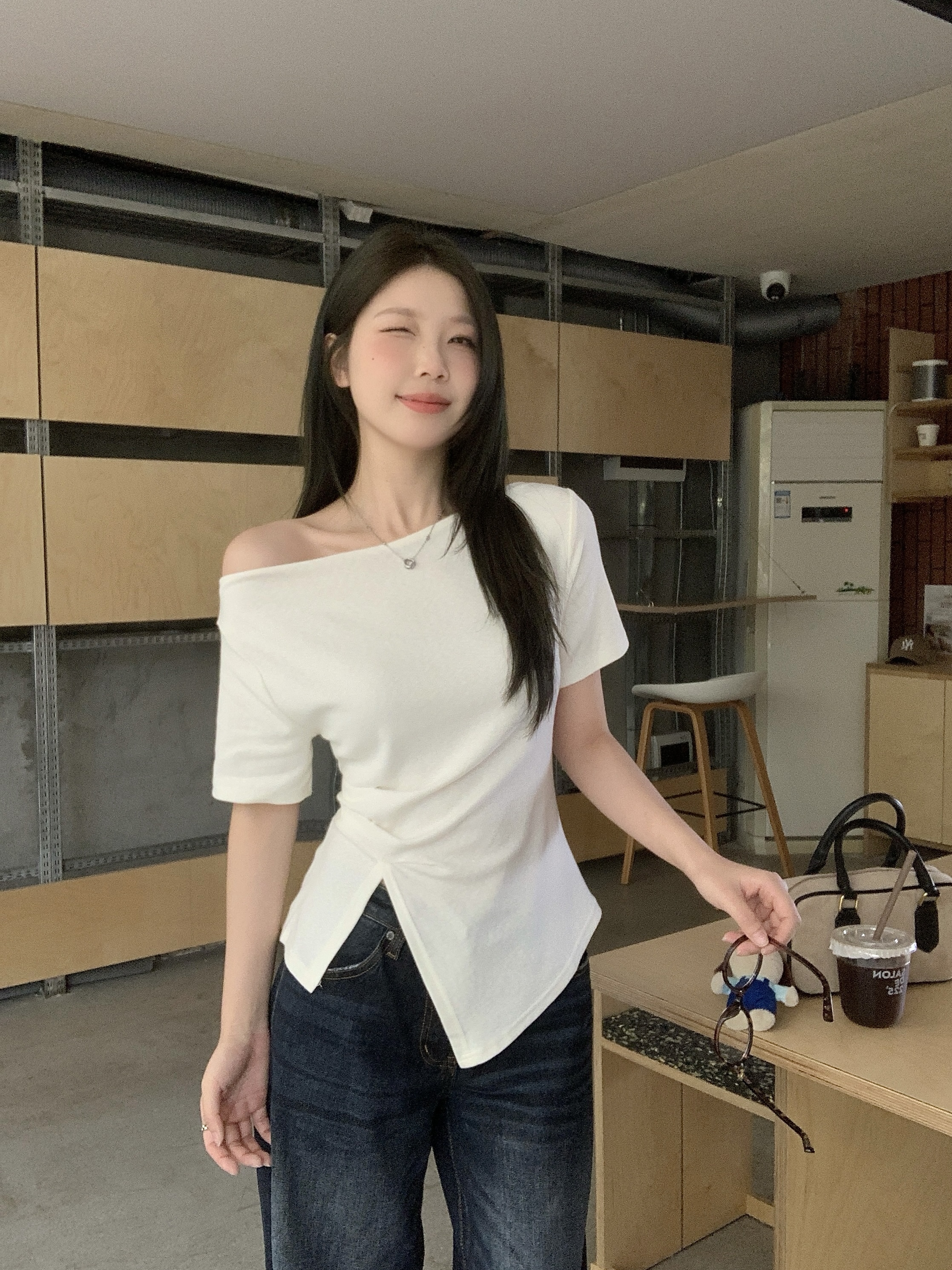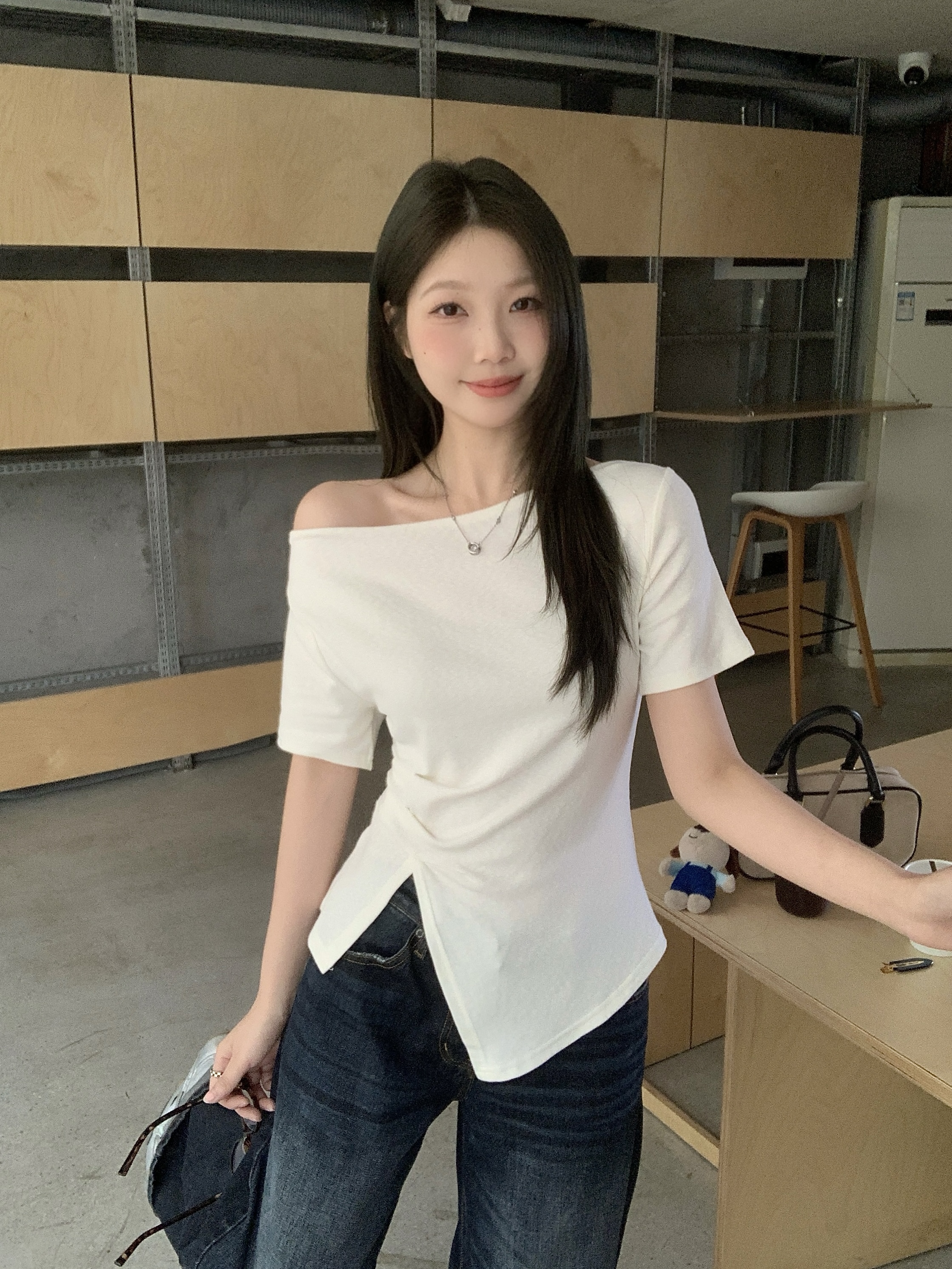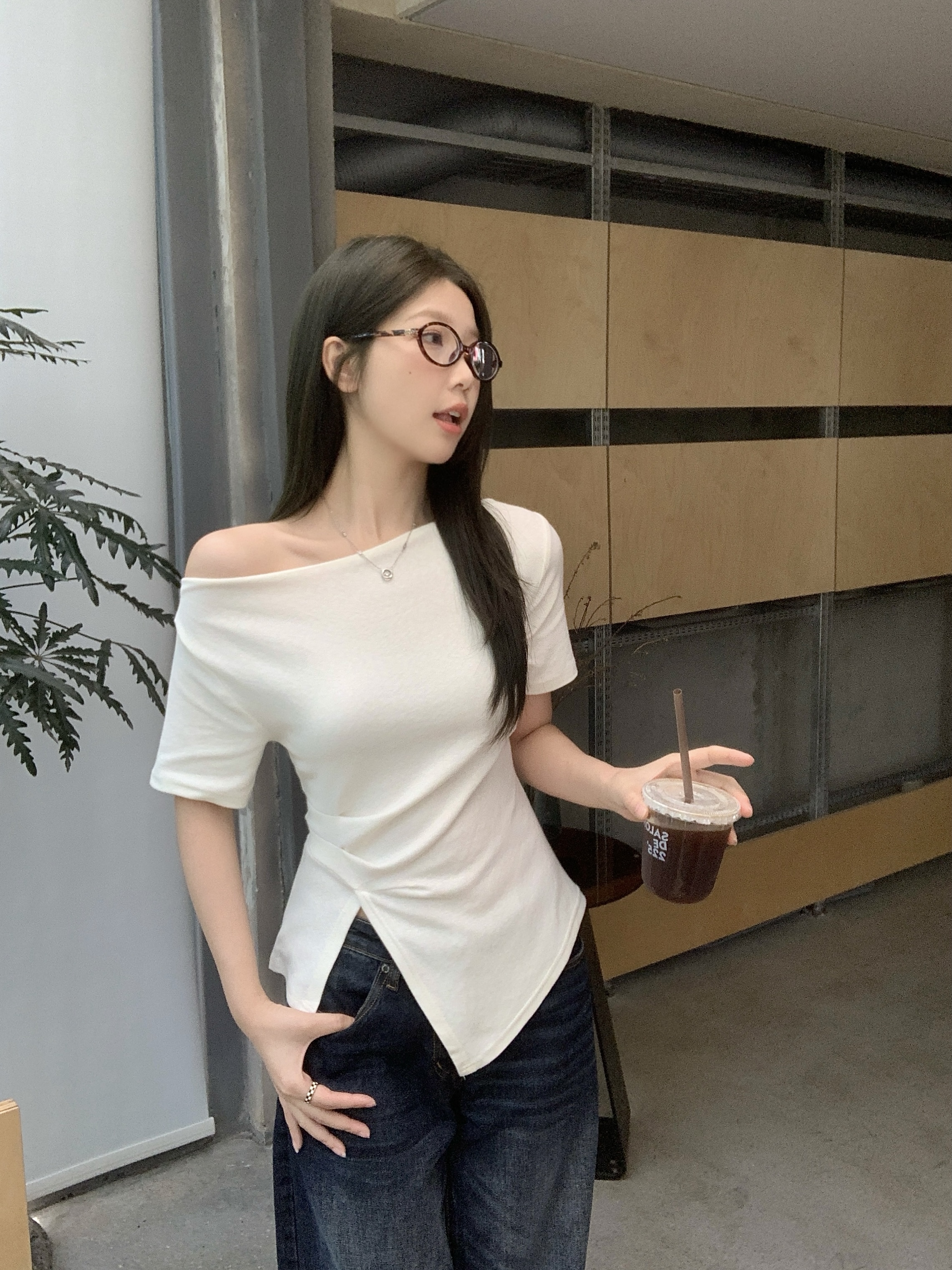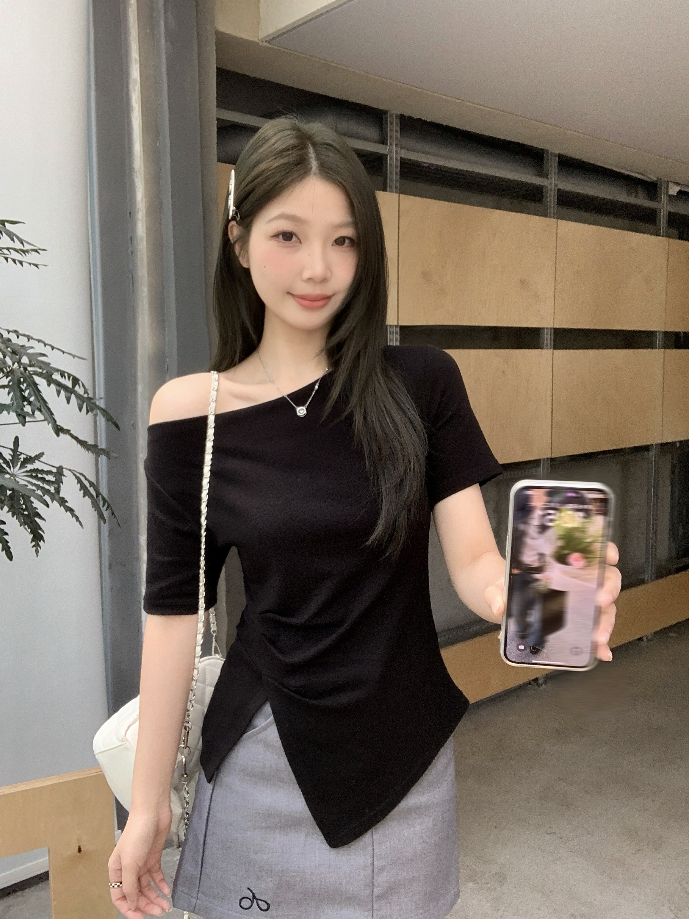 实拍 大码韩版温柔风绝美露肩荡领不规则上衣收腰遮肚显瘦T恤