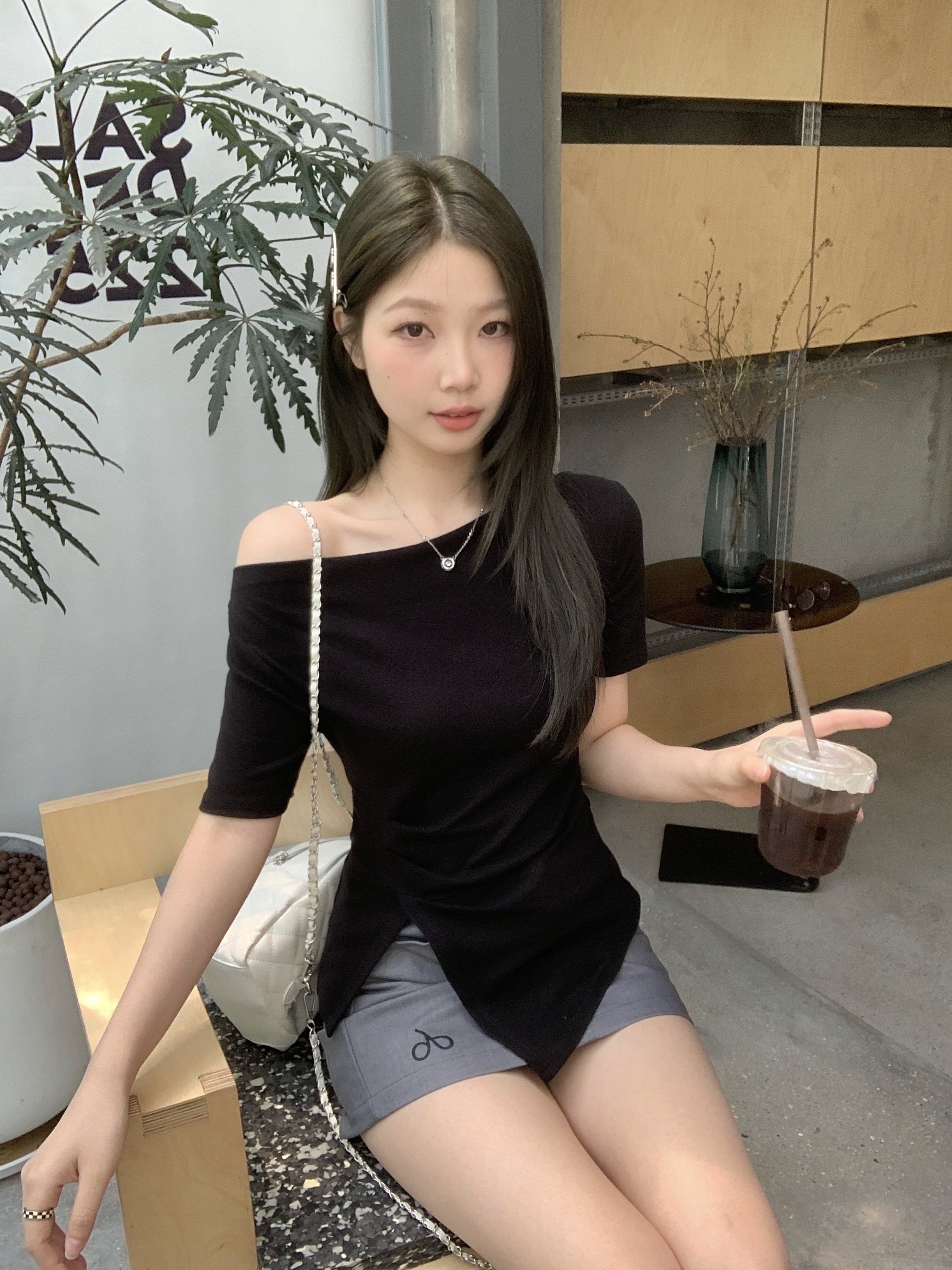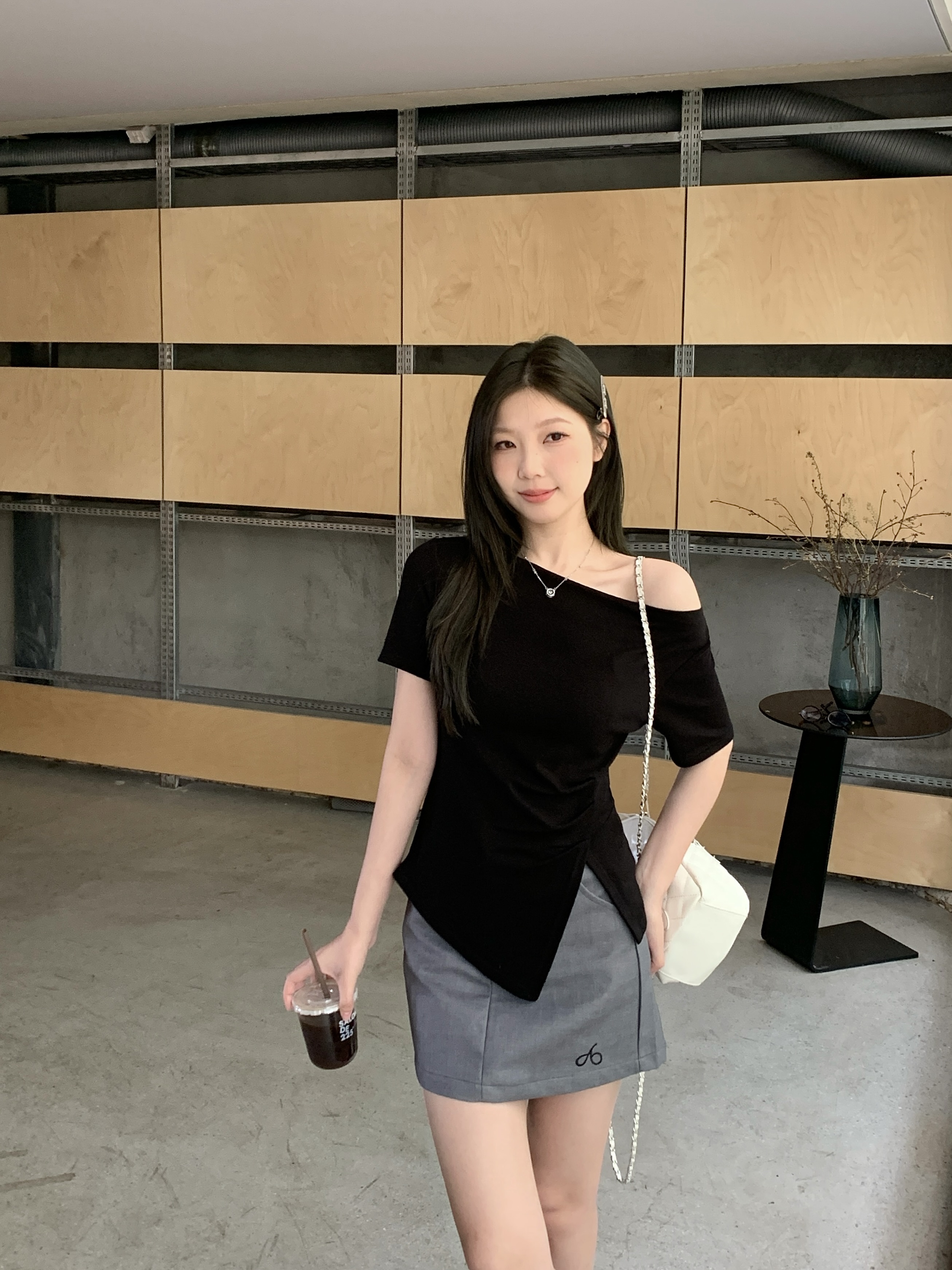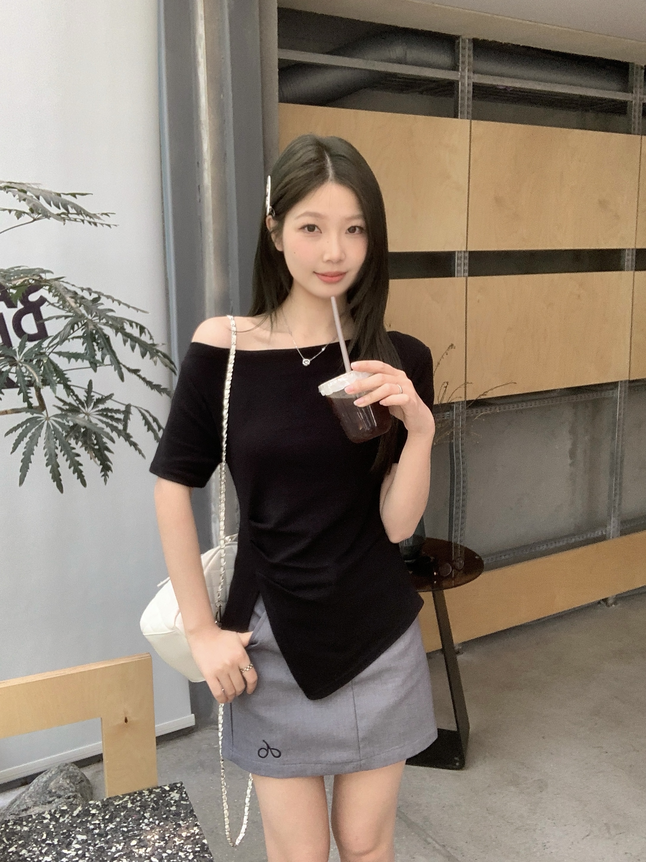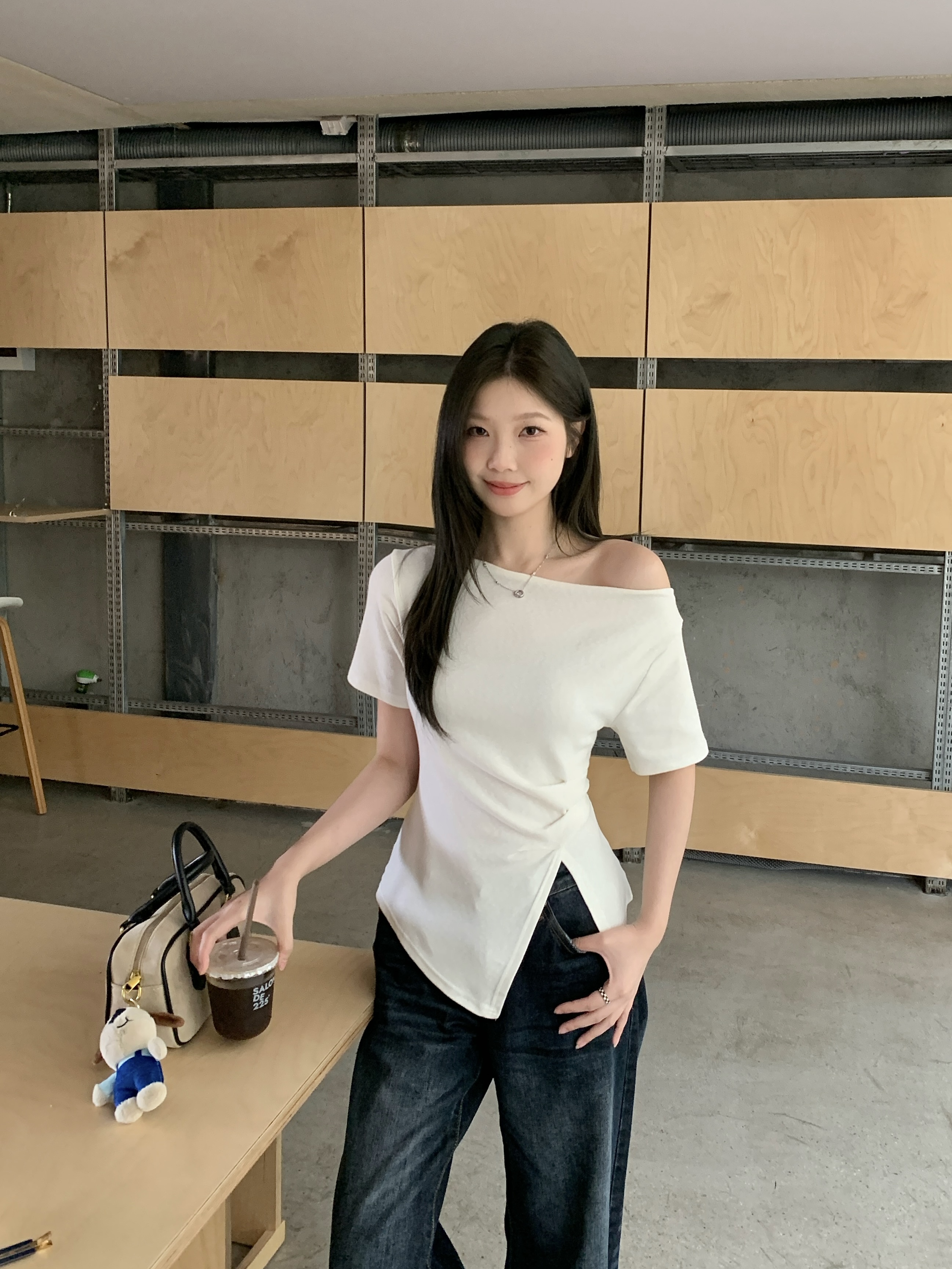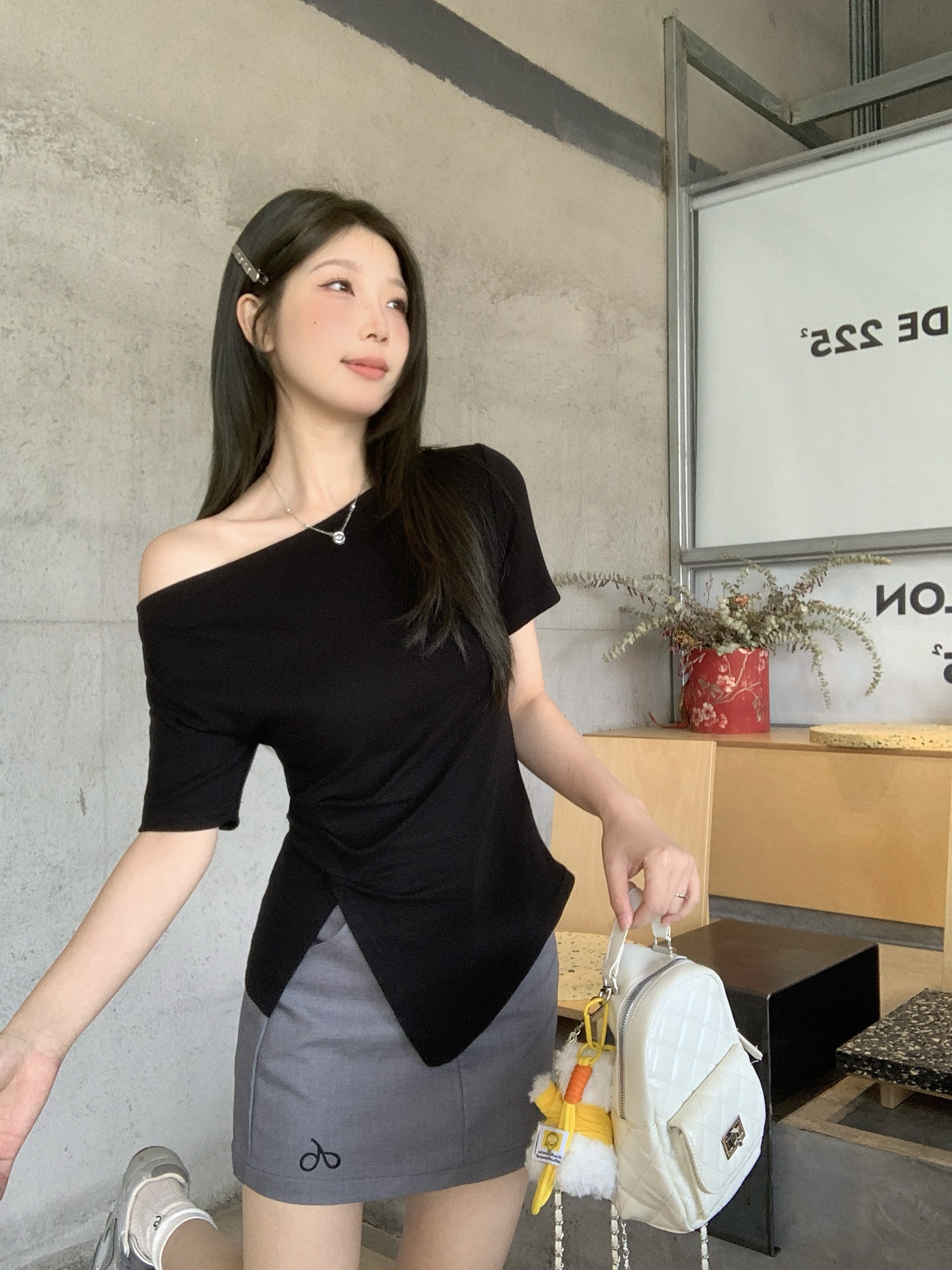 实拍 大码韩版温柔风绝美露肩荡领不规则上衣收腰遮肚显瘦T恤