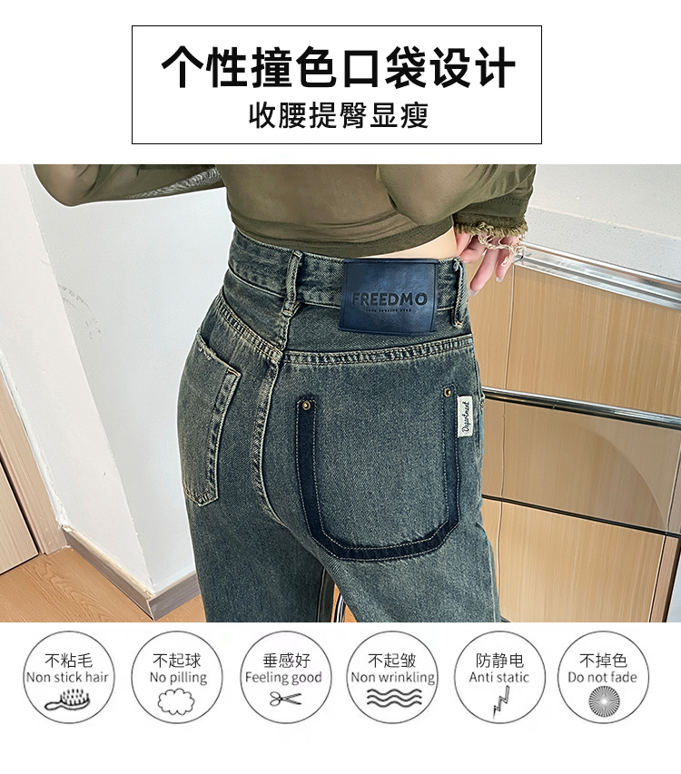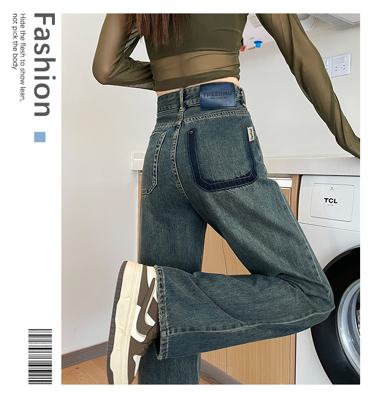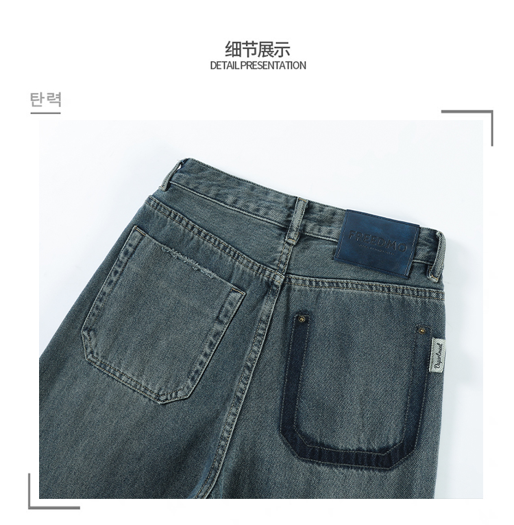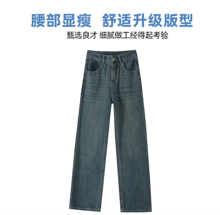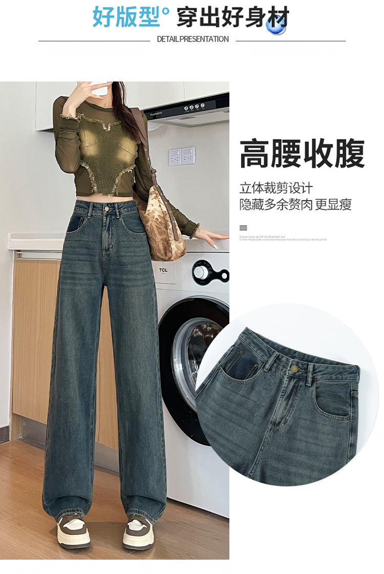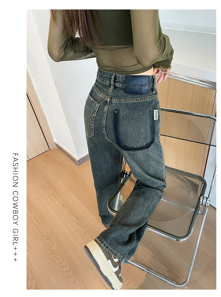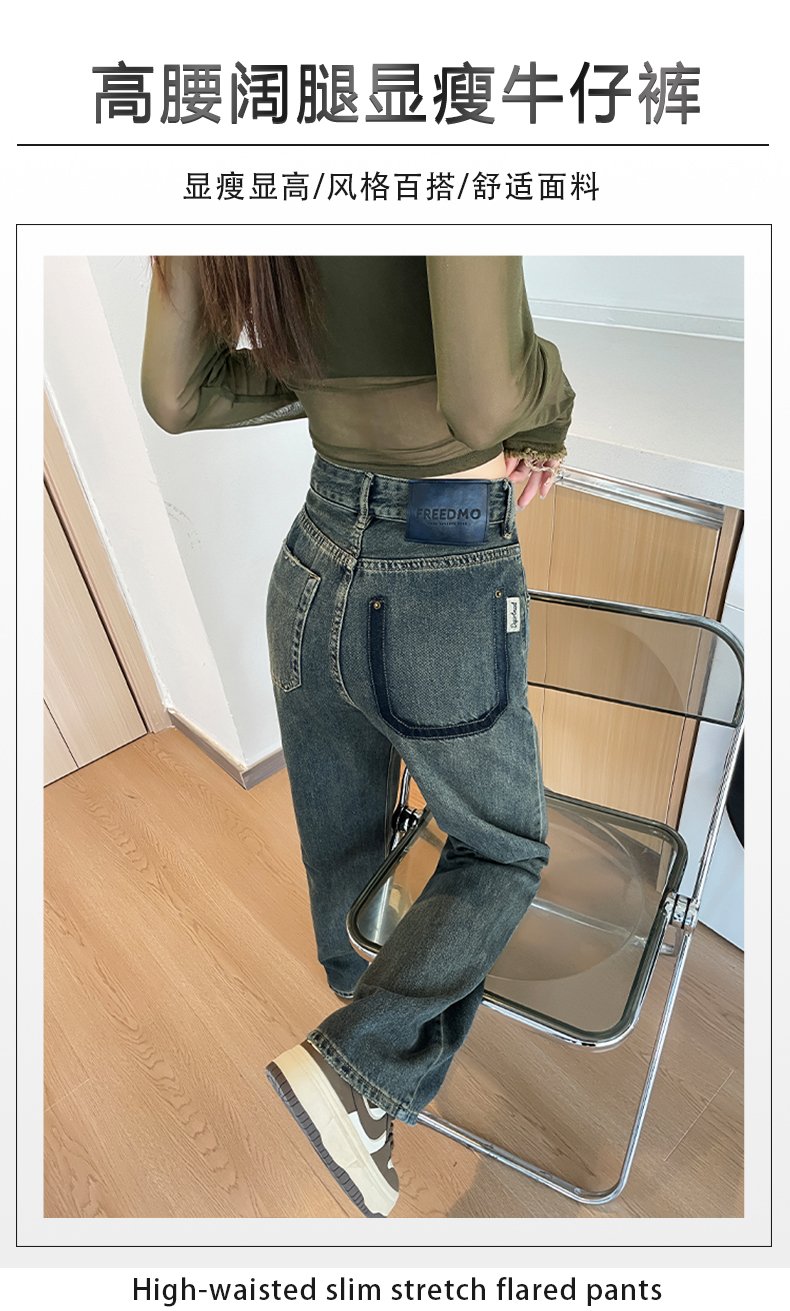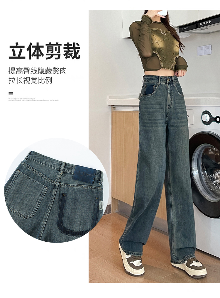 U字型口袋水泥灰阔腿牛仔裤女撞色复古春夏高腰窄版宽松窄版直筒