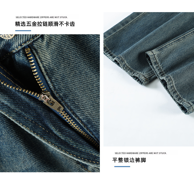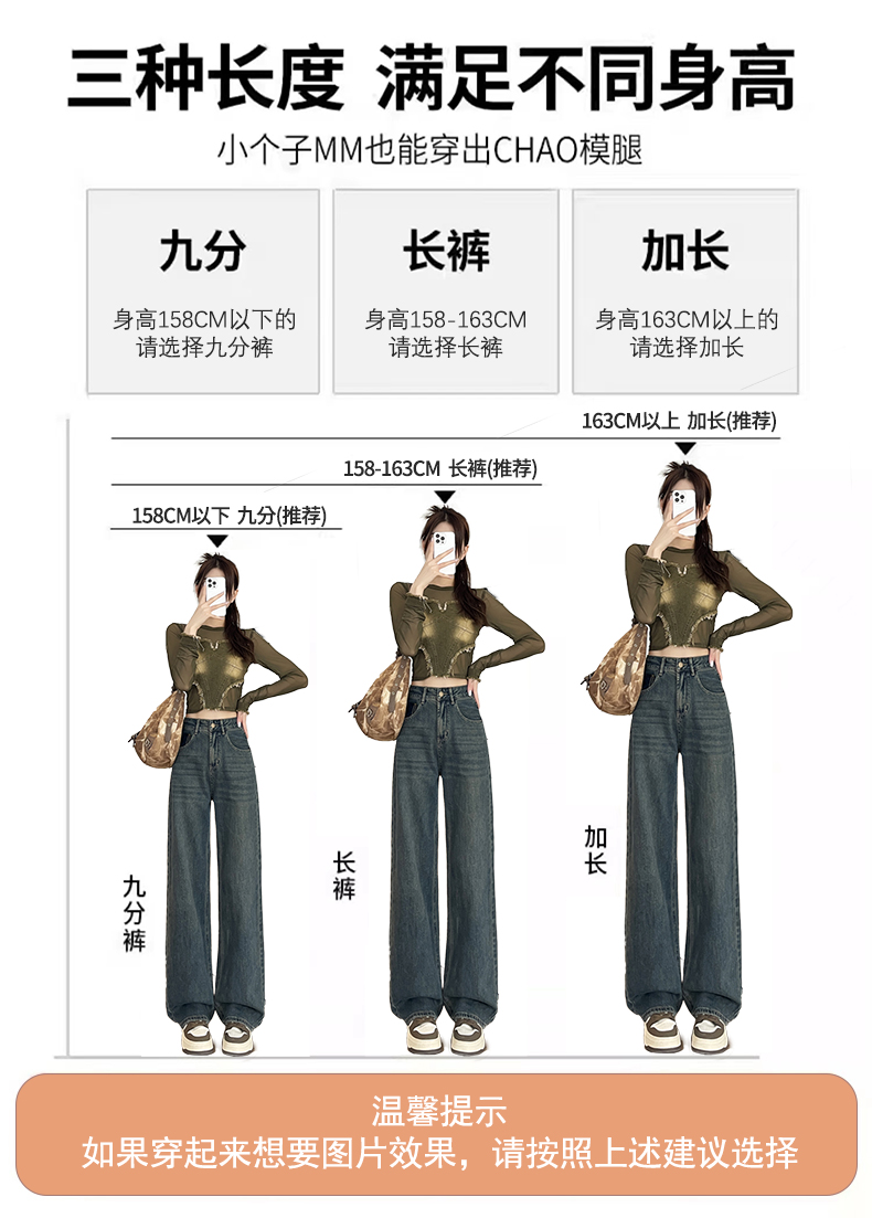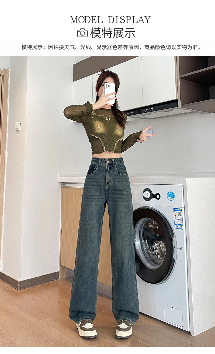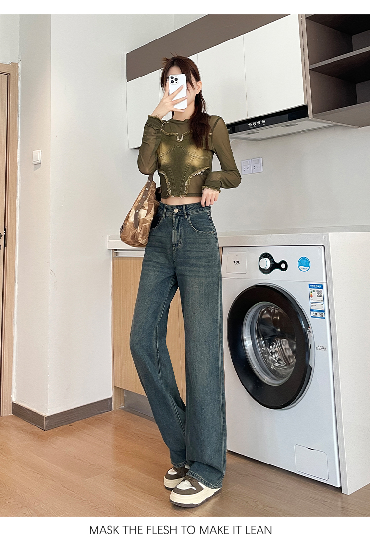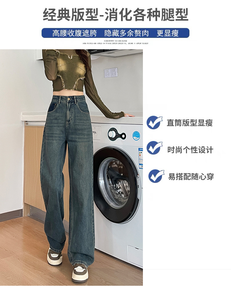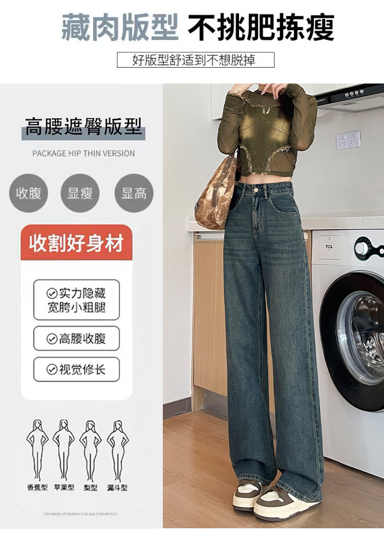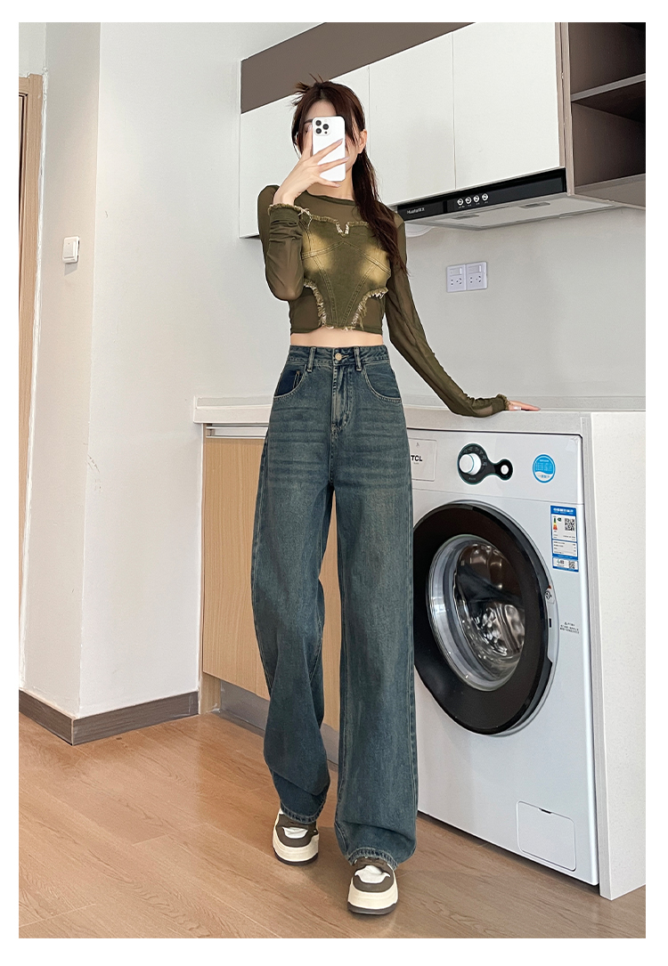 U字型口袋水泥灰阔腿牛仔裤女撞色复古春夏高腰窄版宽松窄版直筒
