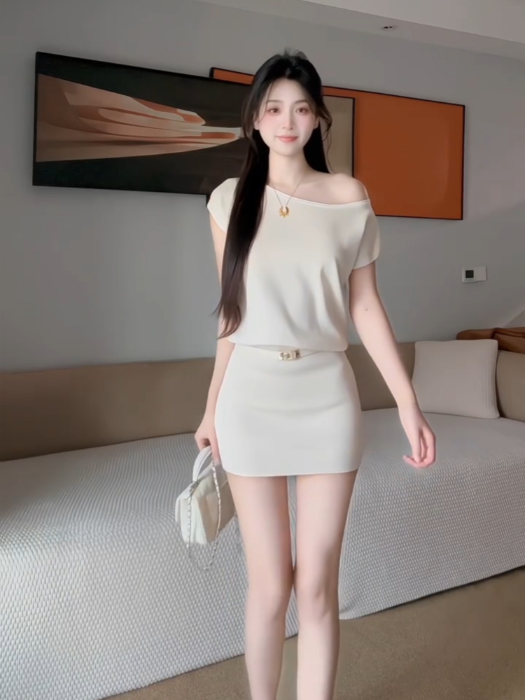 已出货 一字肩针织连衣裙女春季设计感收腰修身气质斜肩短裙子