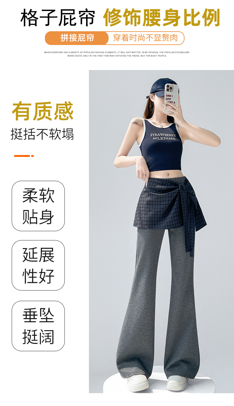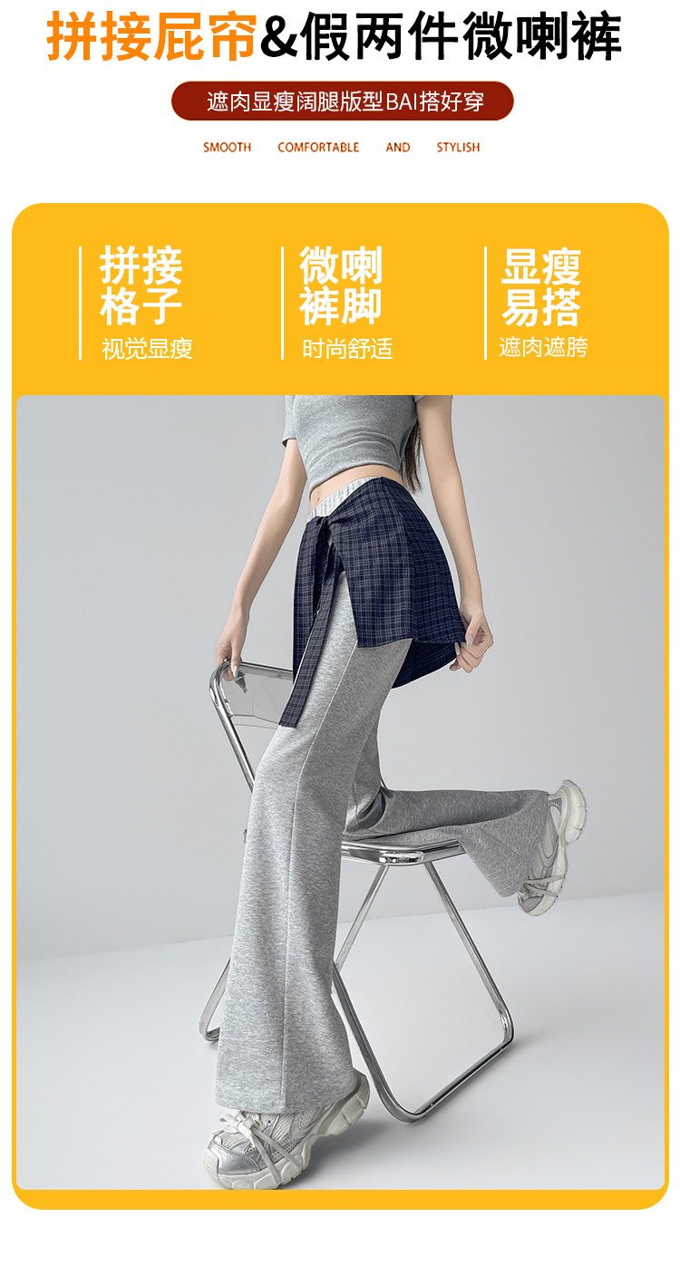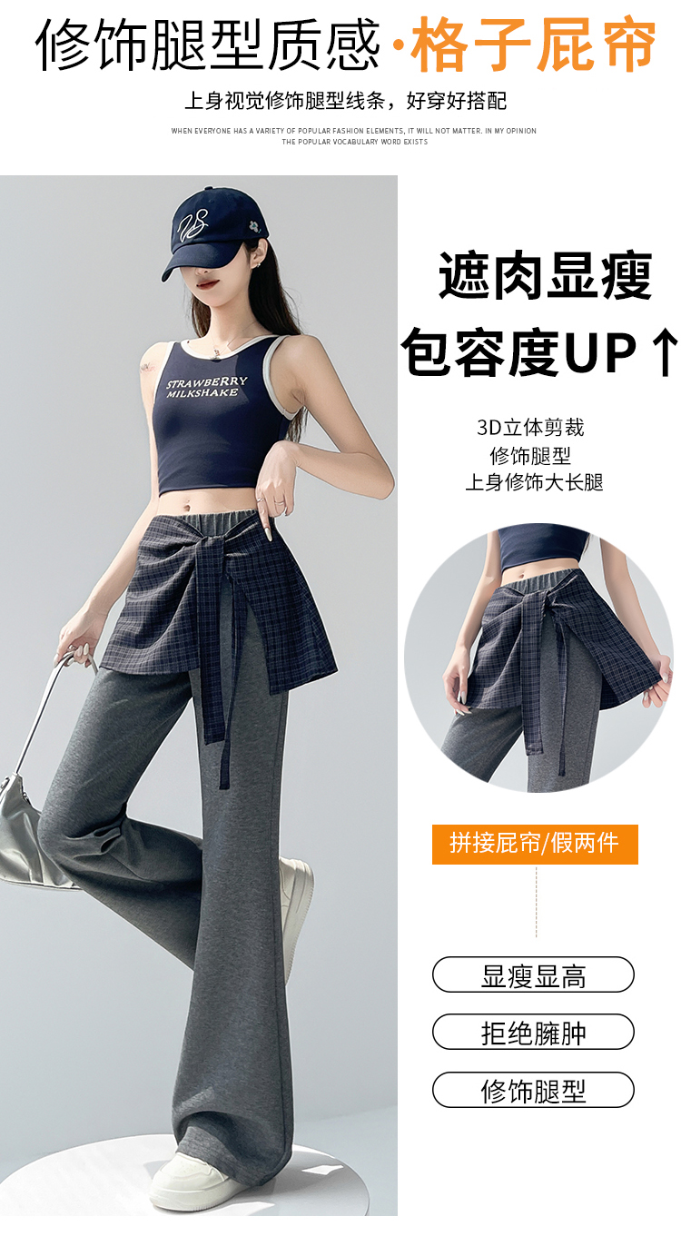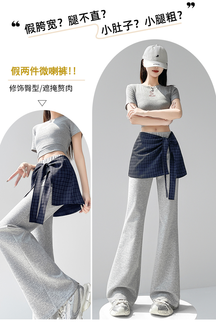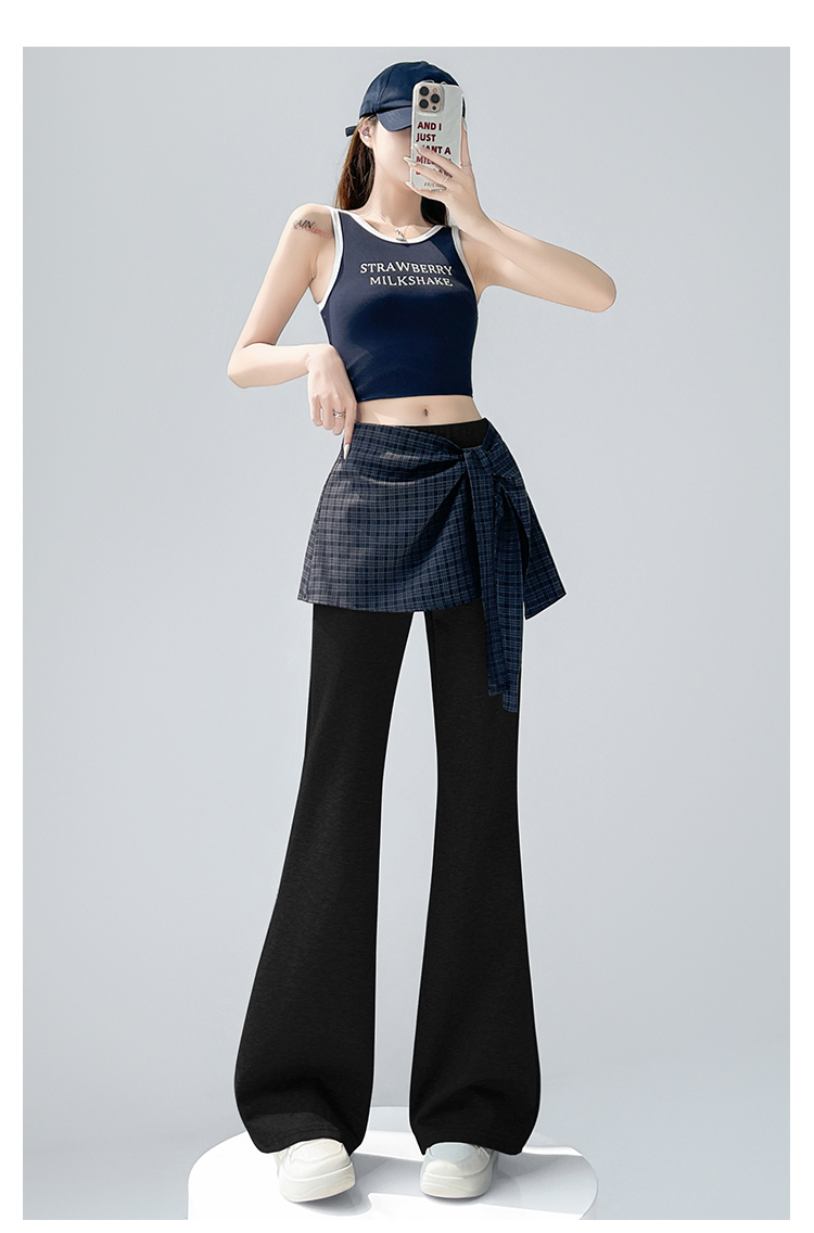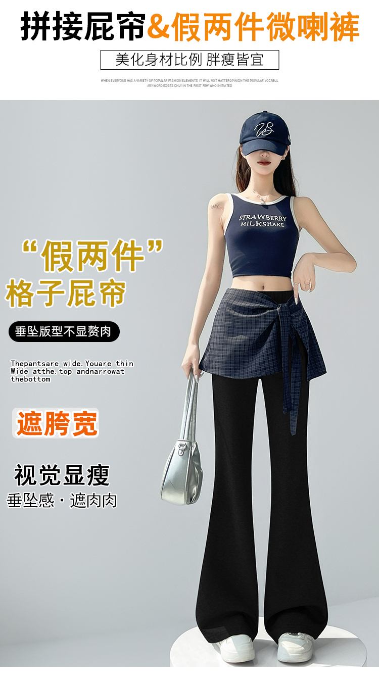 假两件格纹屁帘空气棉微喇裤女夏新款高腰显瘦百搭休闲弹力喇叭裤