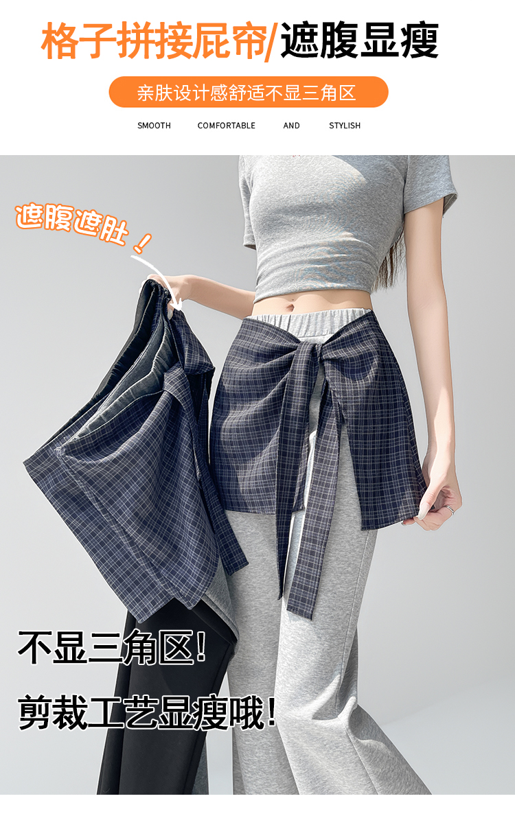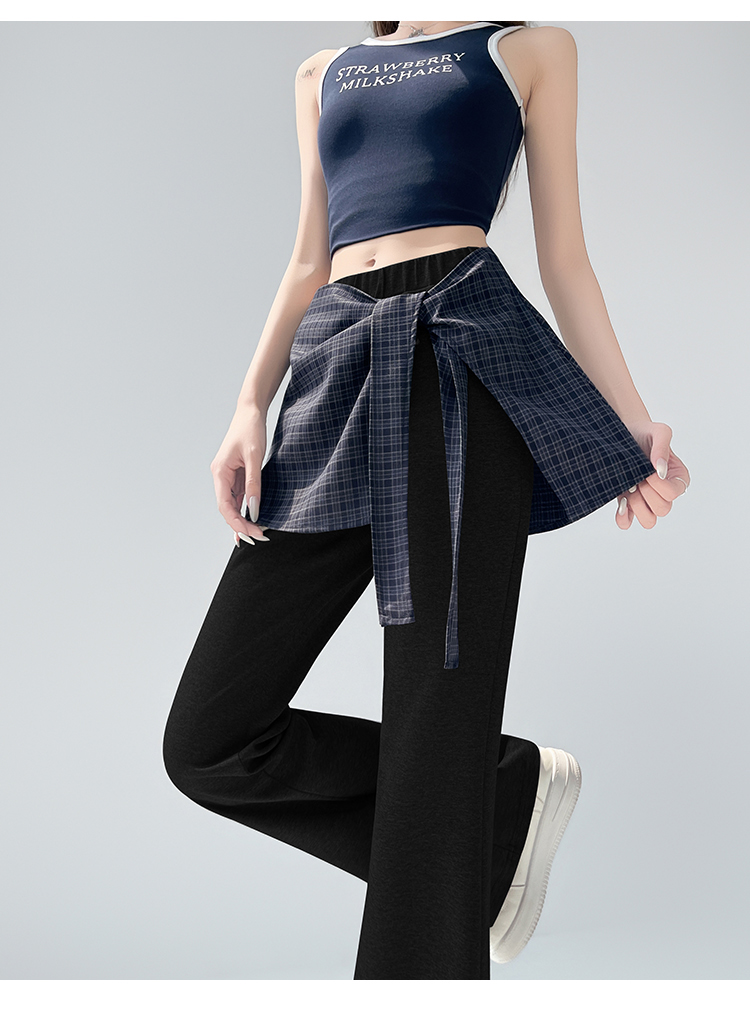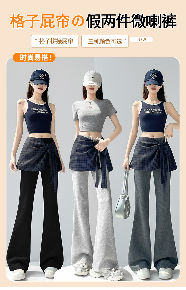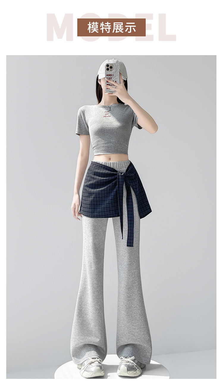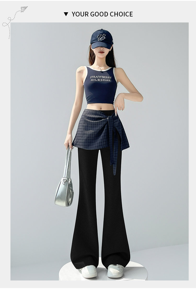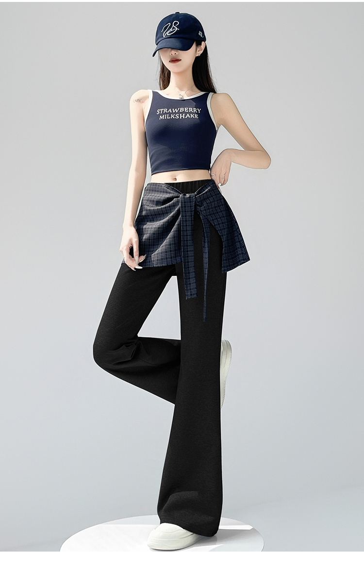假两件格纹屁帘空气棉微喇裤女夏新款高腰显瘦百搭休闲弹力喇叭裤