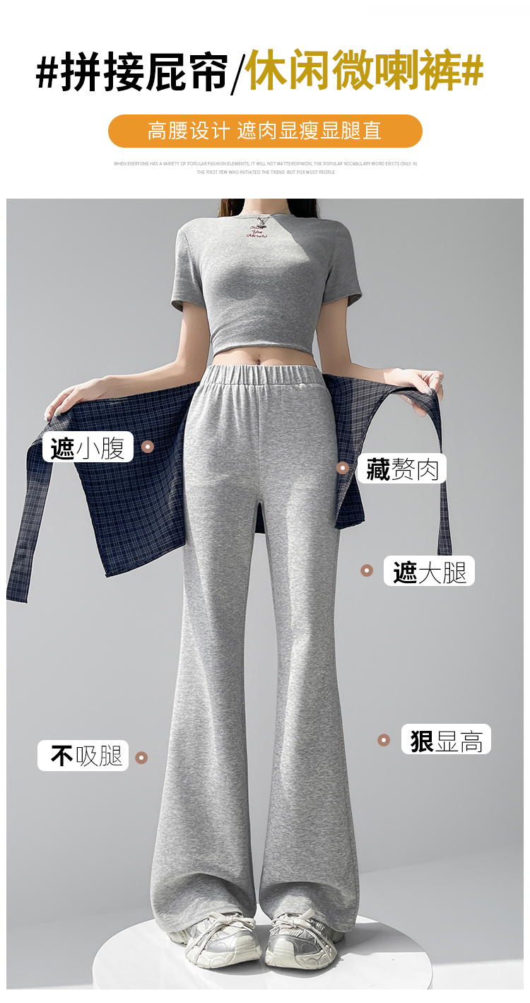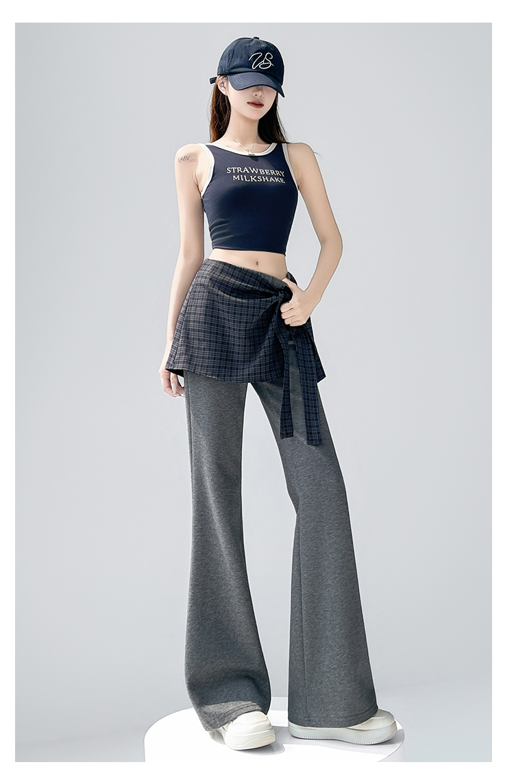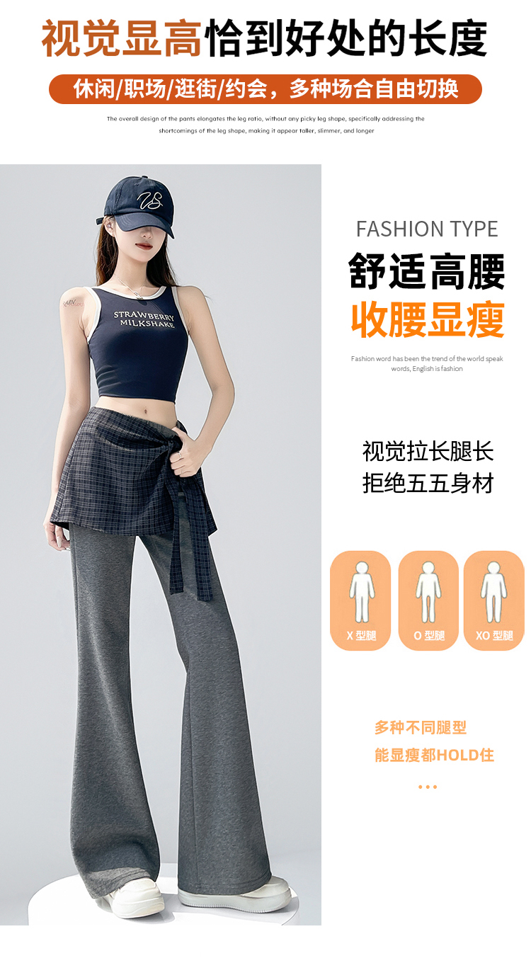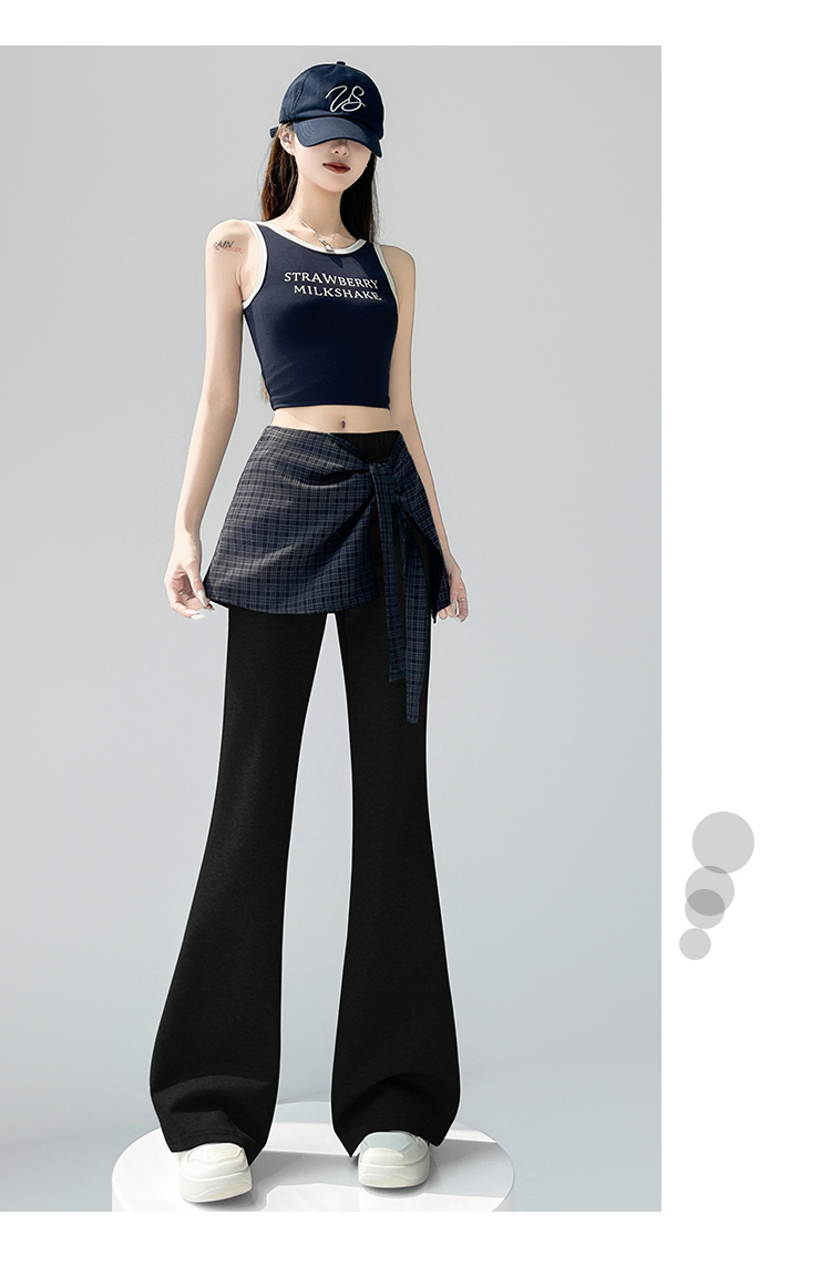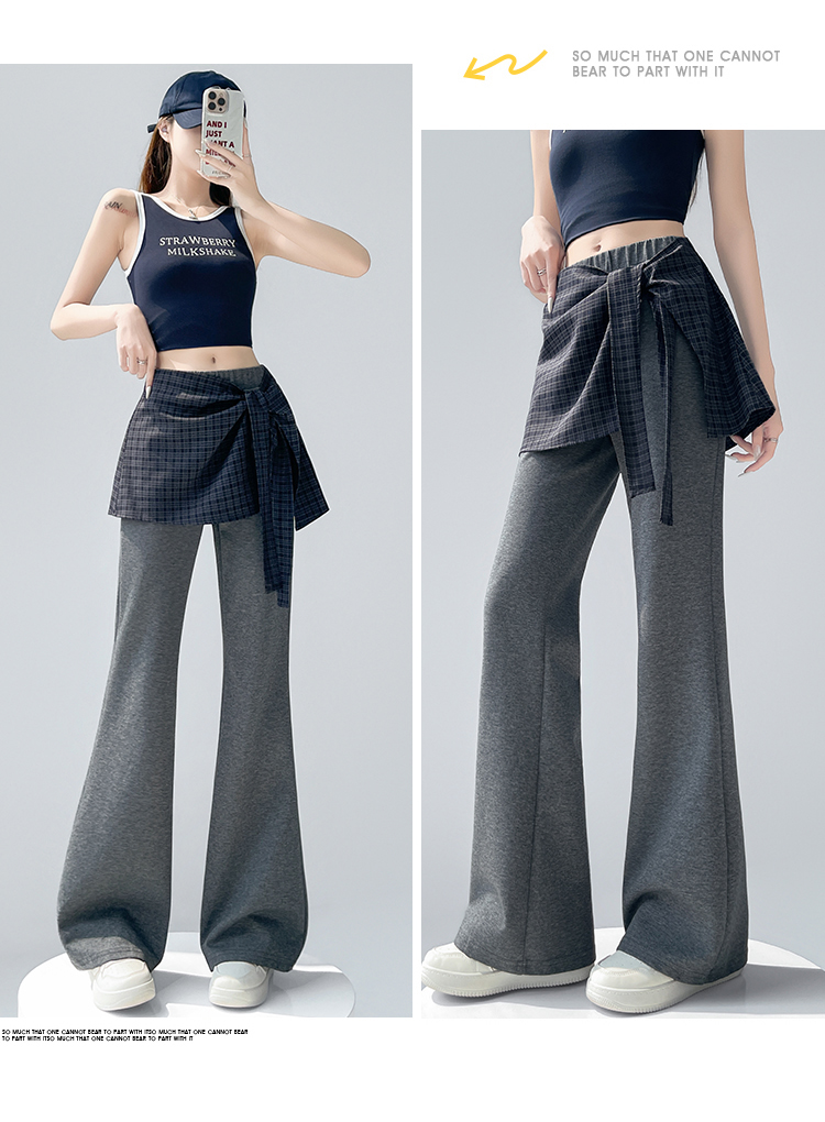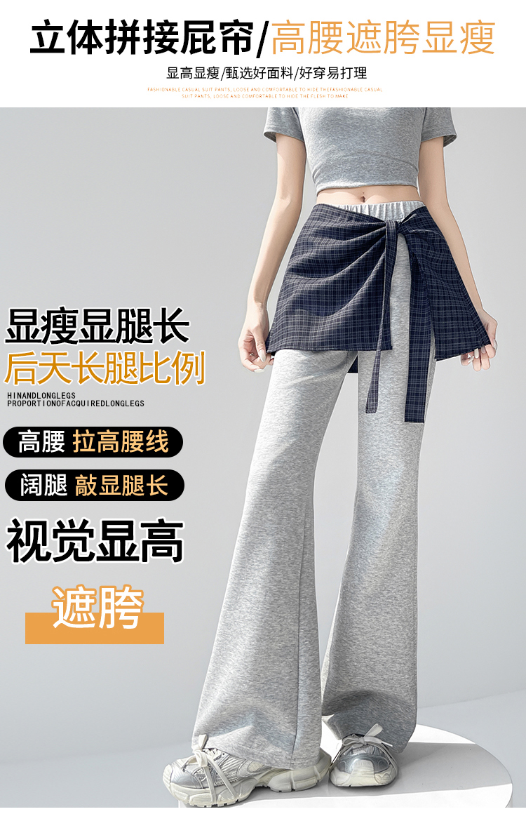假两件格纹屁帘空气棉微喇裤女夏新款高腰显瘦百搭休闲弹力喇叭裤