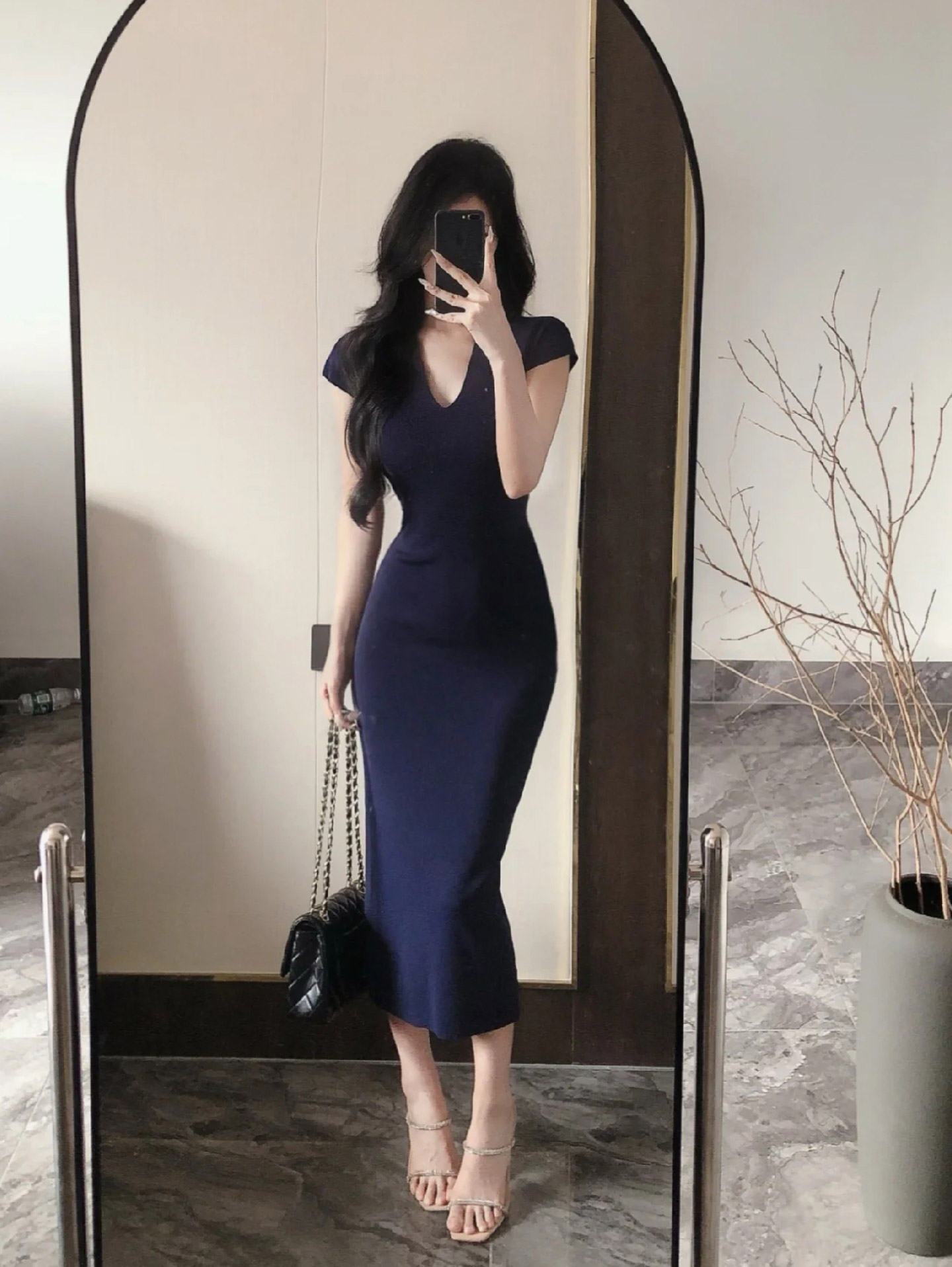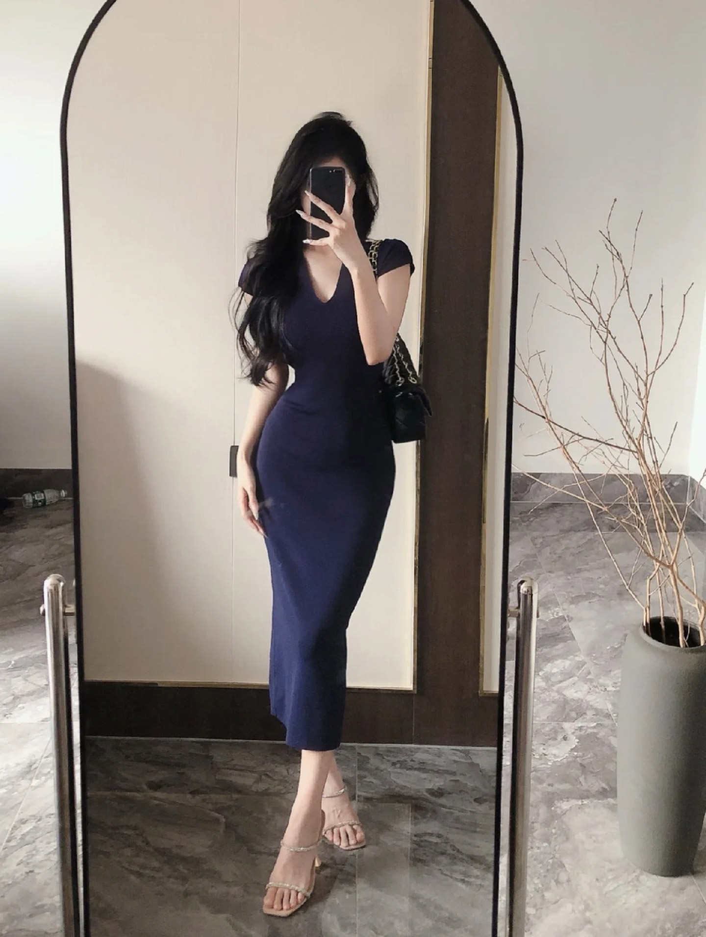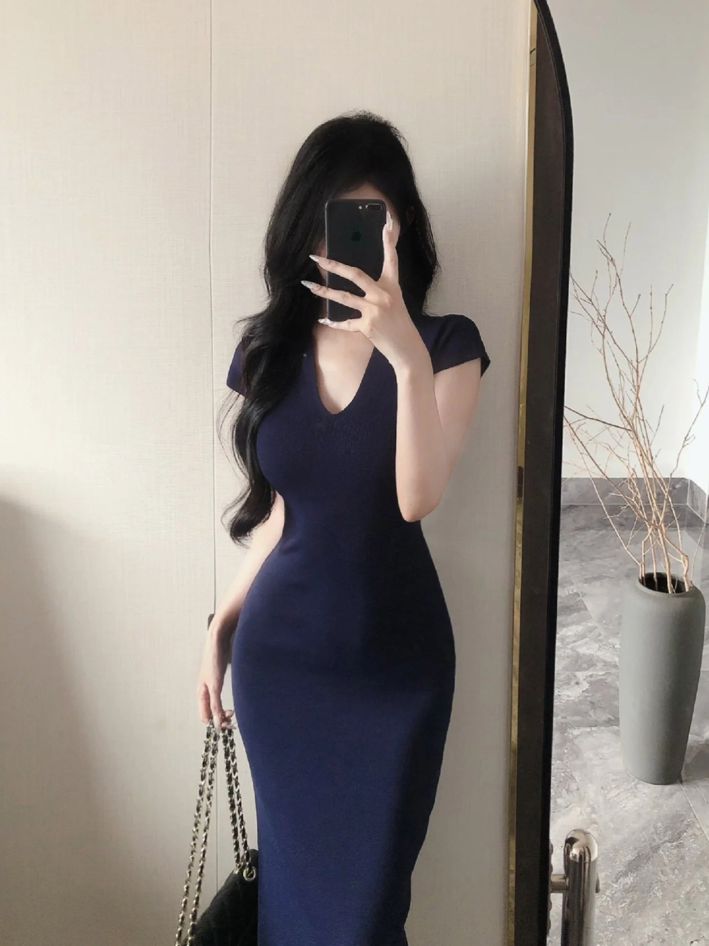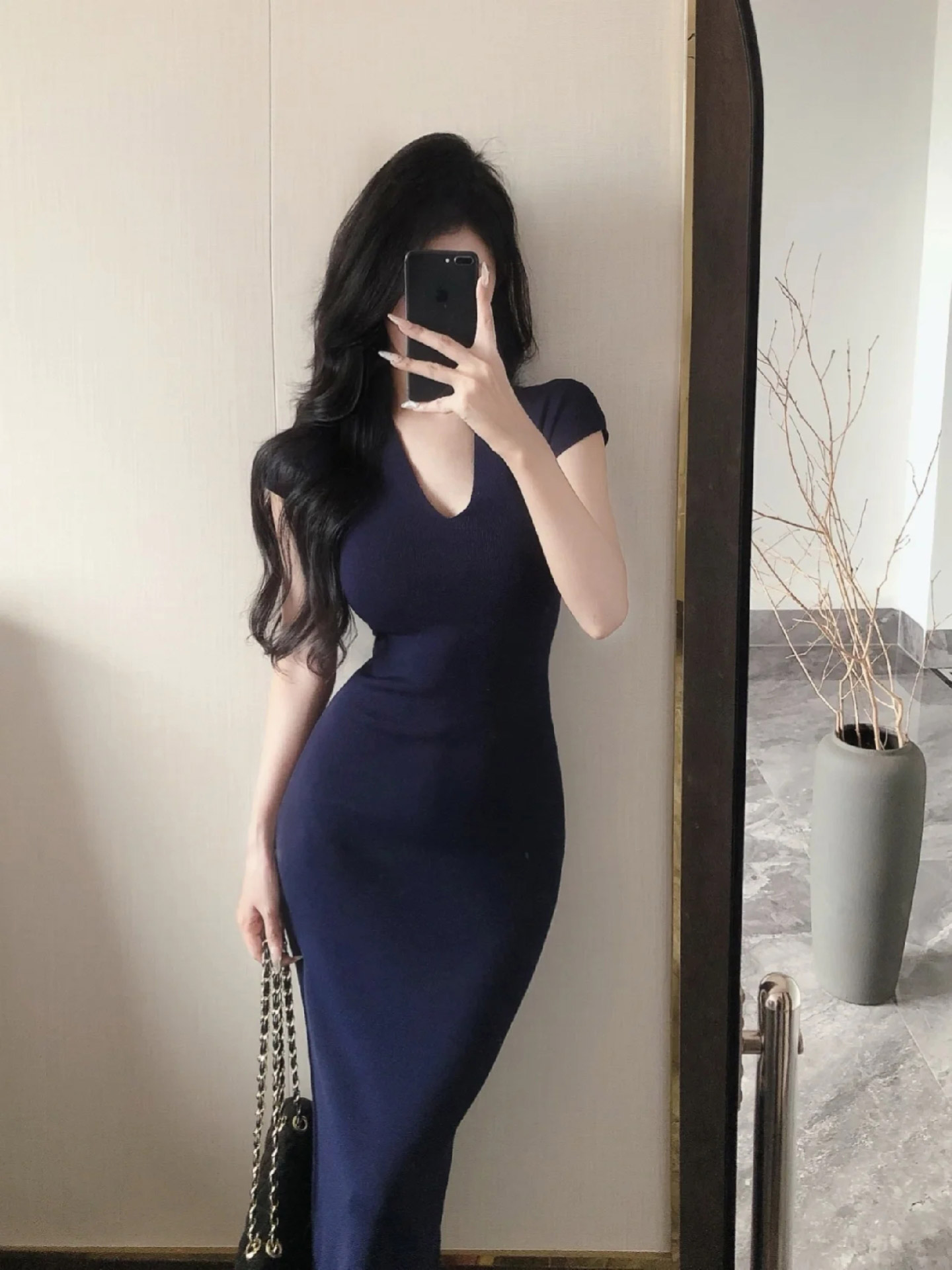 御姐风蓝色V领针织连衣裙女2026夏季新款修身显瘦包臀长裙小妈裙
