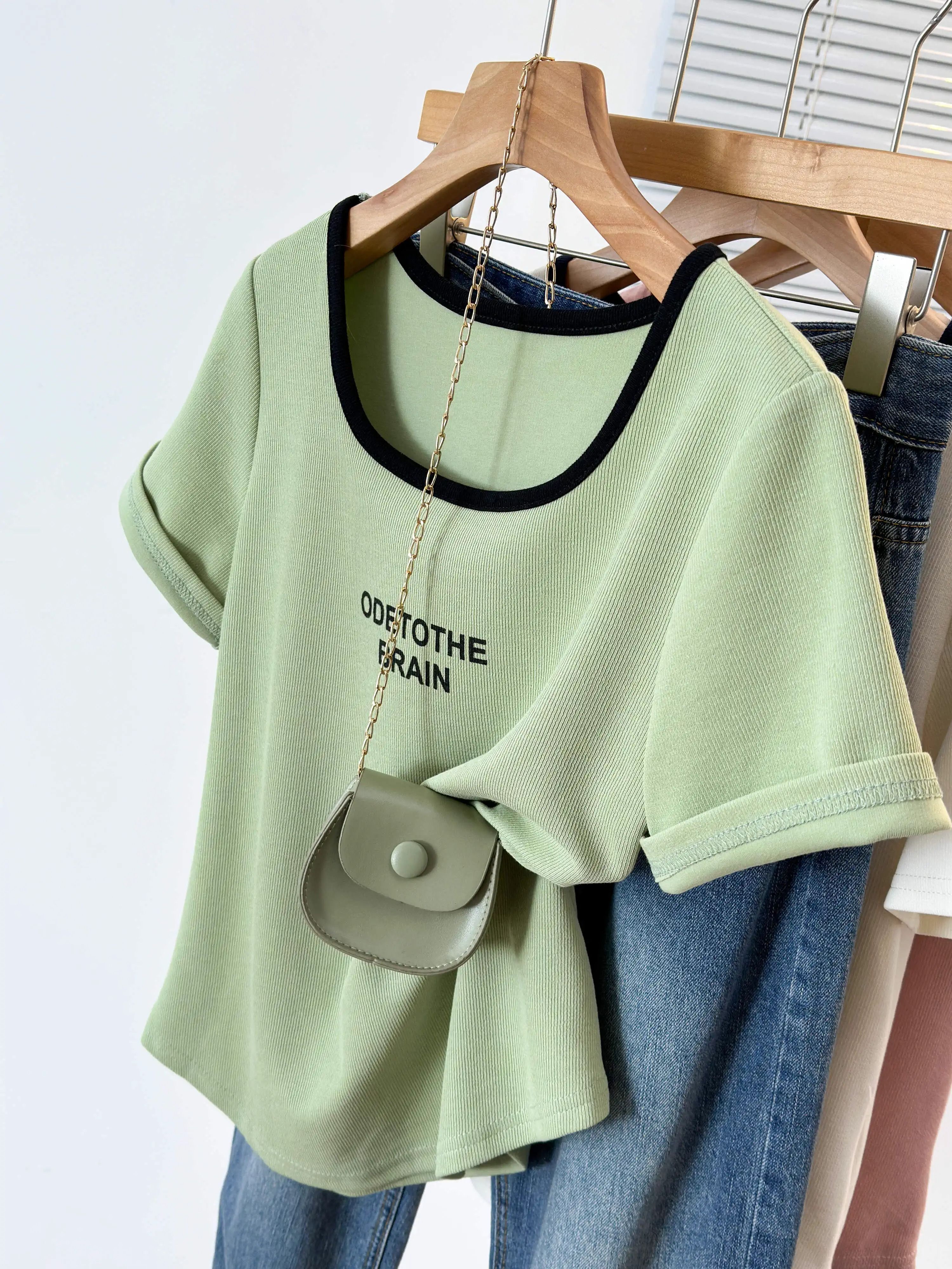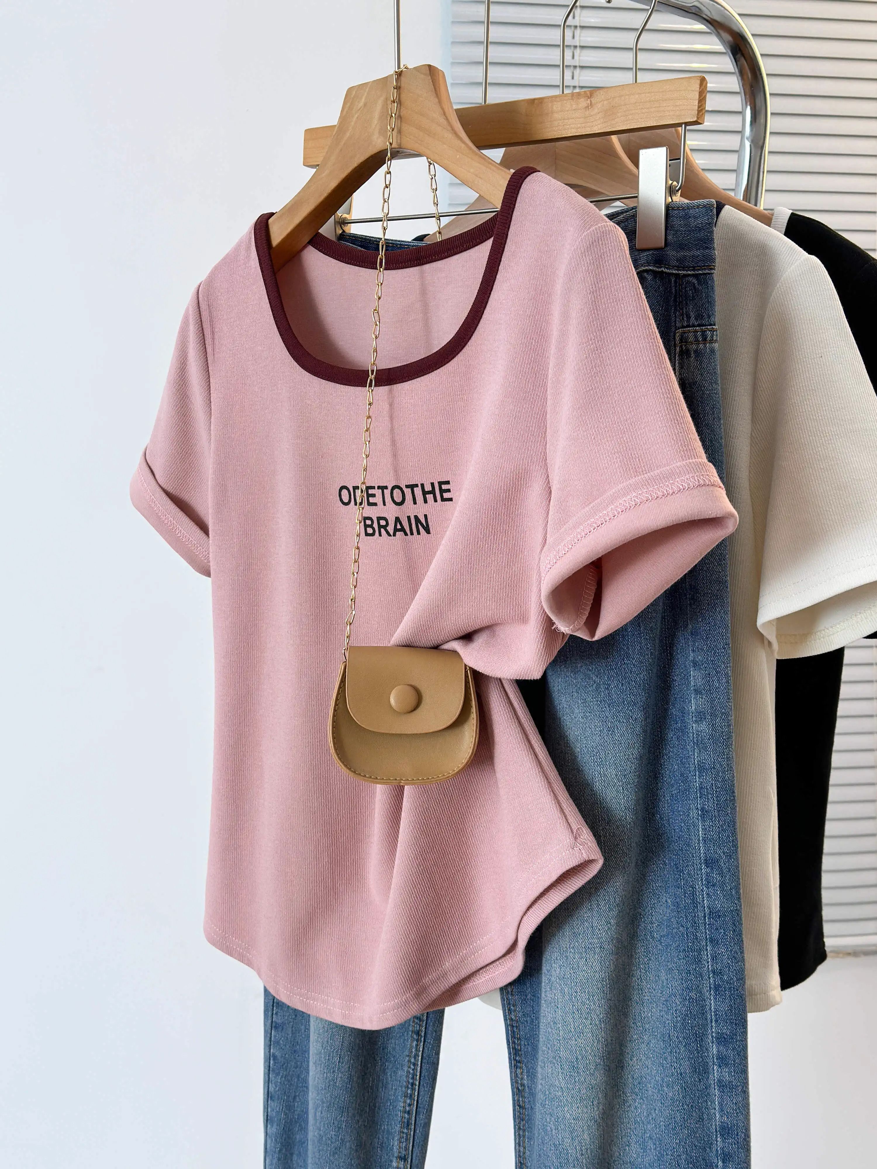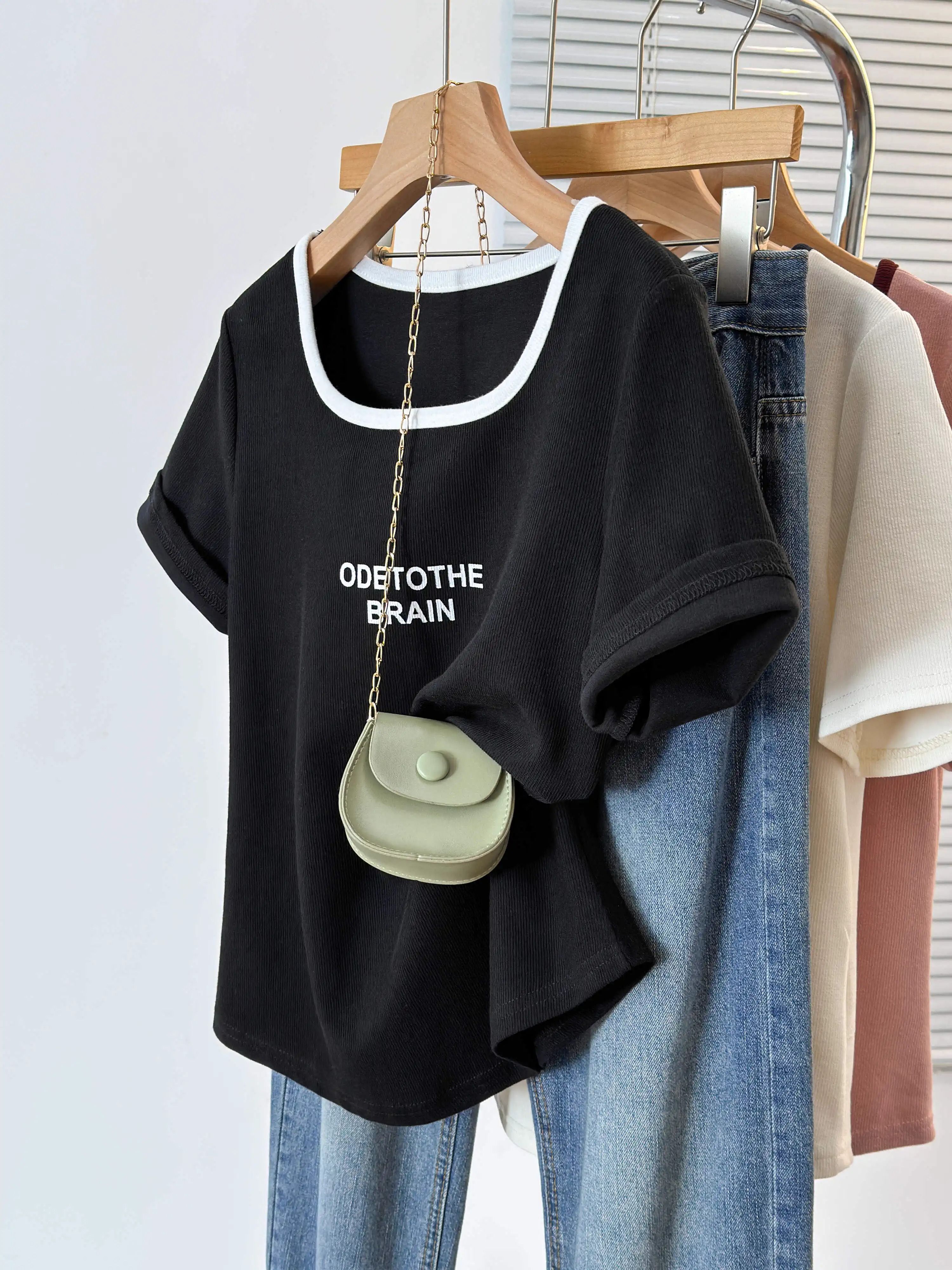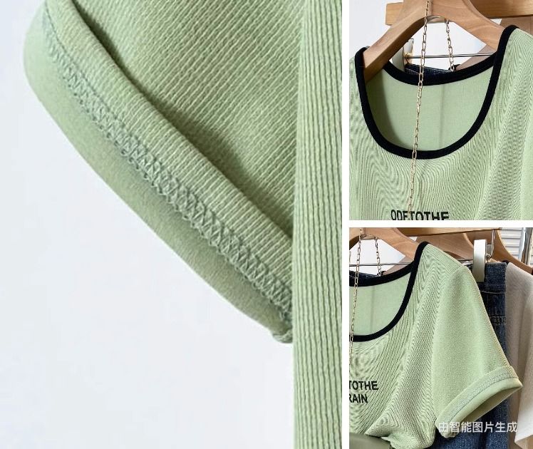 韩版设计正肩短袖t恤女U领撞色大码女装遮肚子显瘦方领上衣夏胖mm