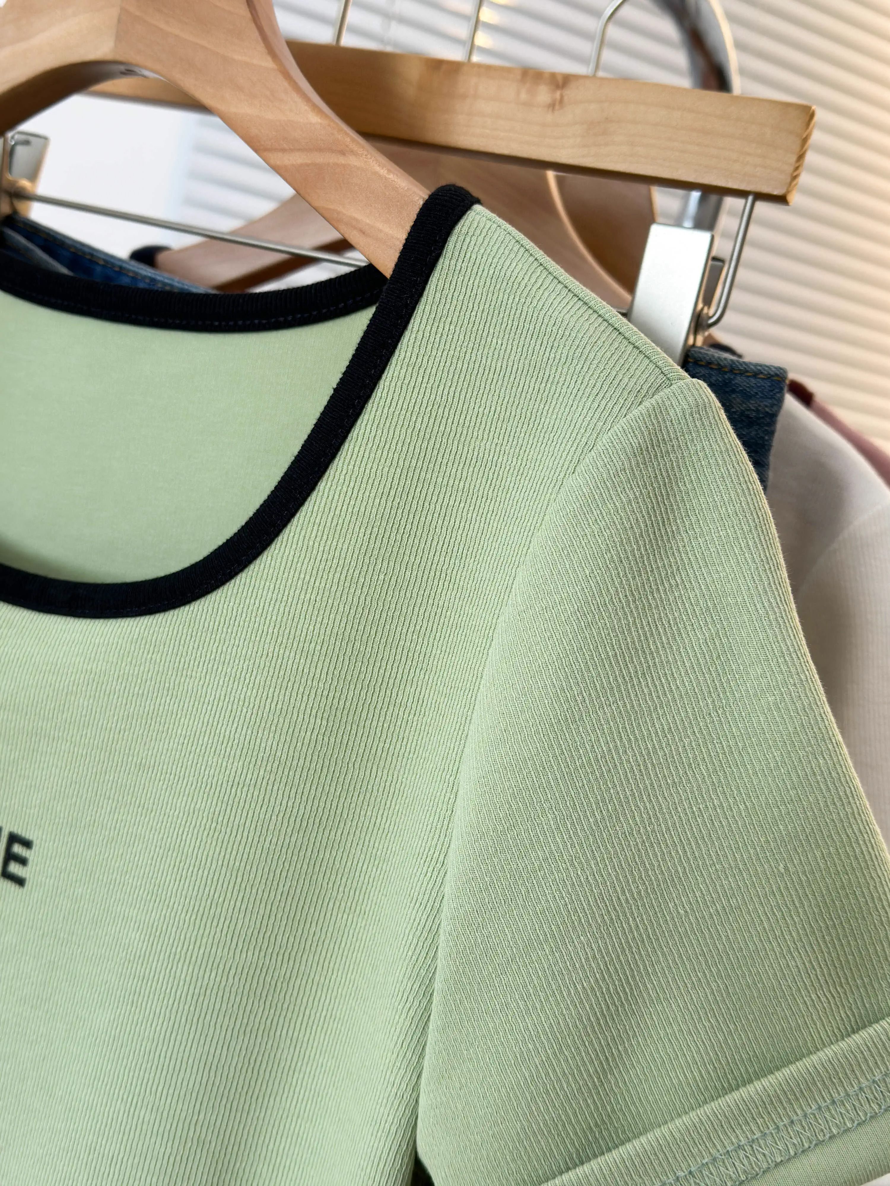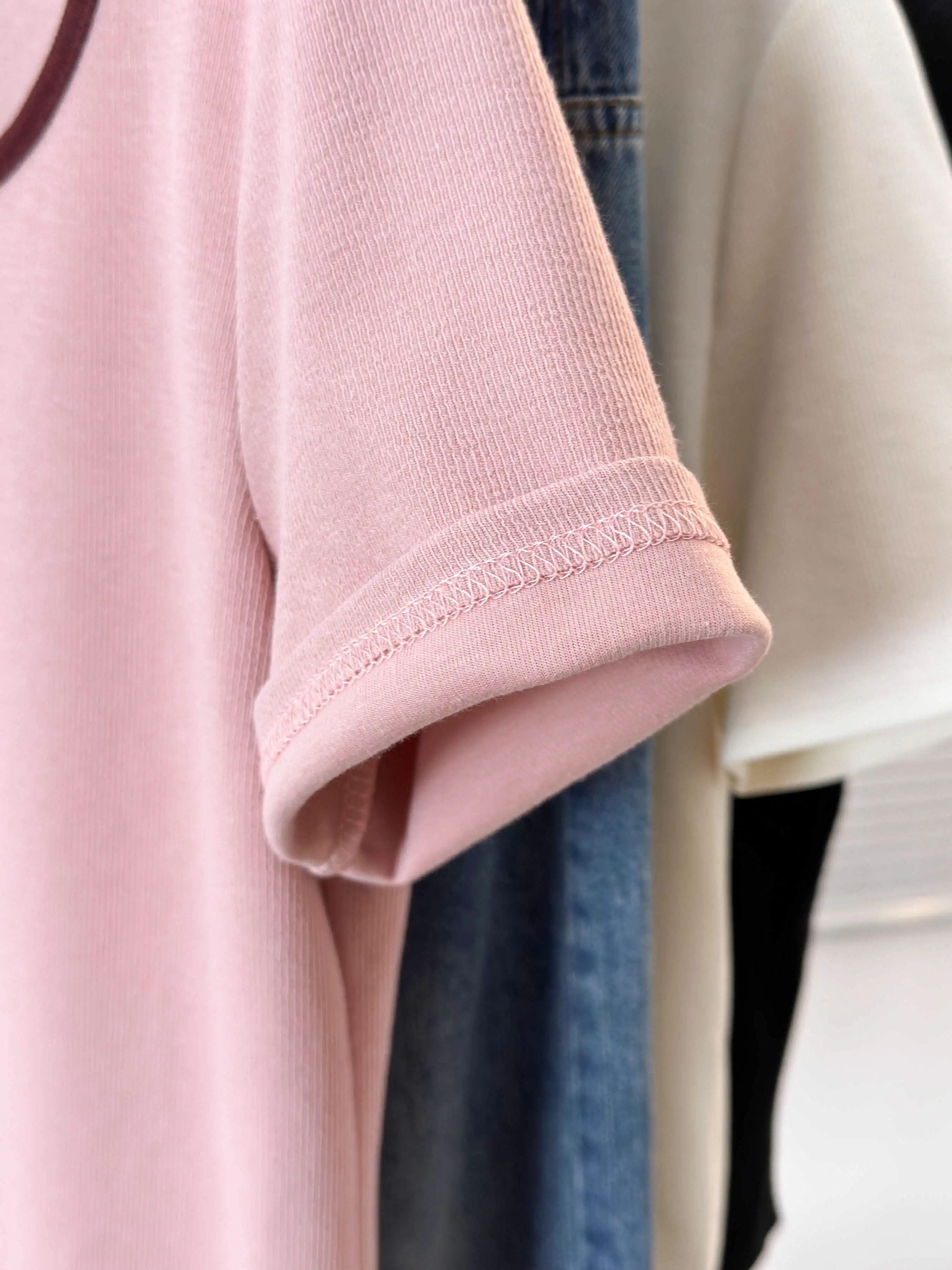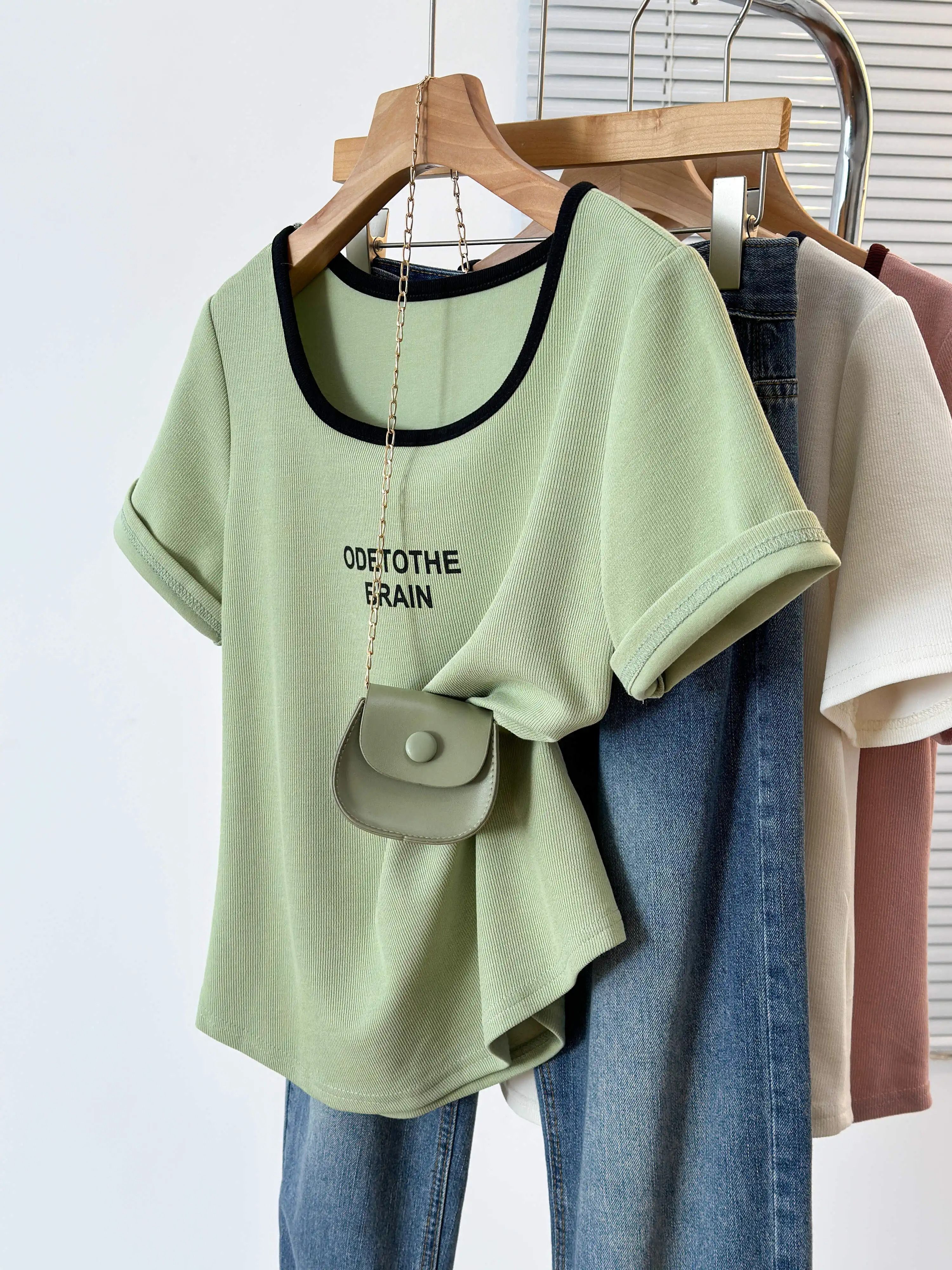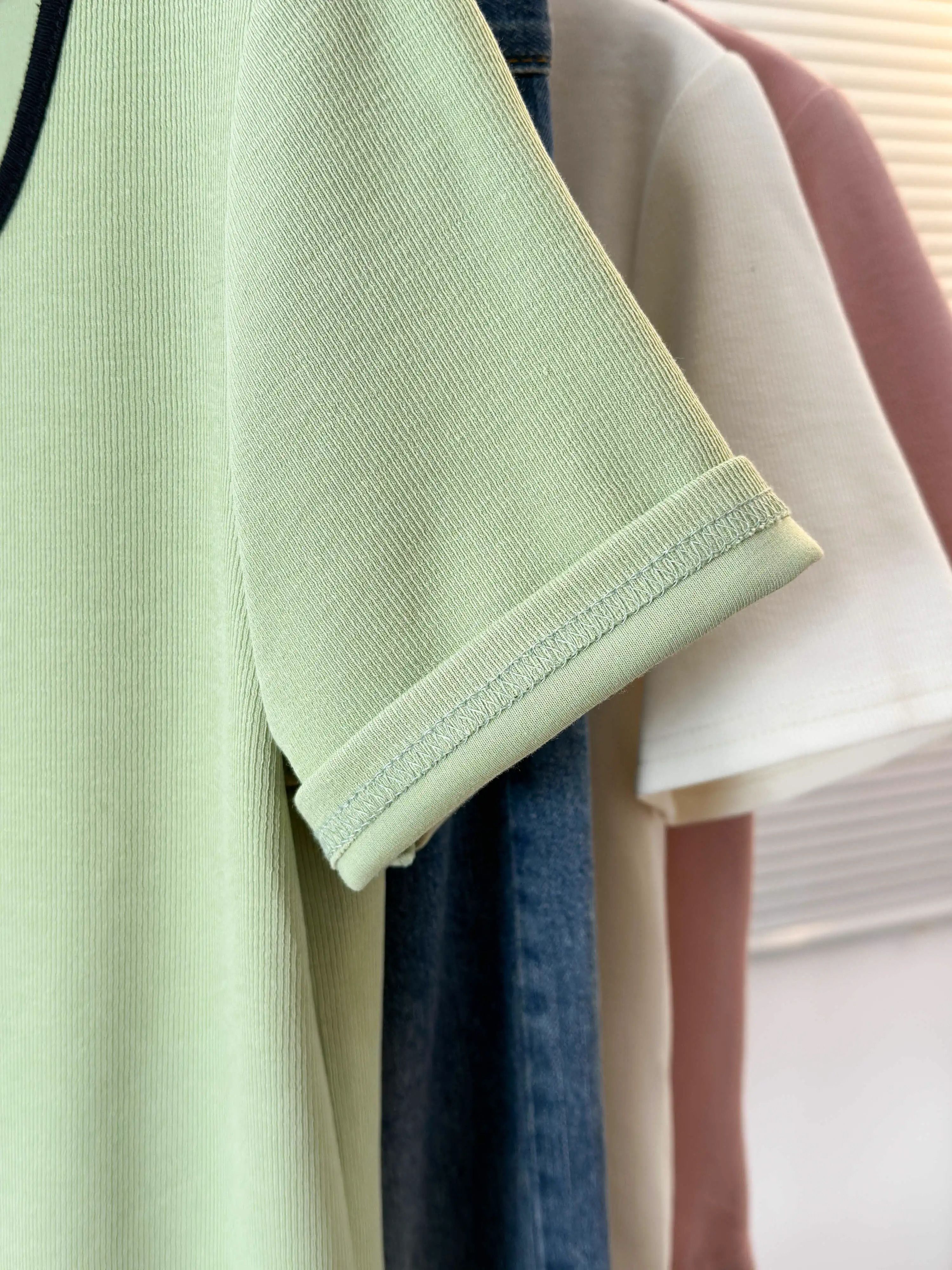 韩版设计正肩短袖t恤女U领撞色大码女装遮肚子显瘦方领上衣夏胖mm