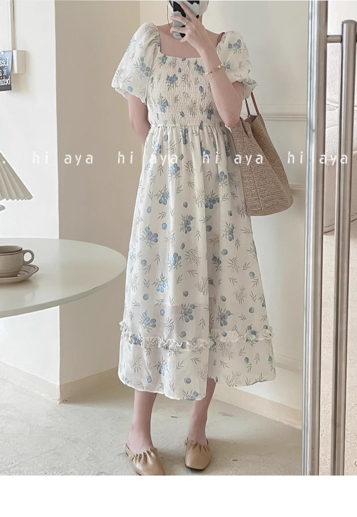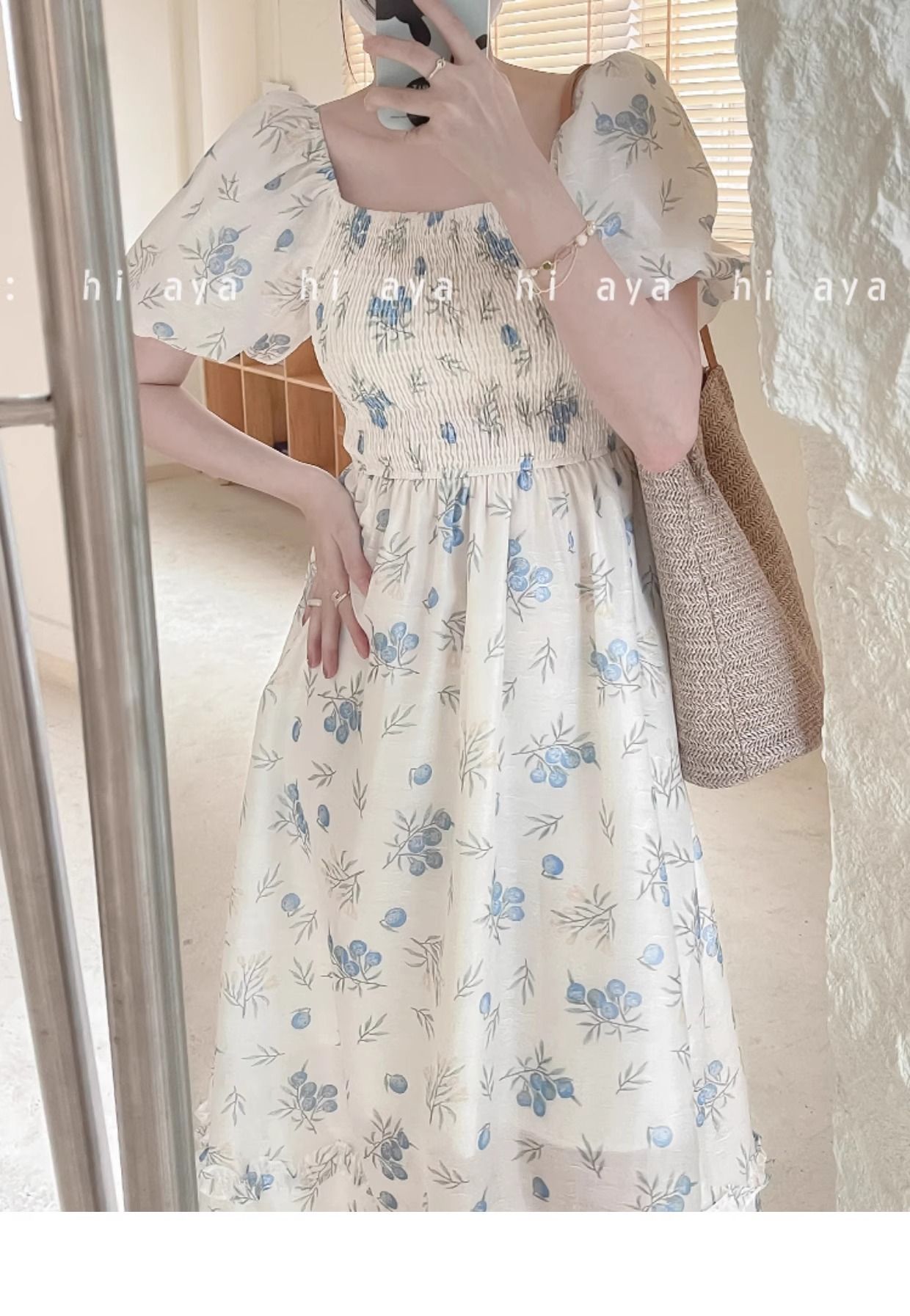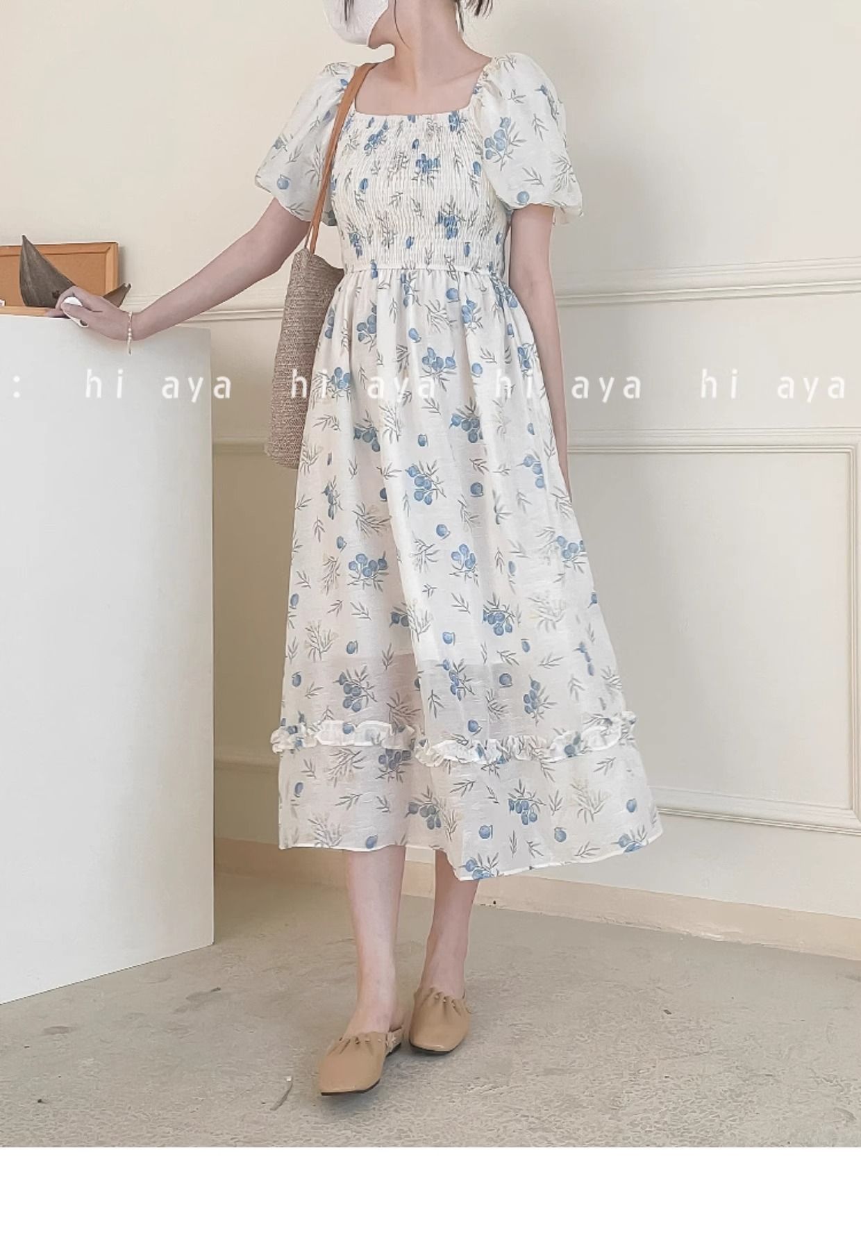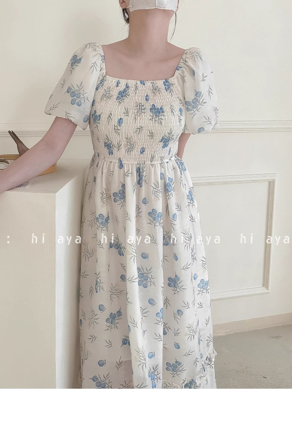 2026年夏季印花方领花色泡泡袖长款温柔风法式设计小众氛围碎花裙