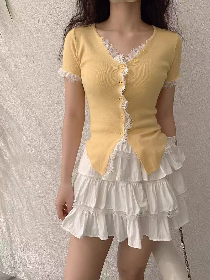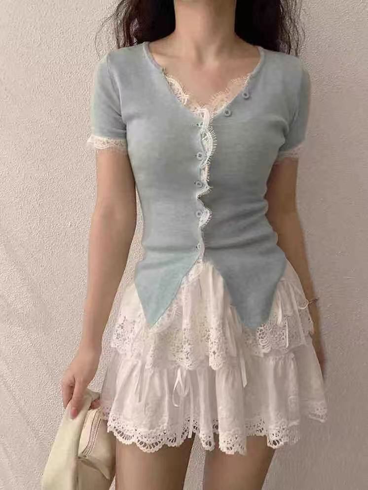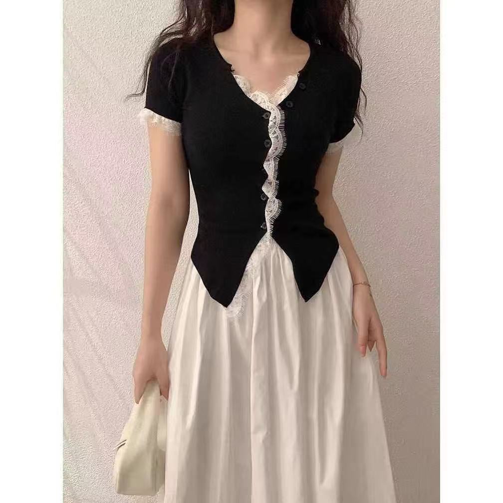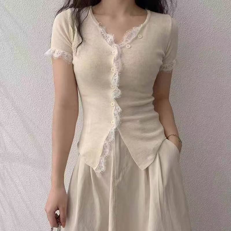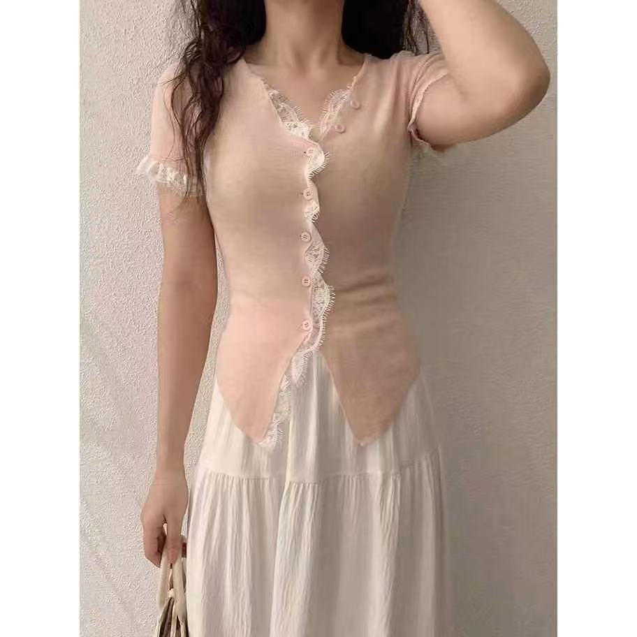 纯欲风蕾丝花边拼接单排扣V领短袖针织衫夏季新款小众纯色上衣女