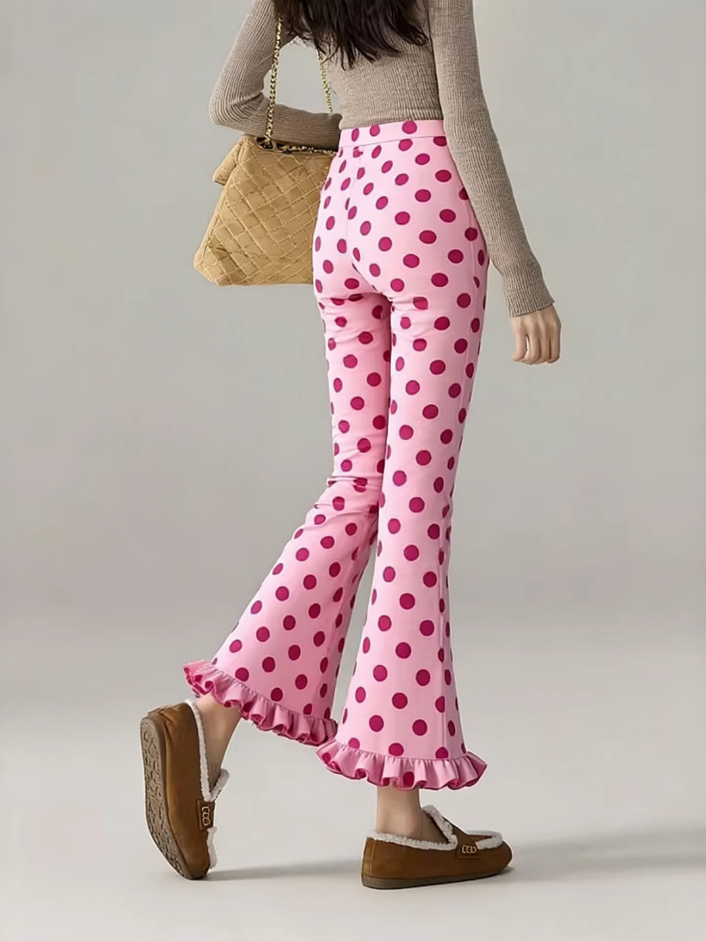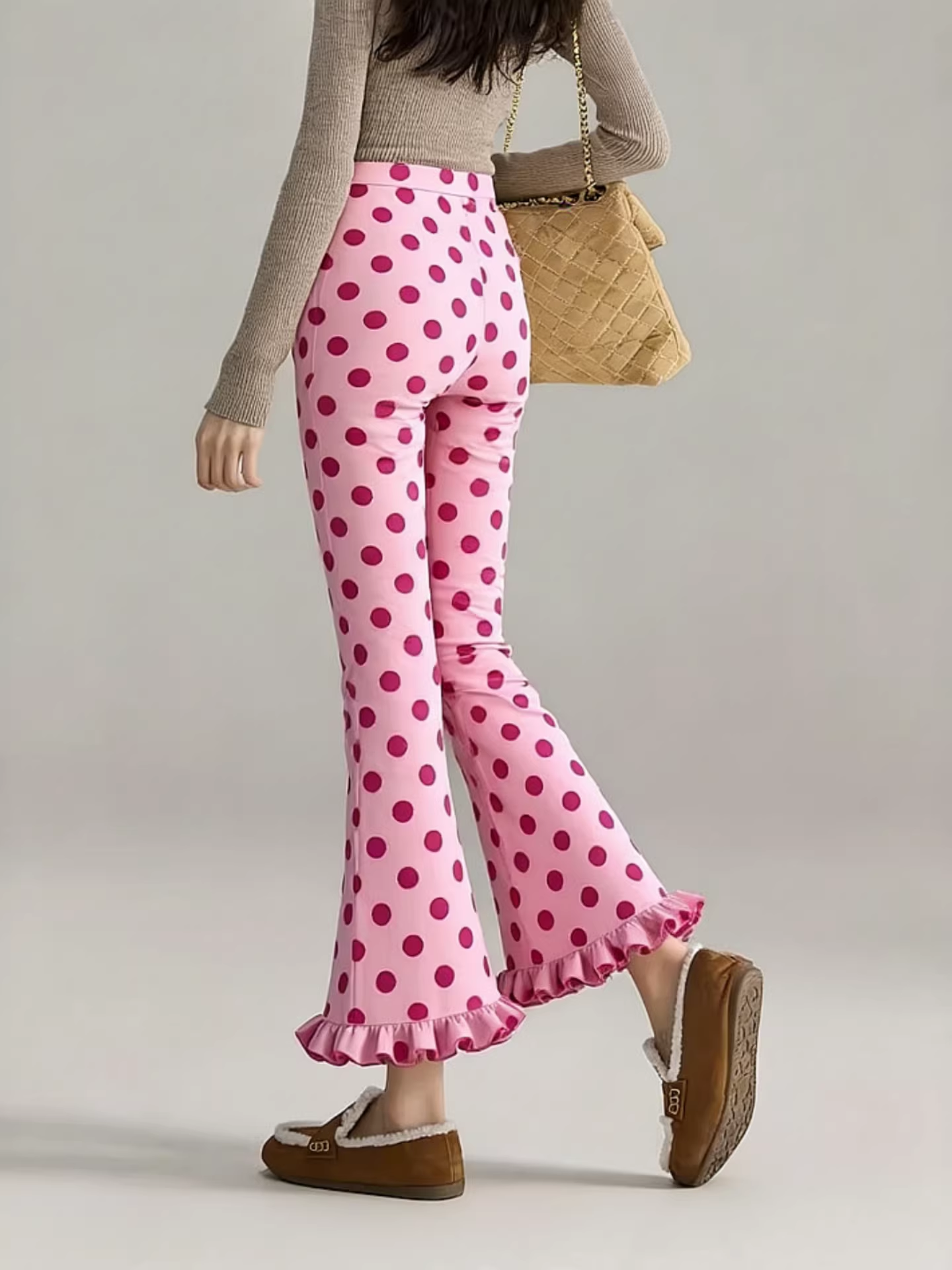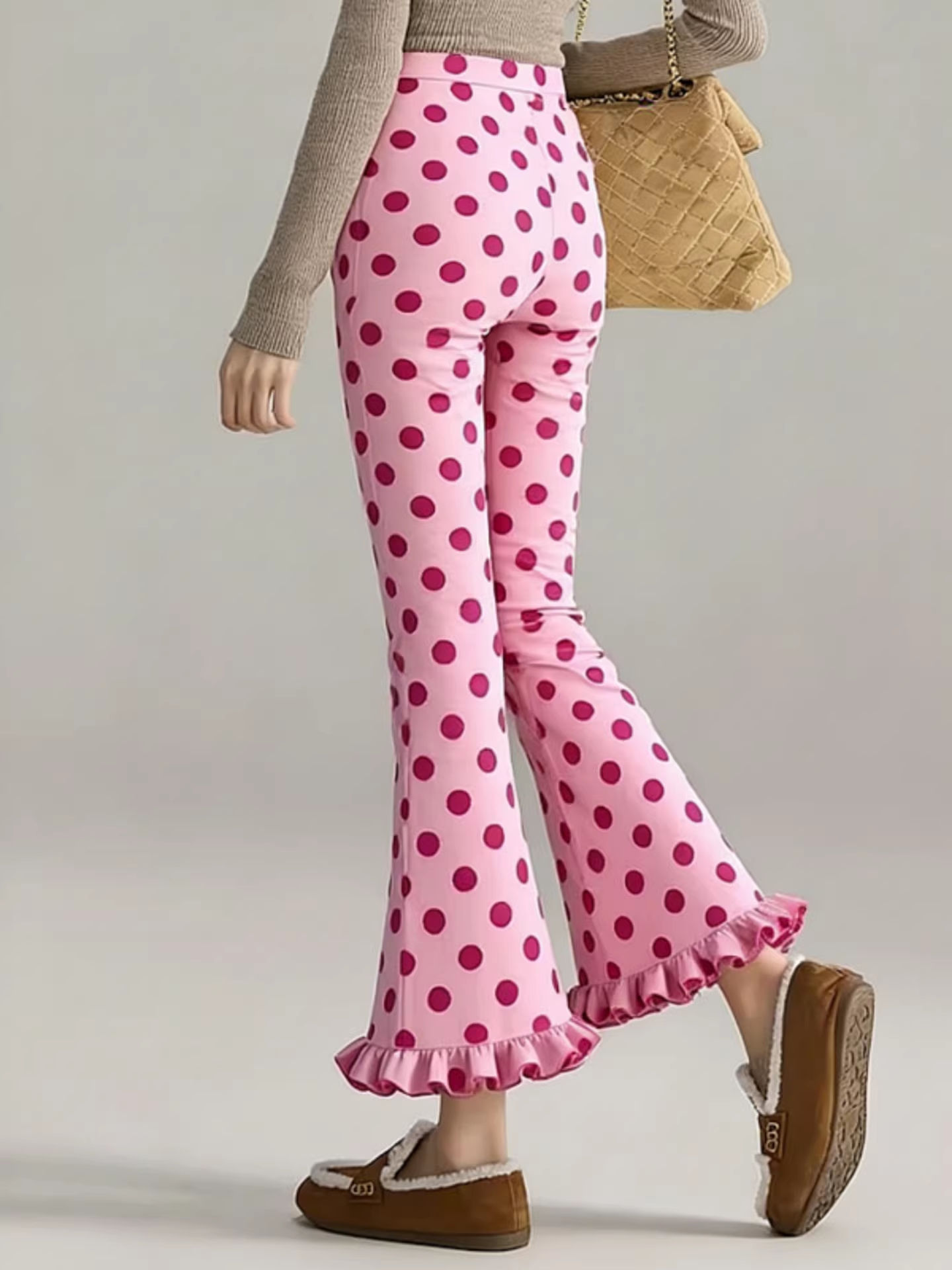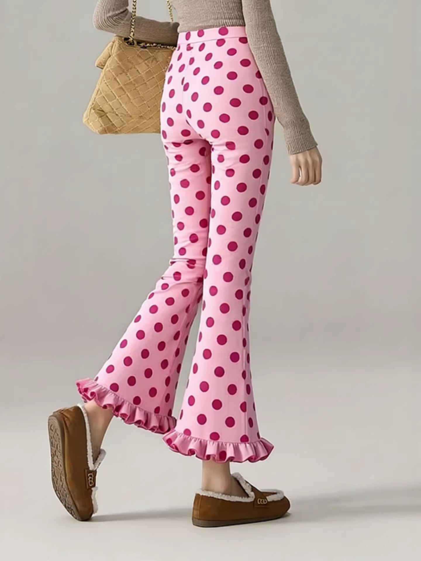 时尚2026春季新款时尚百搭设计感粉色波点木耳花边九分微喇裤女装