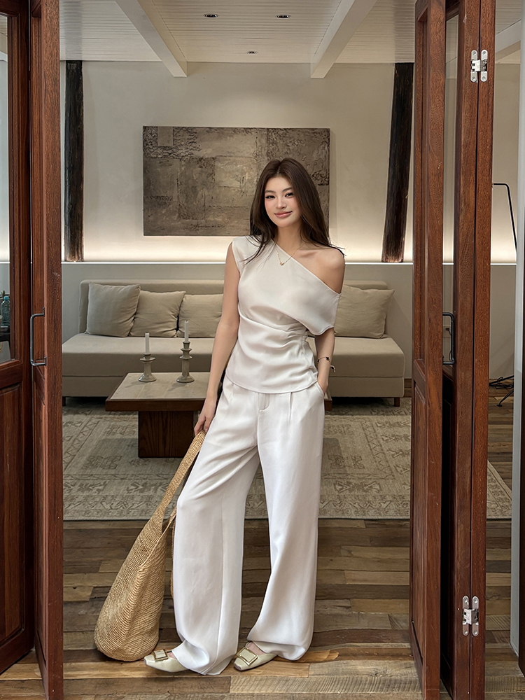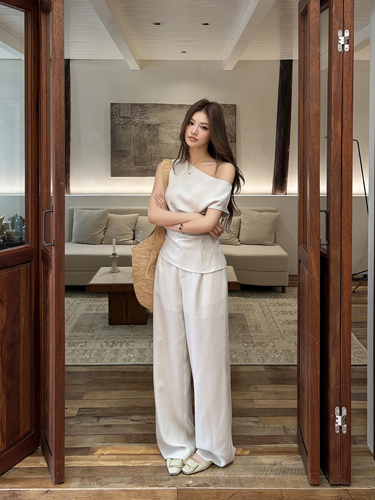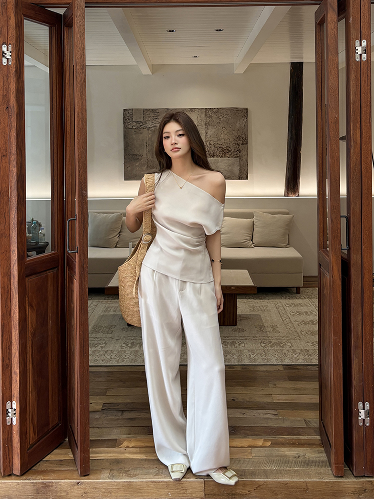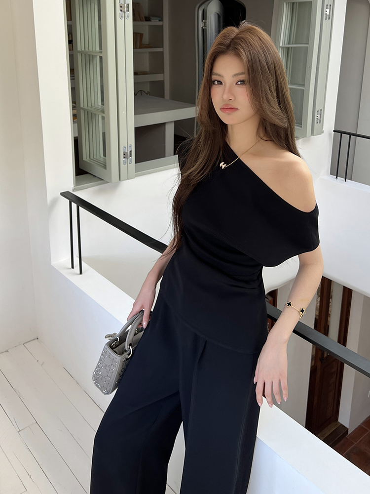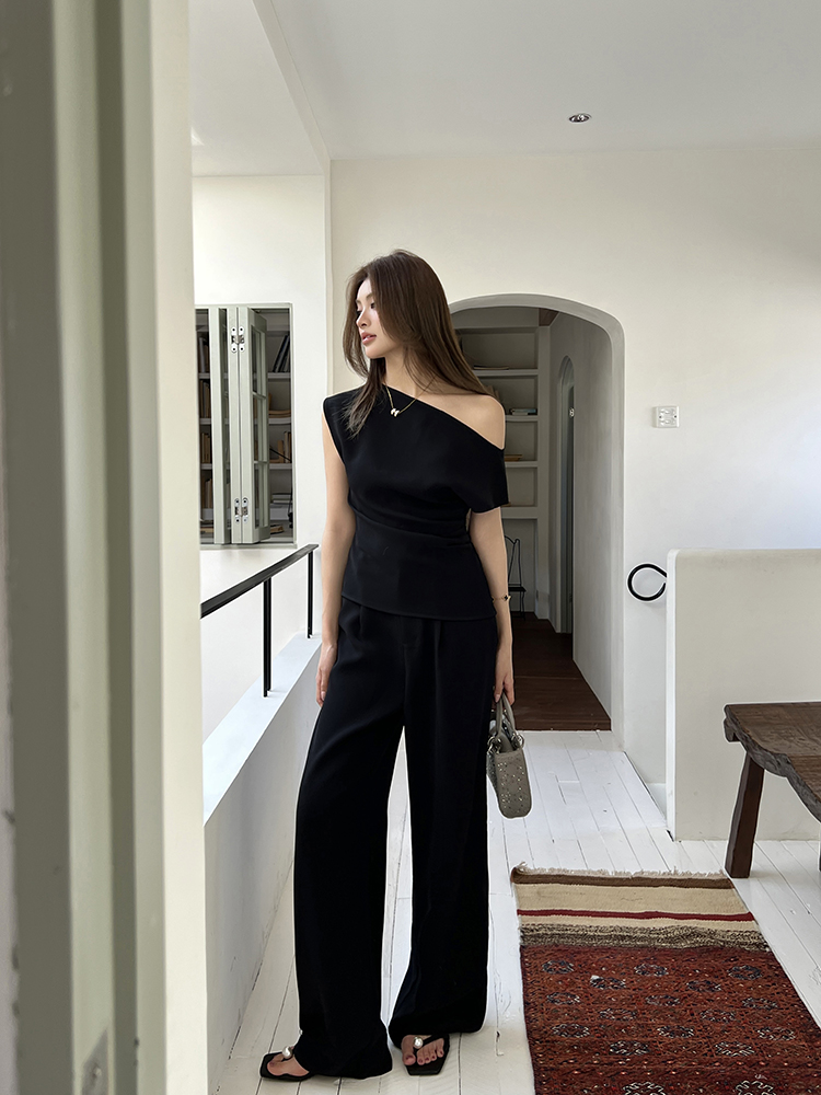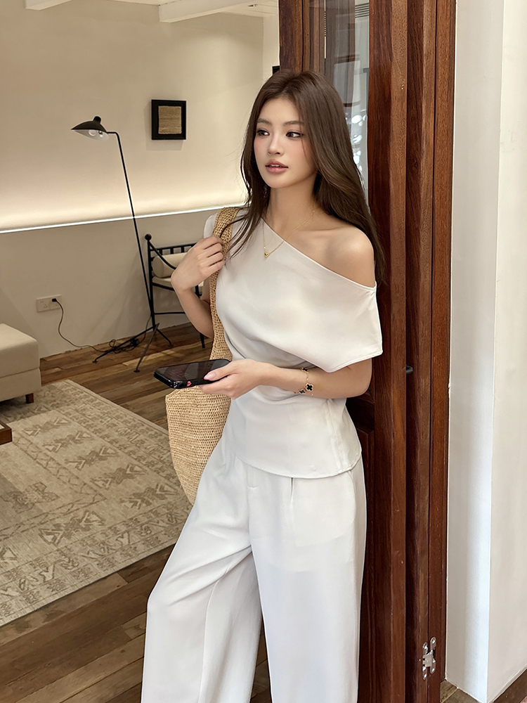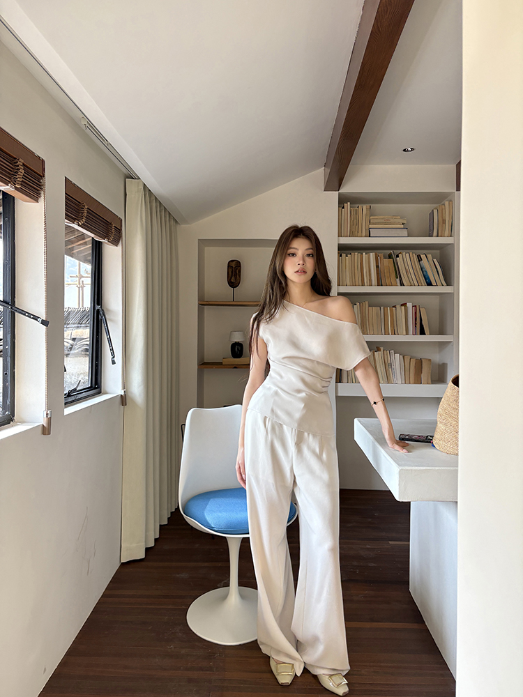 实拍2026春夏新款知性职场通勤斜露肩上衣女休闲裤阔腿裤两件套装