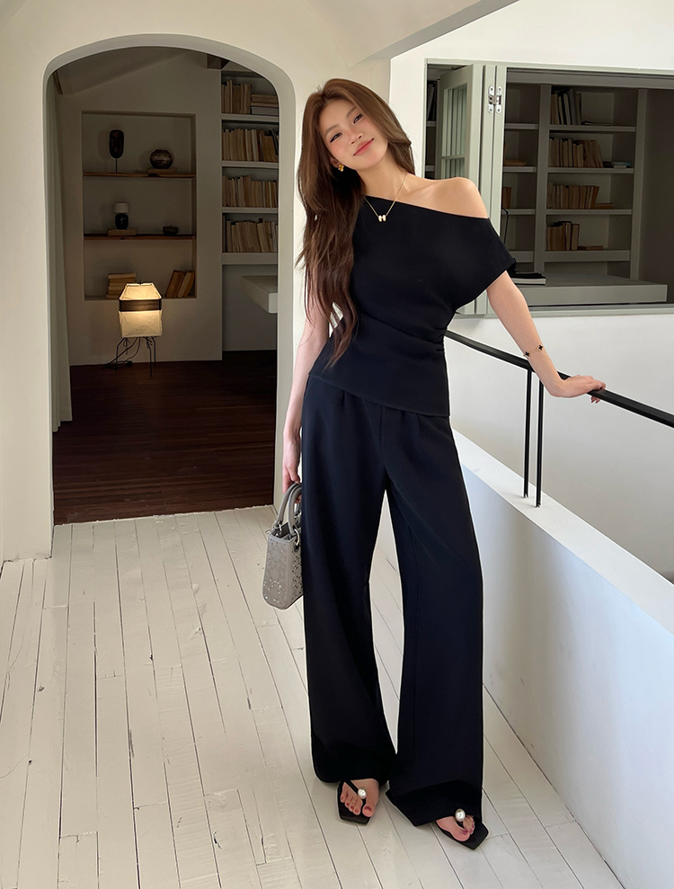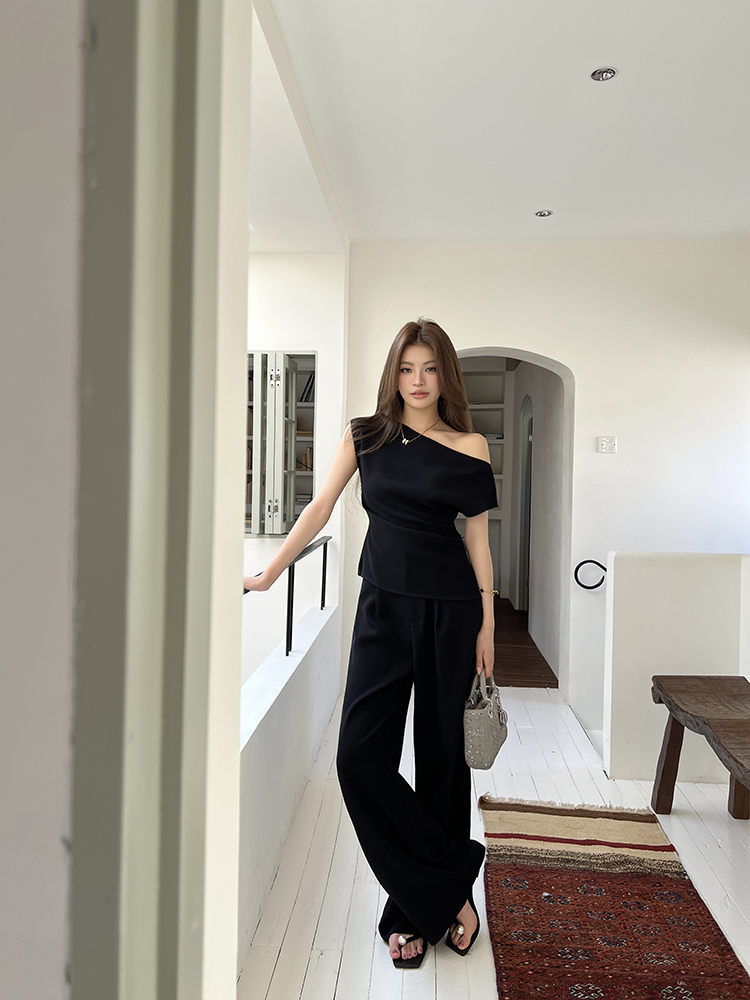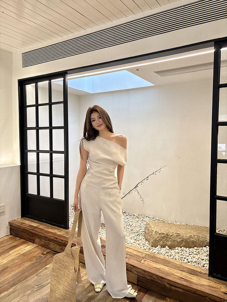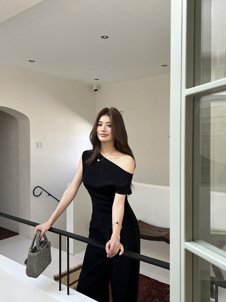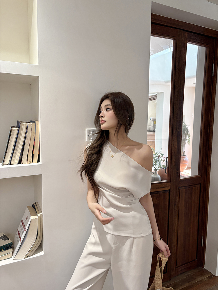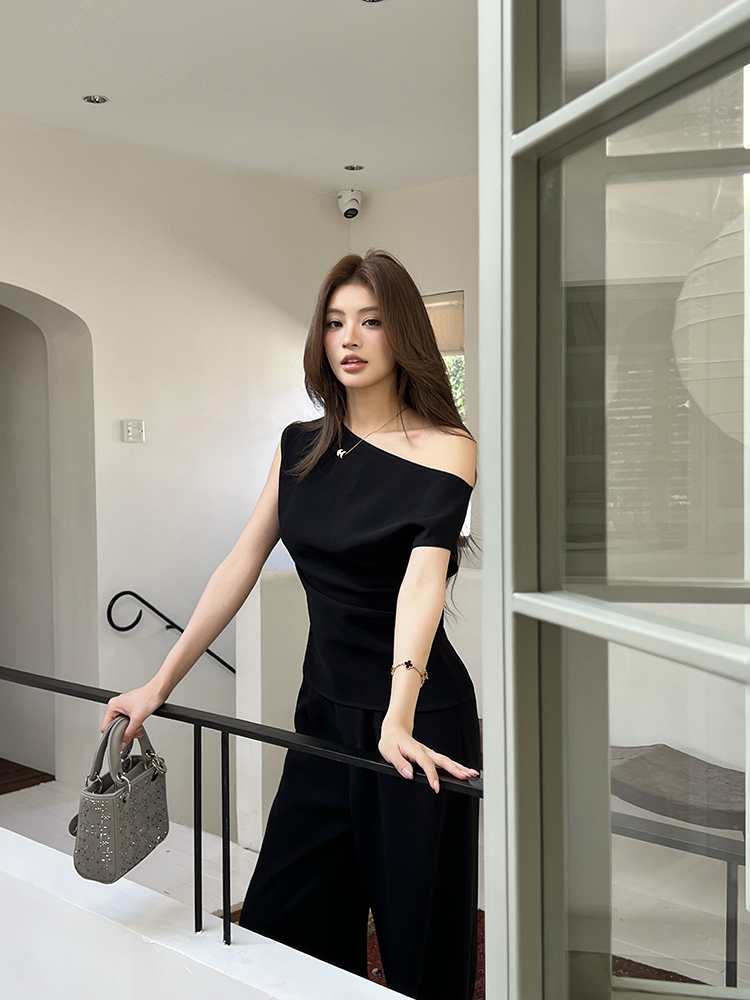 实拍2026春夏新款知性职场通勤斜露肩上衣女休闲裤阔腿裤两件套装