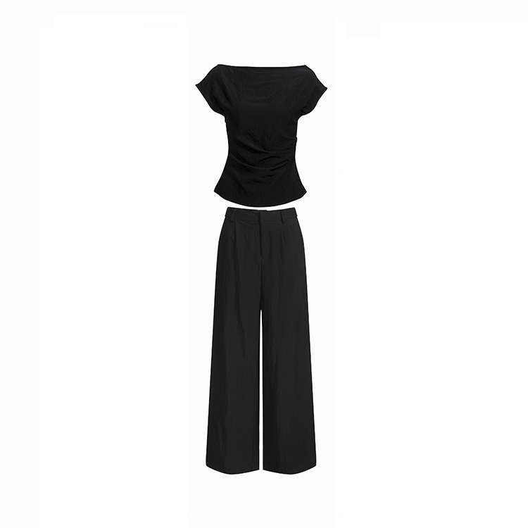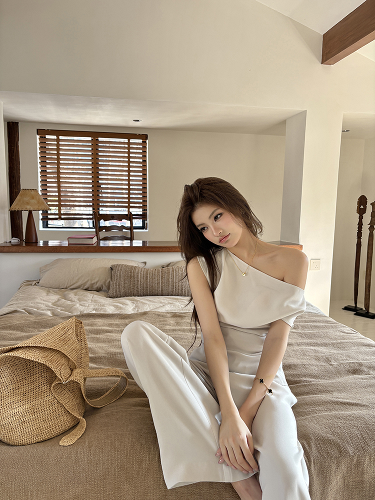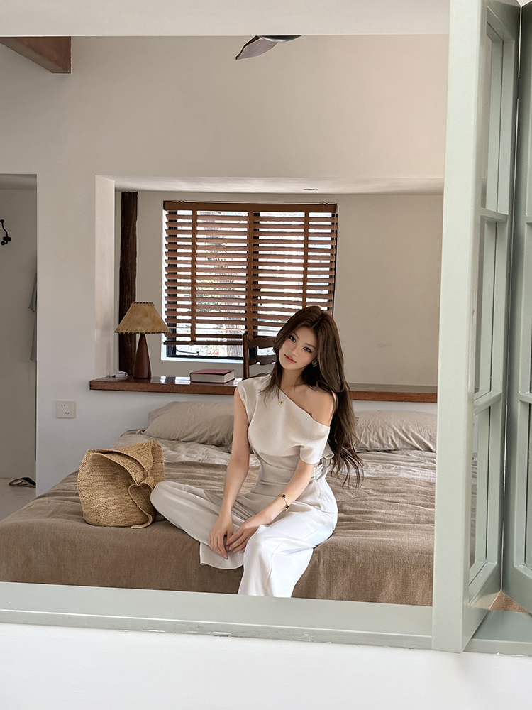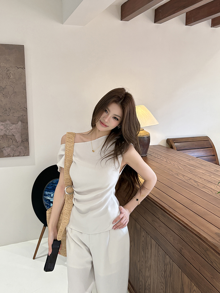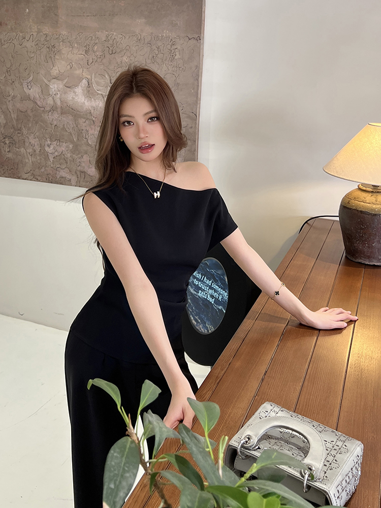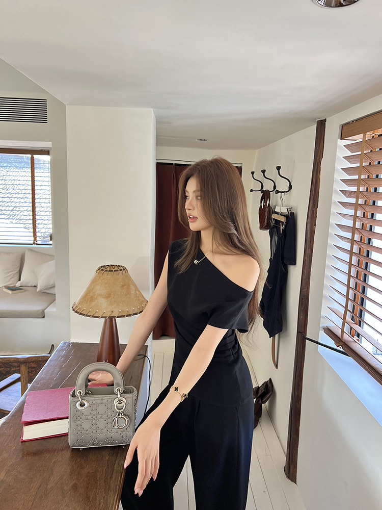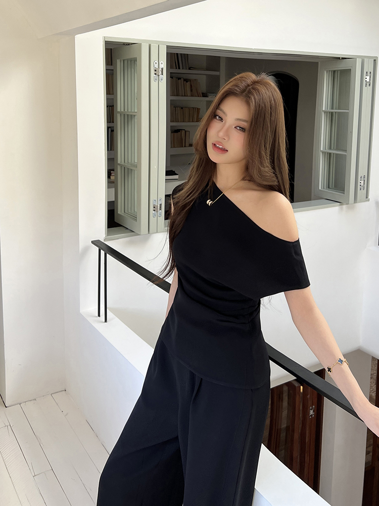 实拍2026春夏新款知性职场通勤斜露肩上衣女休闲裤阔腿裤两件套装