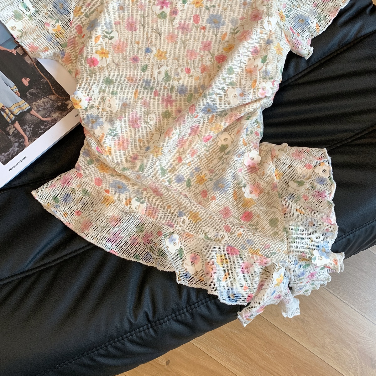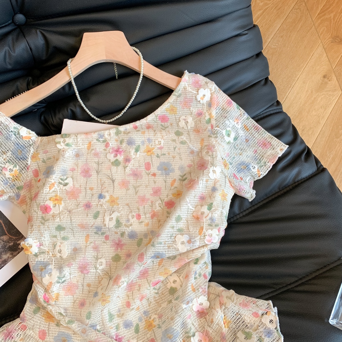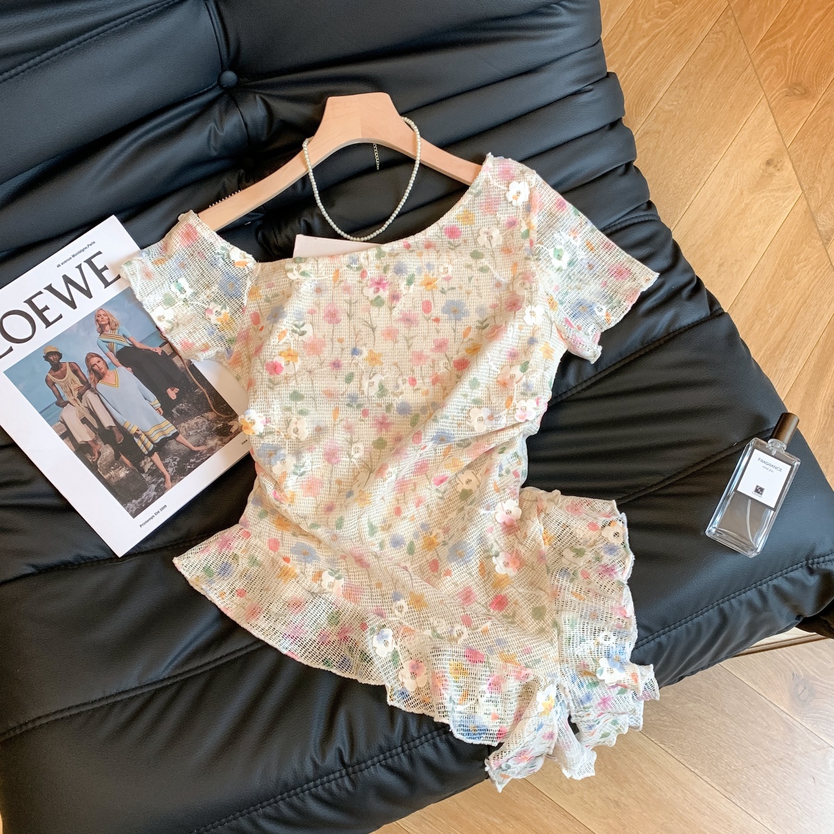 实拍韩系甜美碎花斜肩短袖雪纺衫女2026夏季不规则修身辣妹小上衣