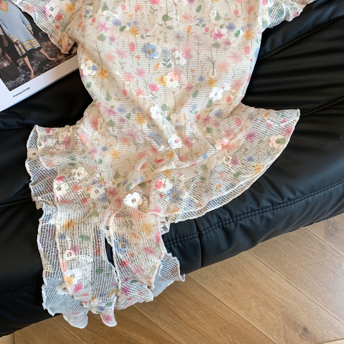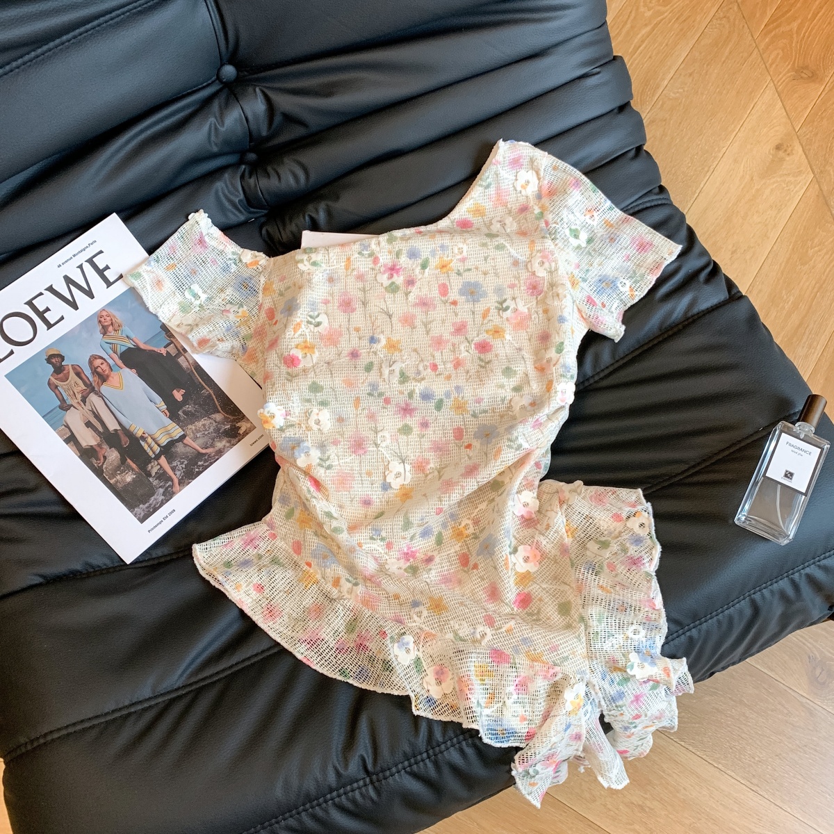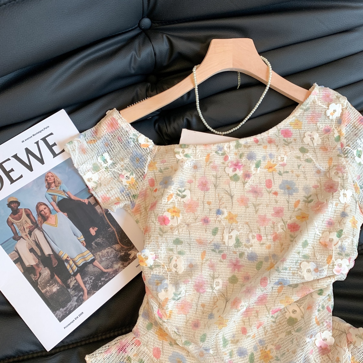 实拍韩系甜美碎花斜肩短袖雪纺衫女2026夏季不规则修身辣妹小上衣