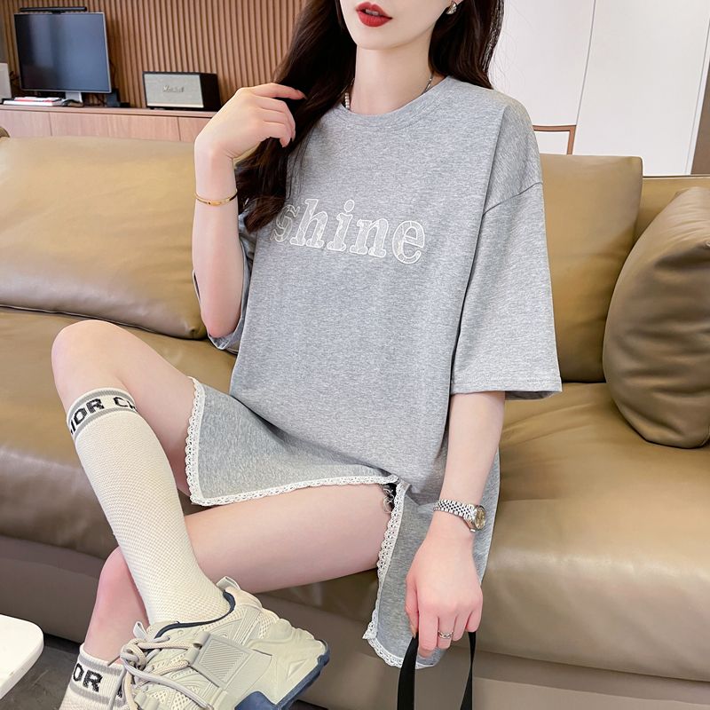 实拍2026夏季100棉休闲百搭蕾丝花边开叉上衣短袖t恤女