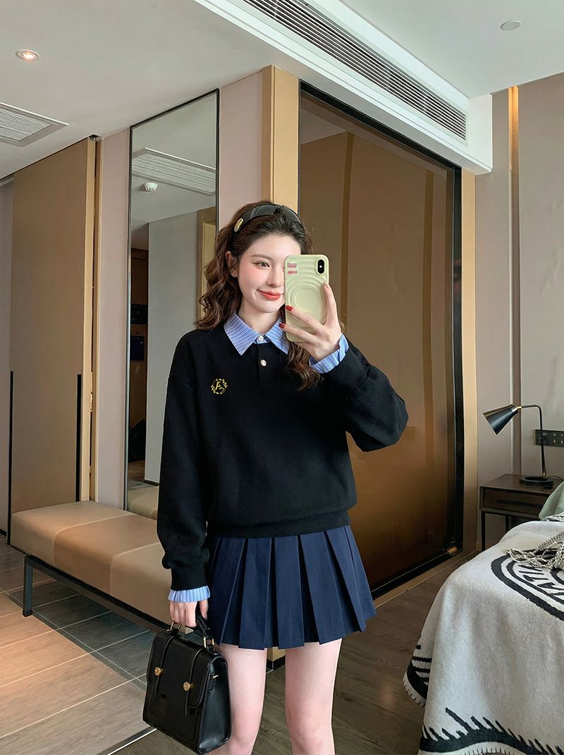 官图薄款卫衣女刺绣花春秋新款韩系拼接宽松假两件衬衫领上衣