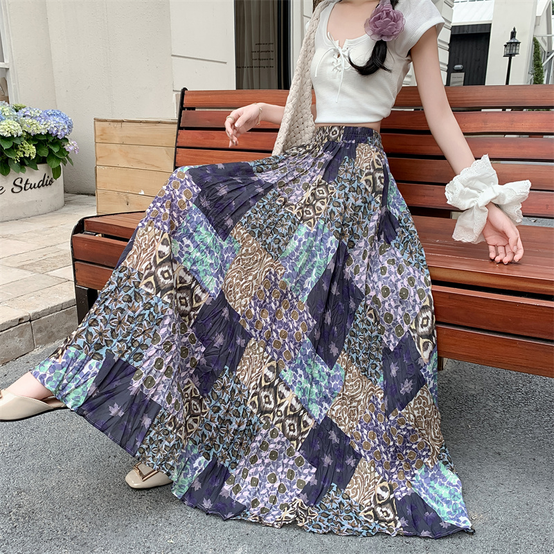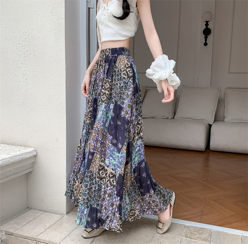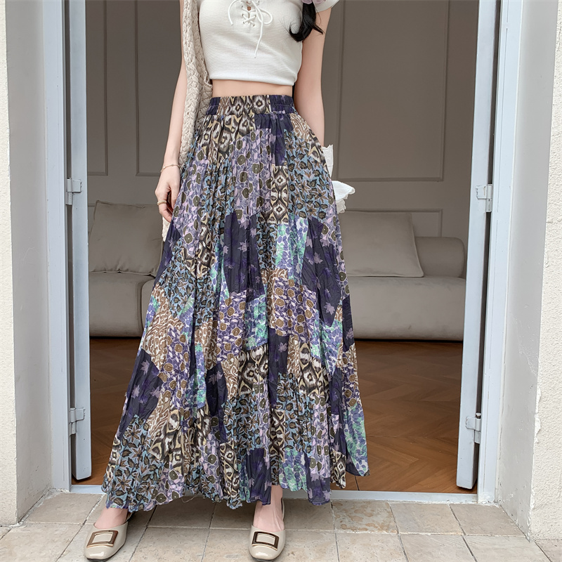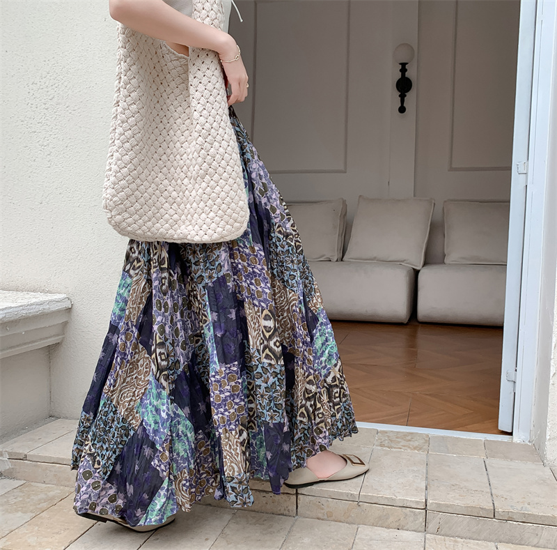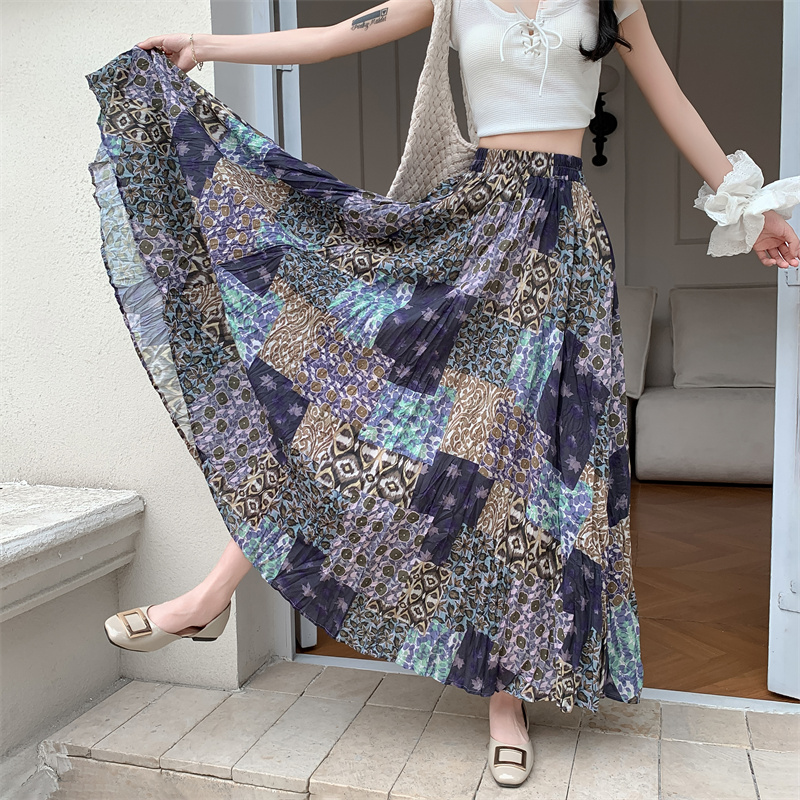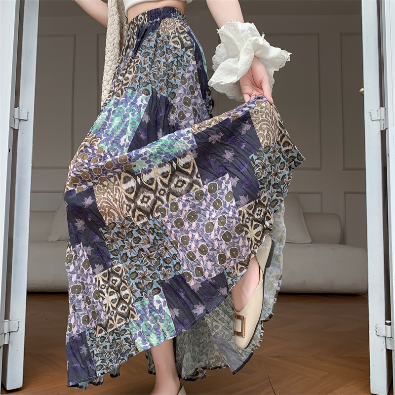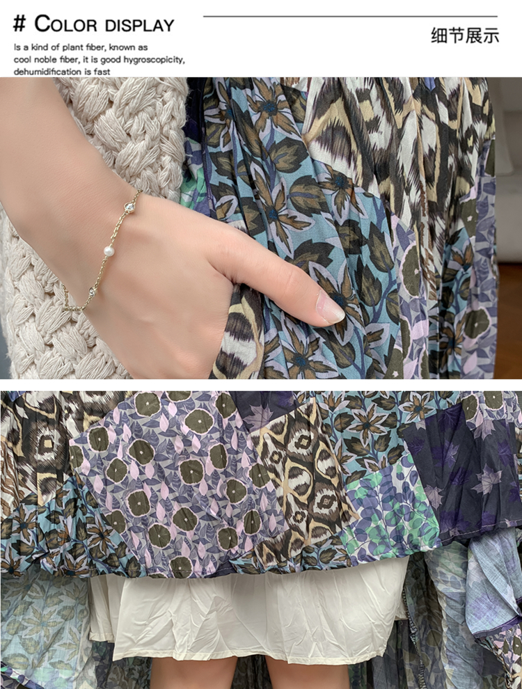 实拍法式复古度假风不规则印花民族风高腰半身裙舒适度假风长裙夏