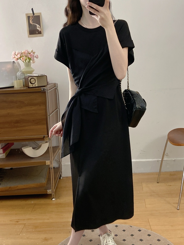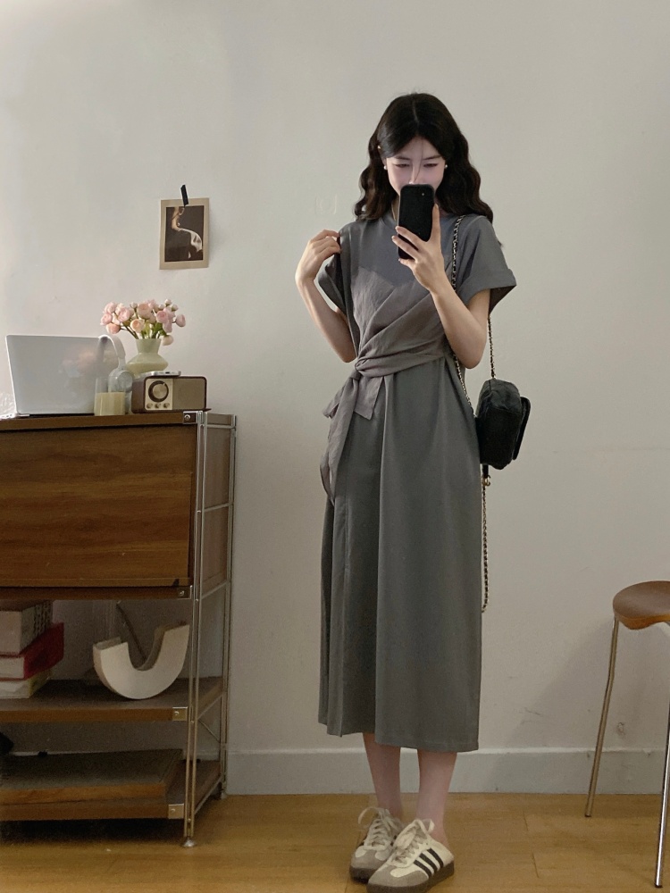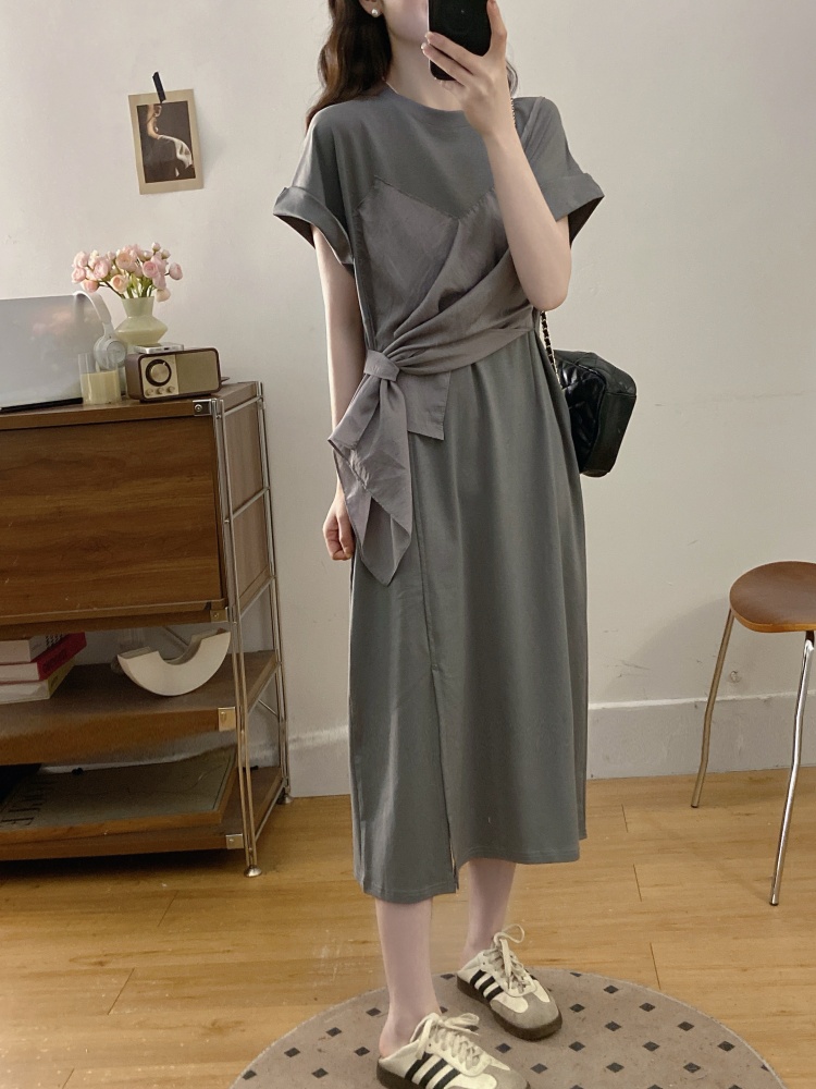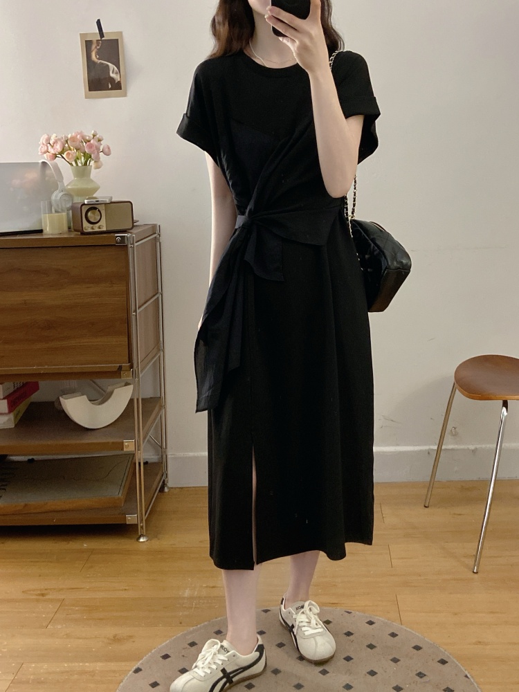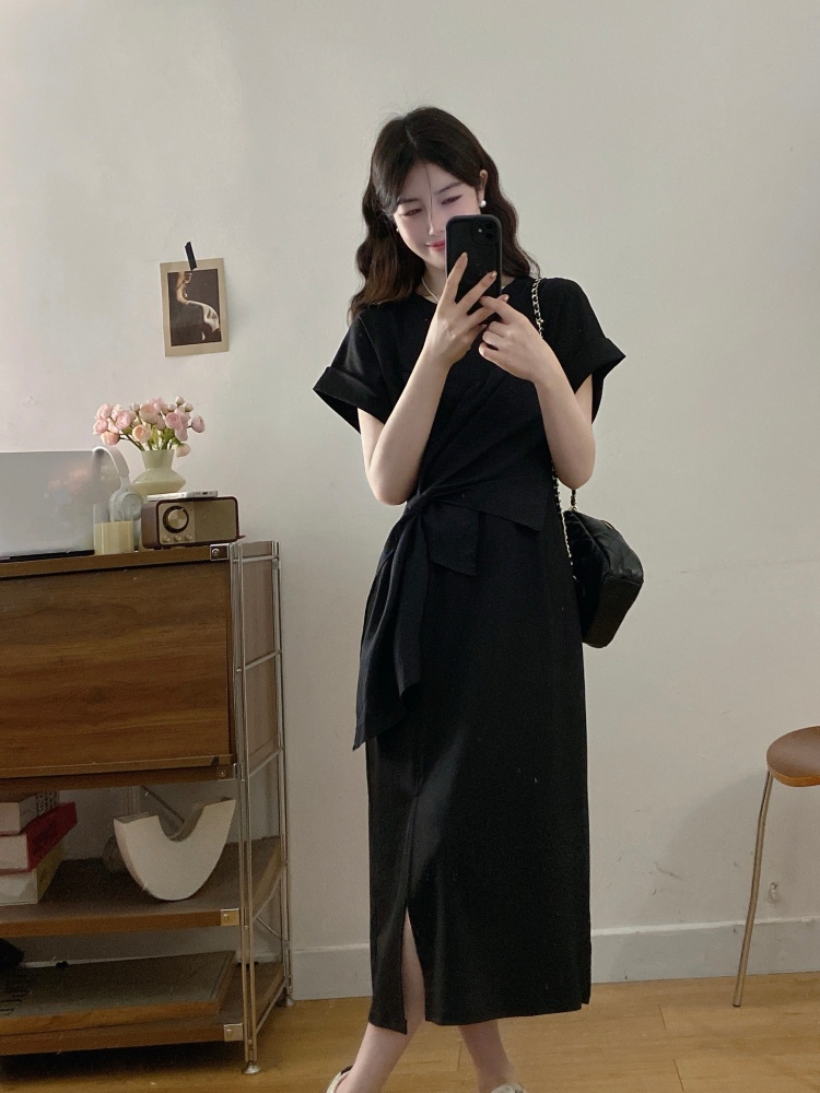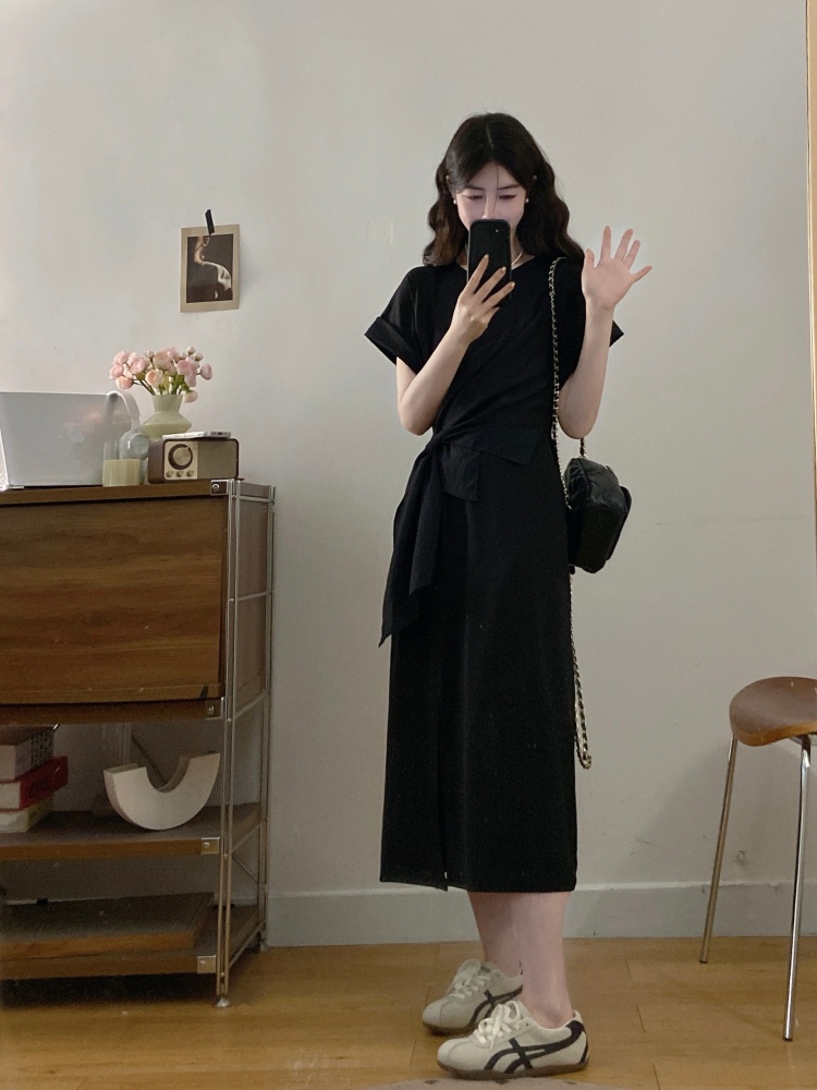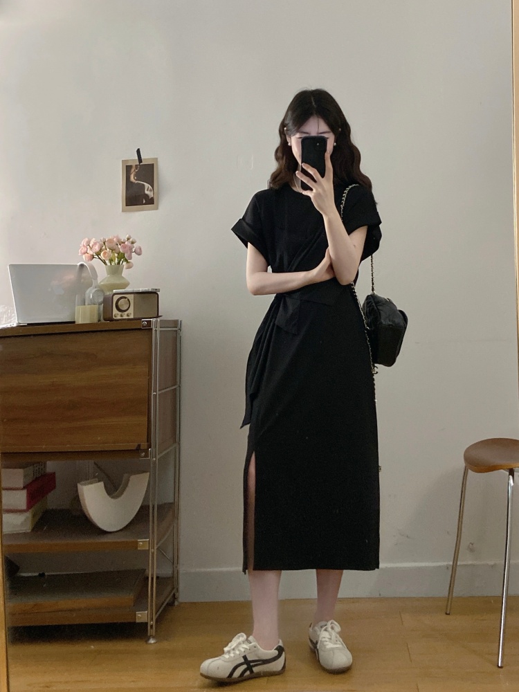 实拍大码女装胖MM2026新款短袖设计感收腰显瘦开叉连衣裙