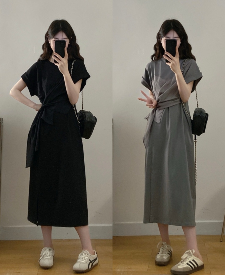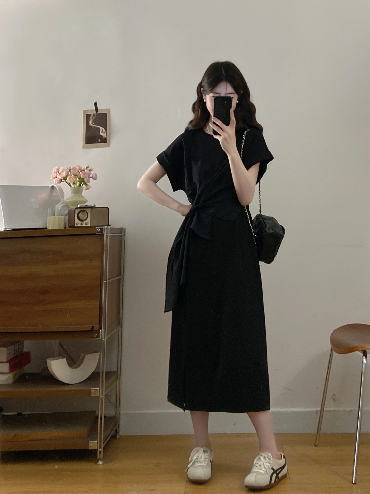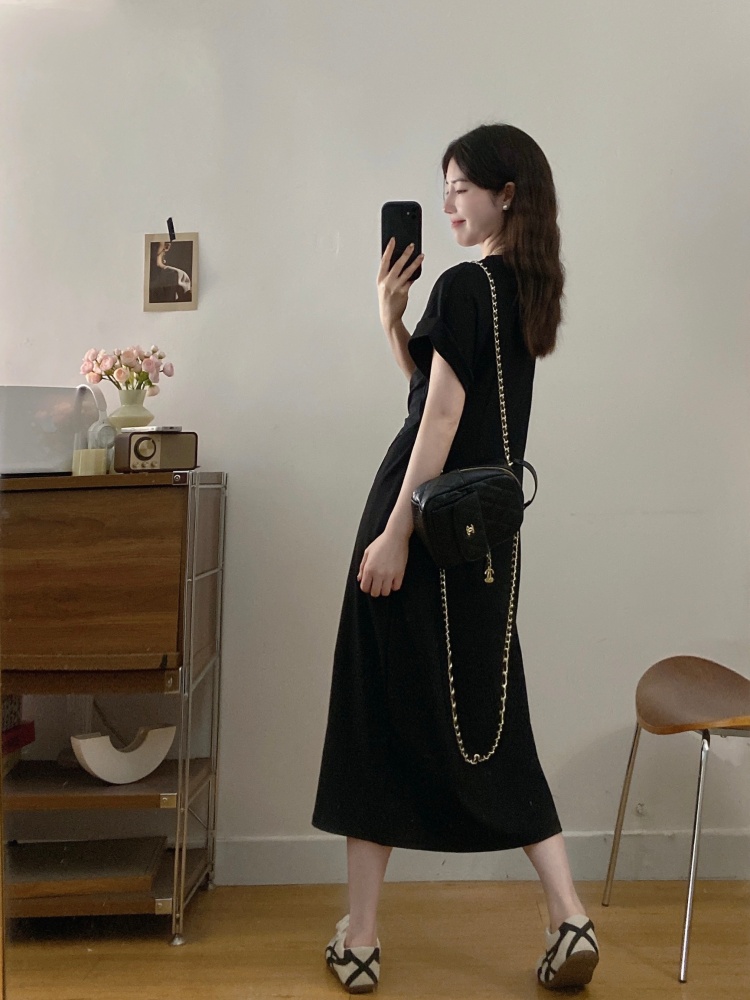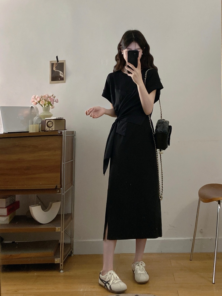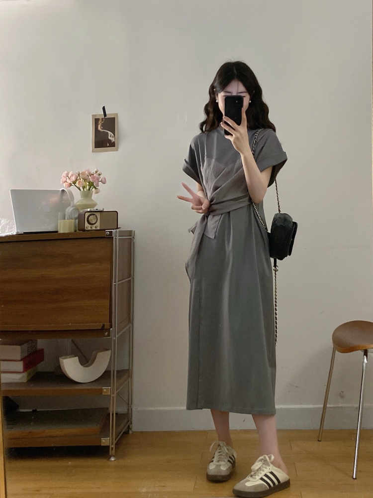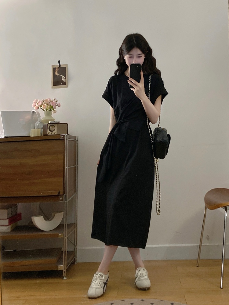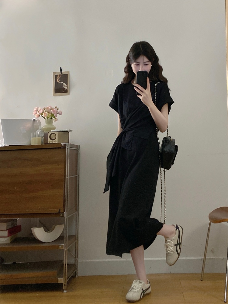 实拍大码女装胖MM2026新款短袖设计感收腰显瘦开叉连衣裙