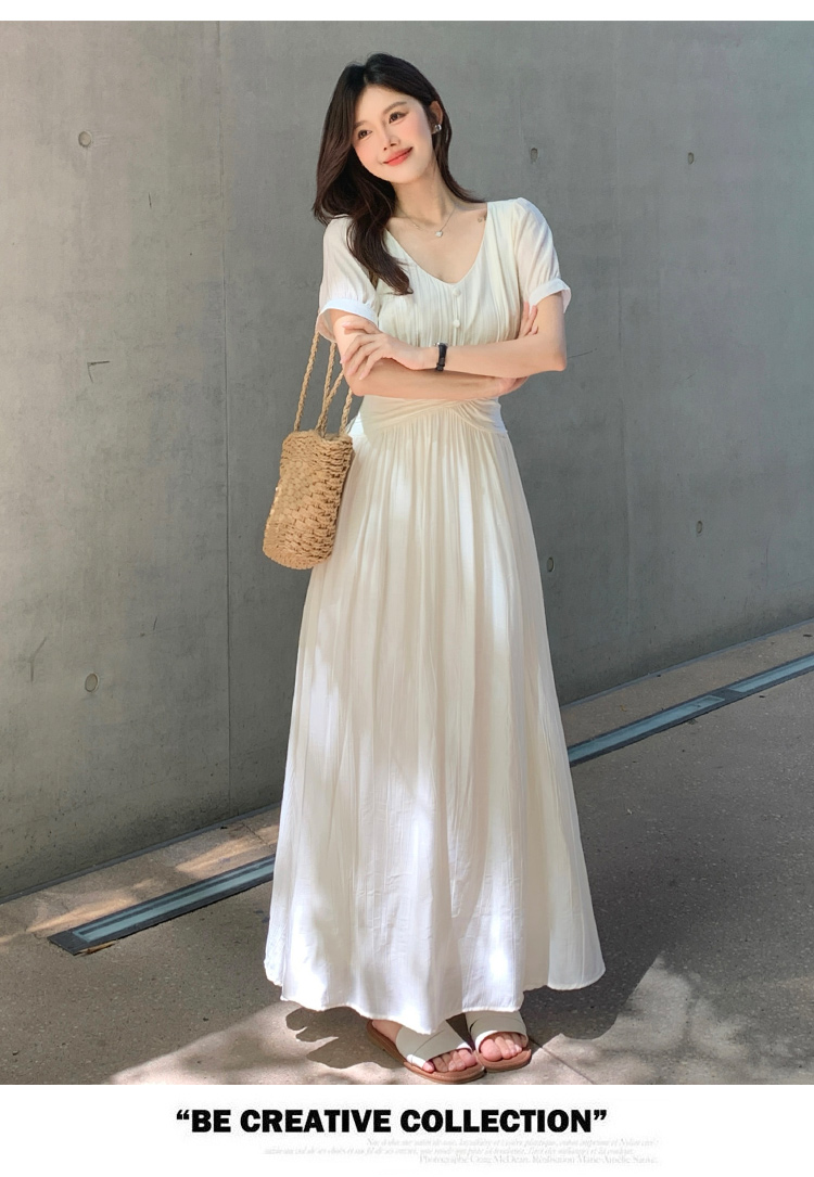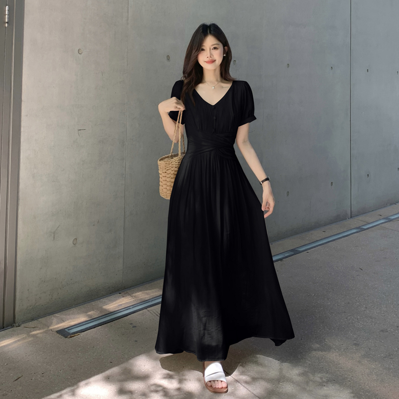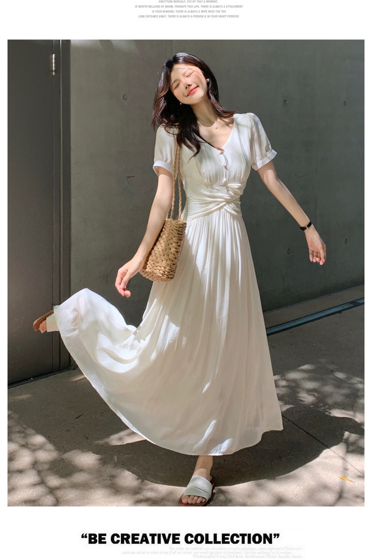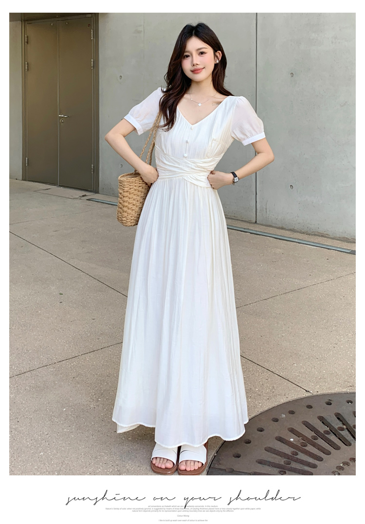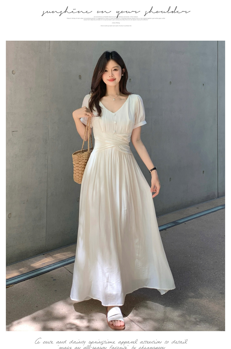 实拍~大码法式茶歇温柔气质v领连衣裙女收腰显瘦设计感沙滩长裙