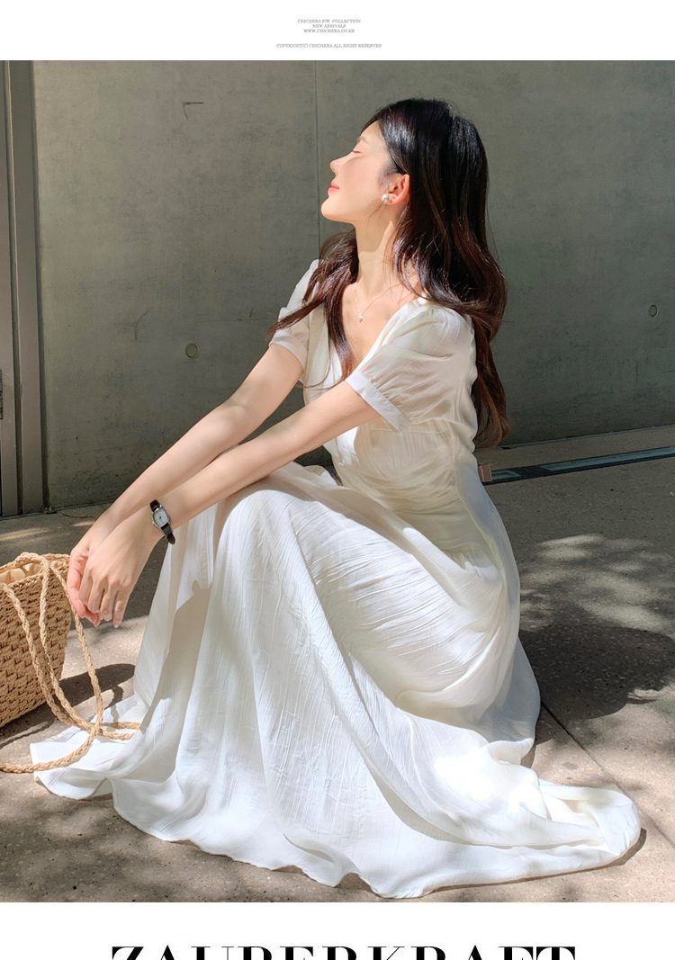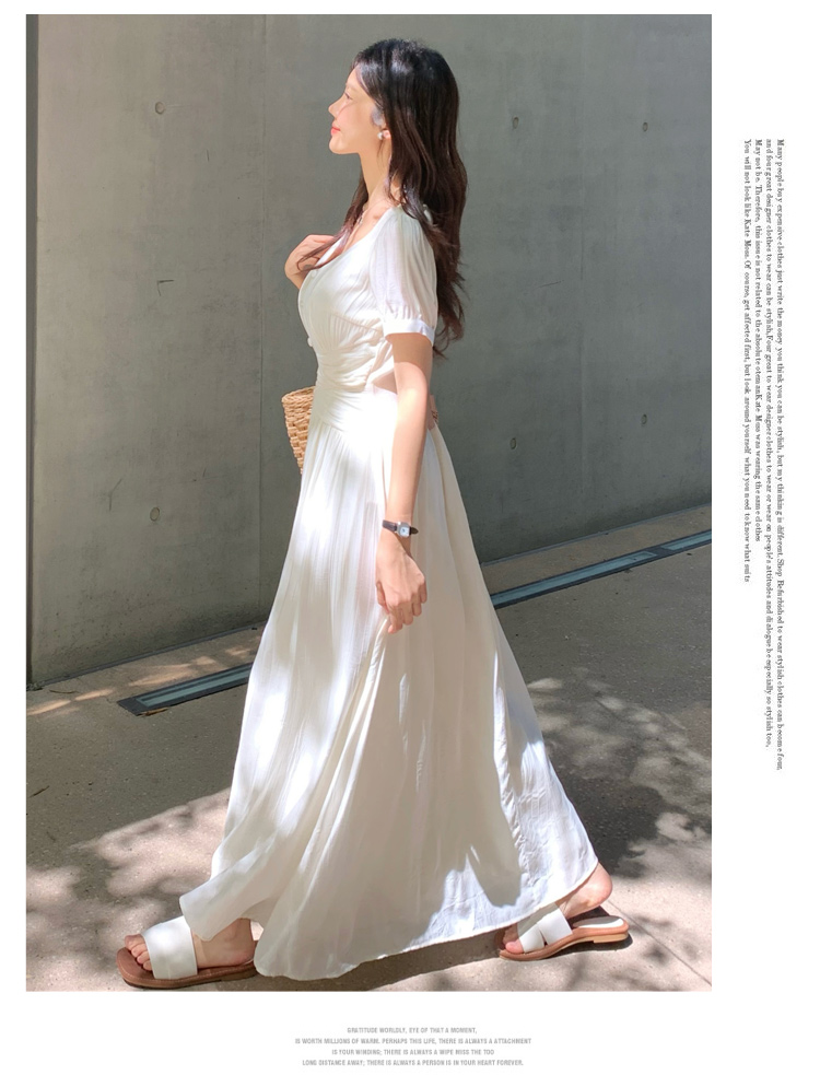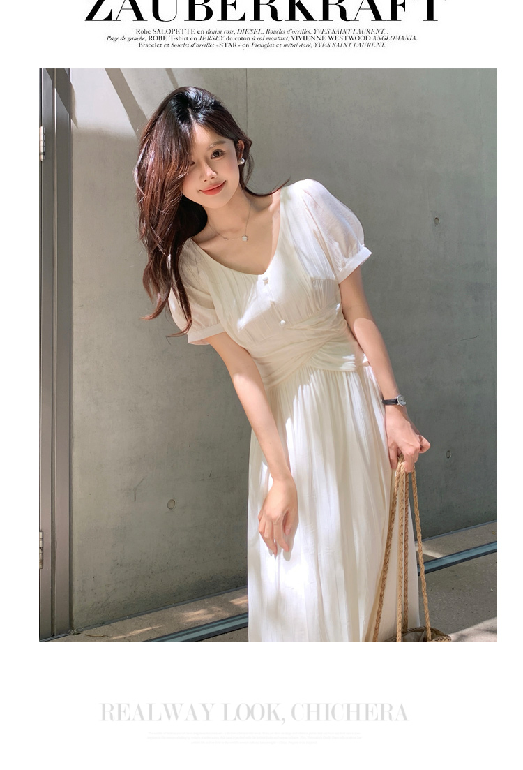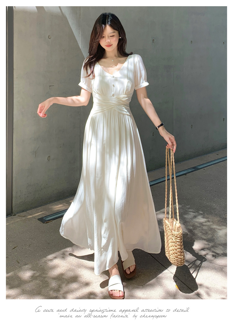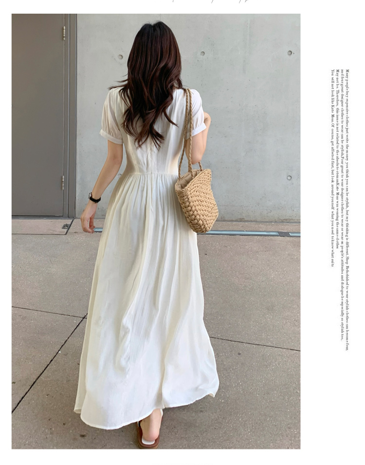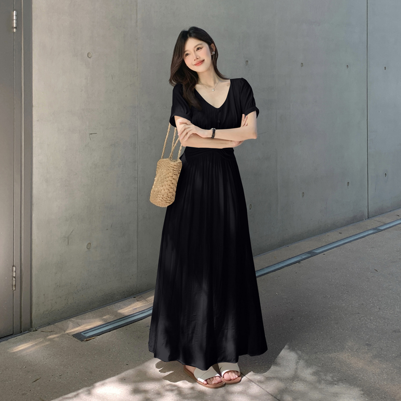 实拍~大码法式茶歇温柔气质v领连衣裙女收腰显瘦设计感沙滩长裙