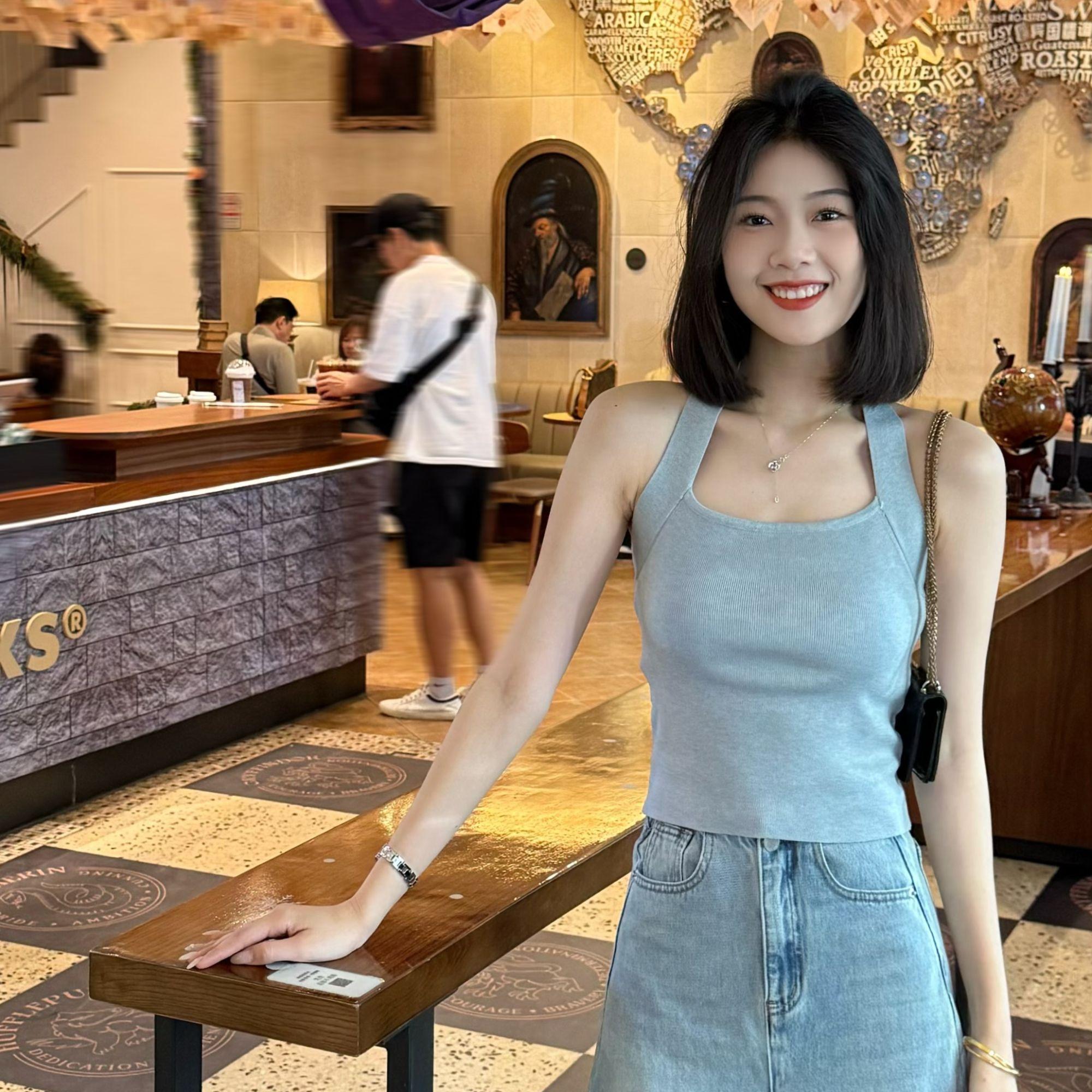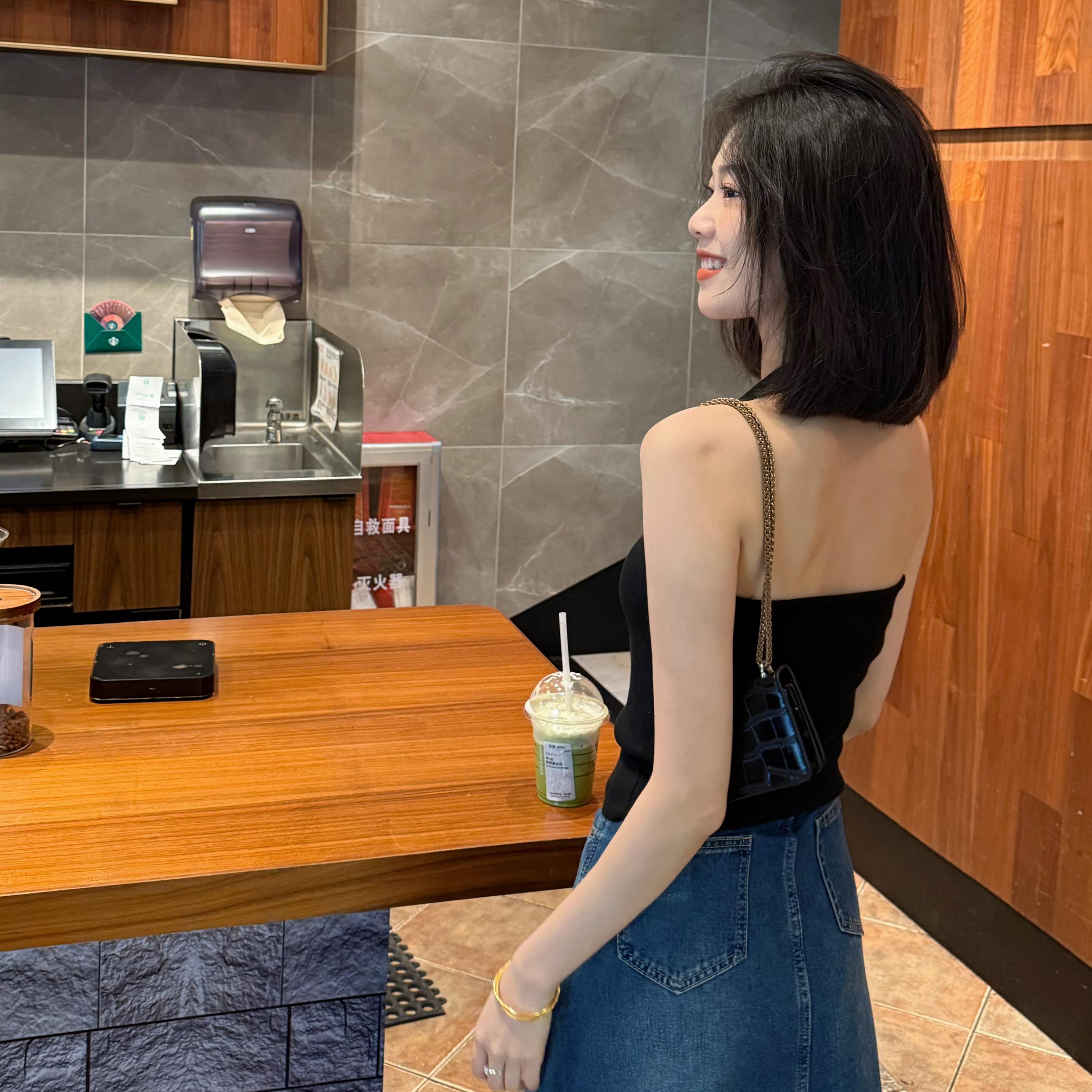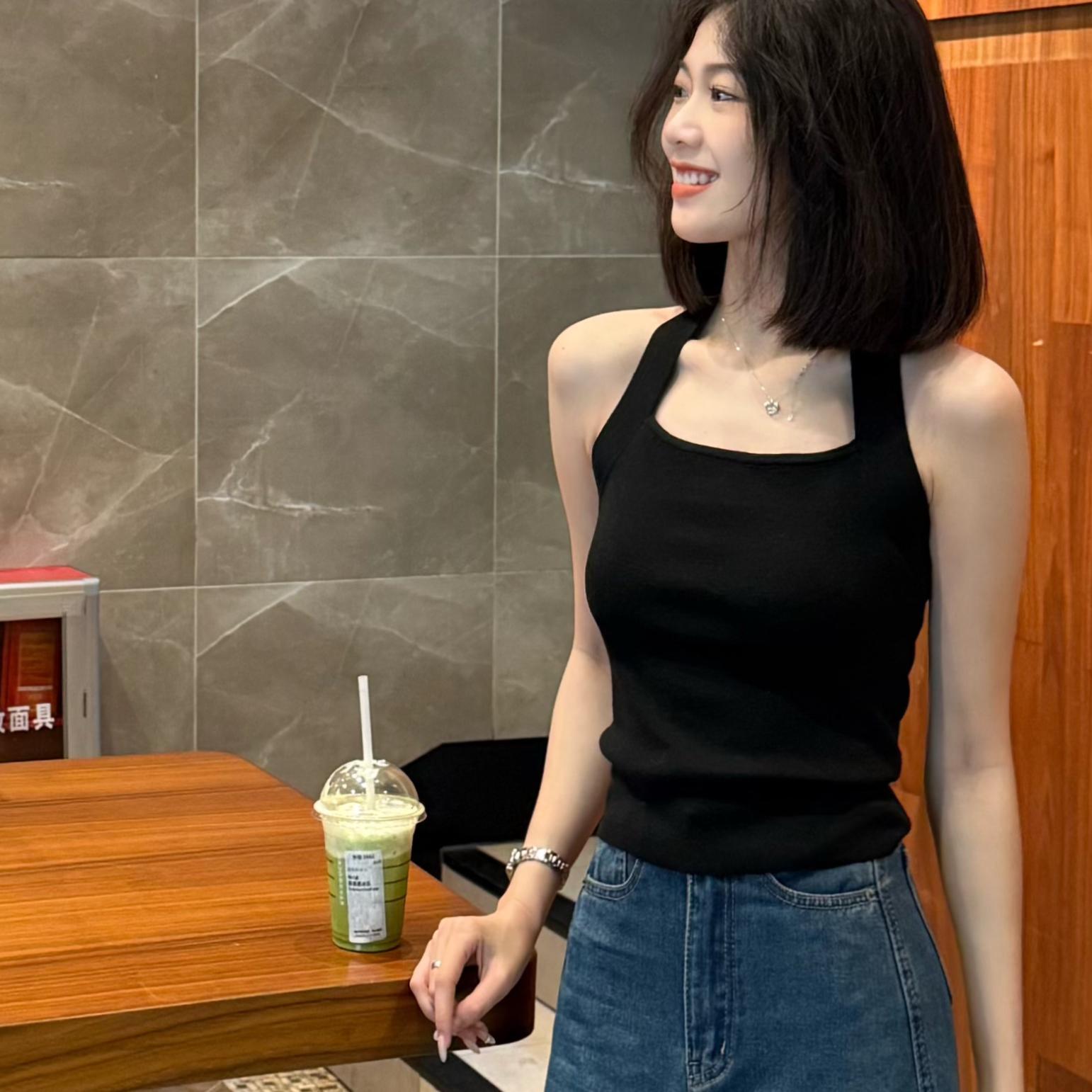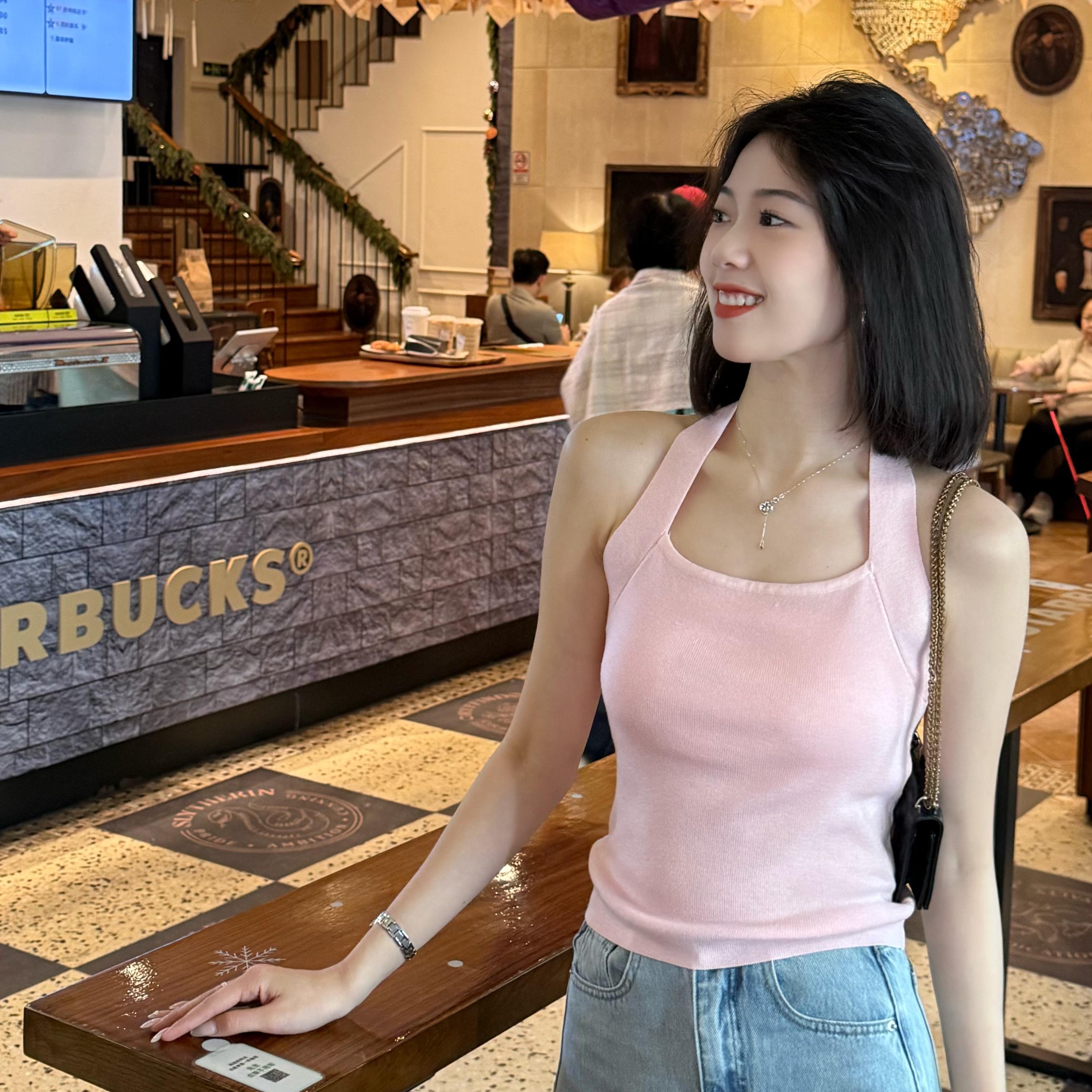 福桃推荐夏季新款设计款挂脖露背显瘦修身薄款针织衫上衣