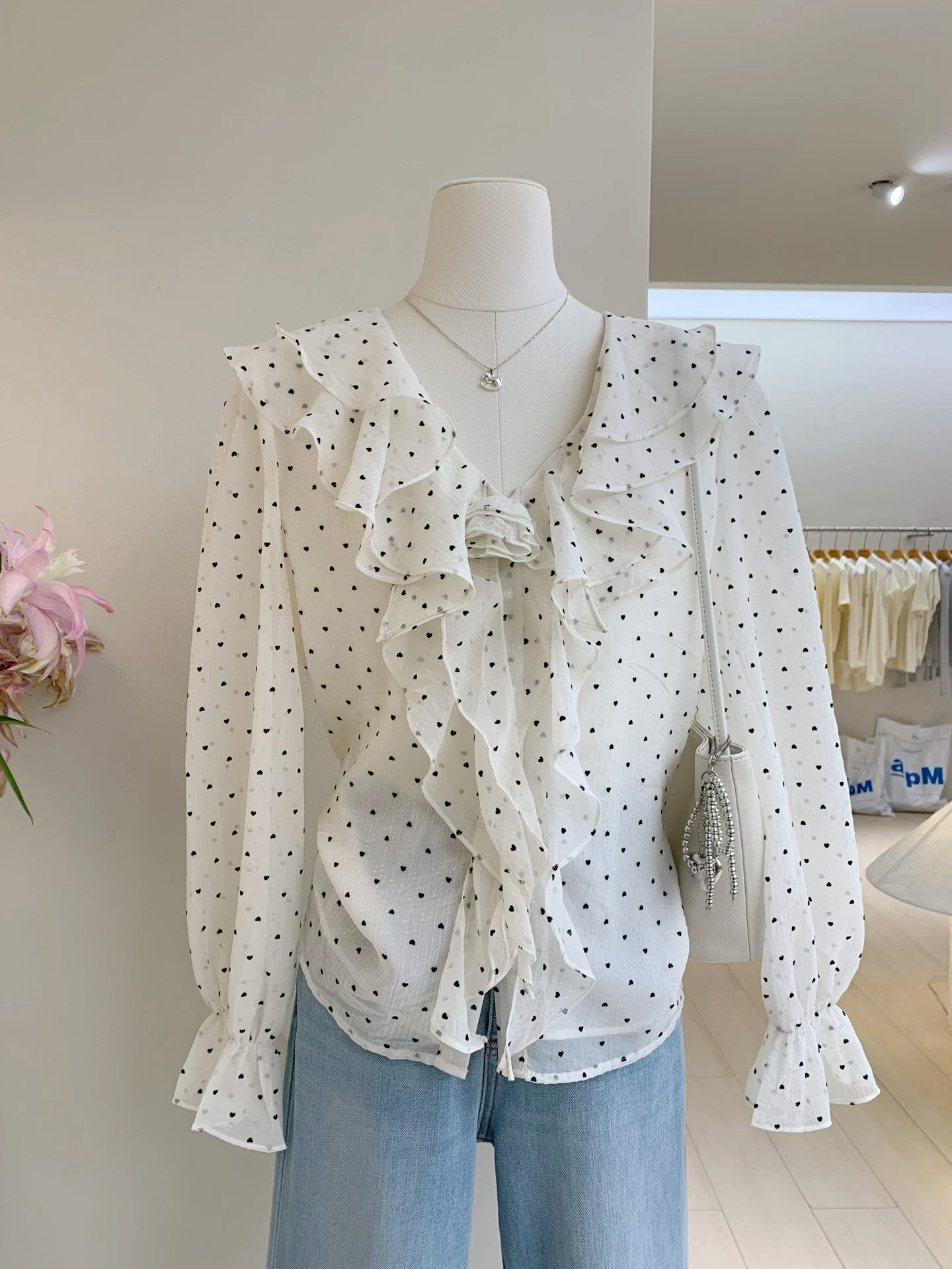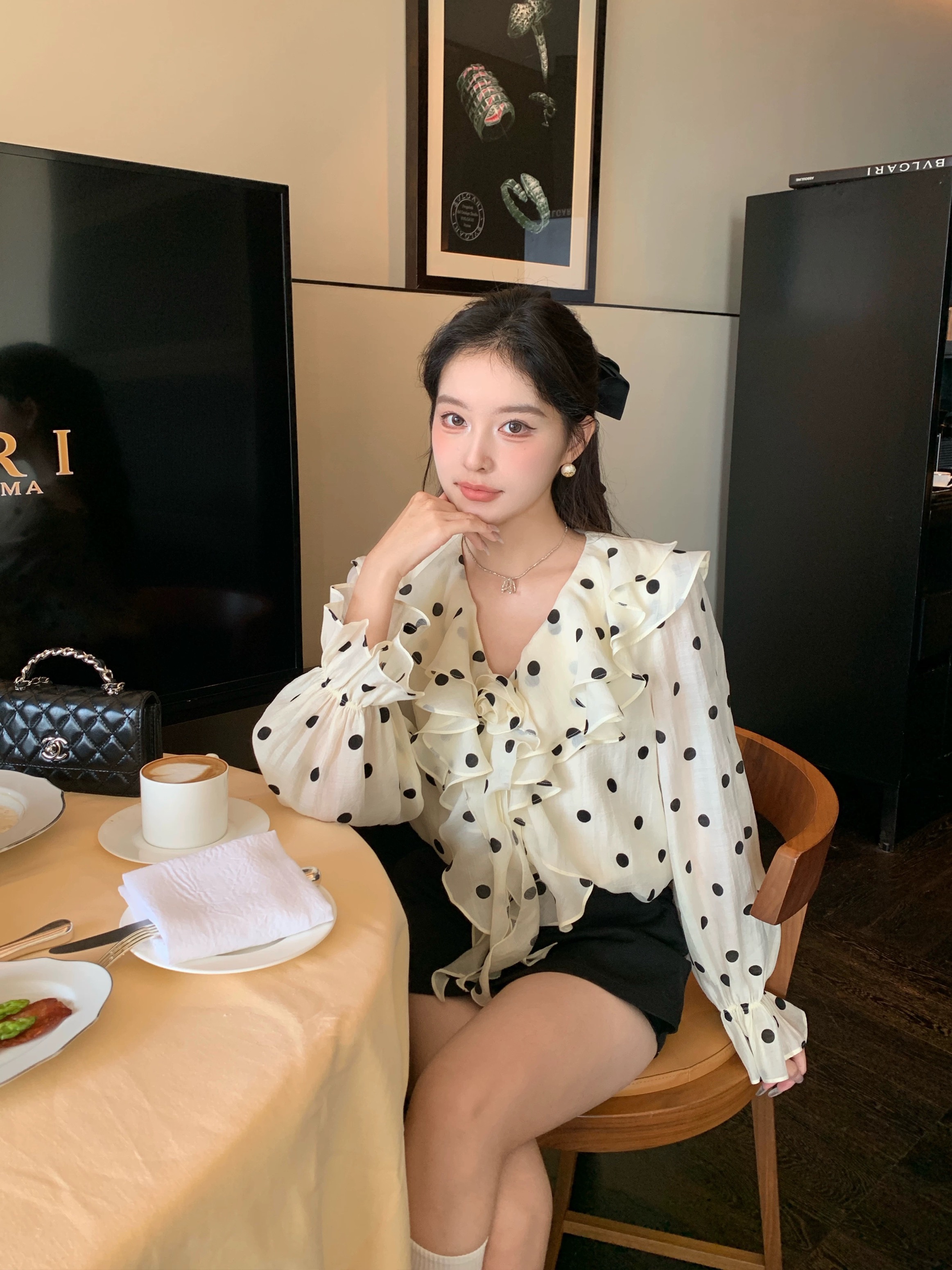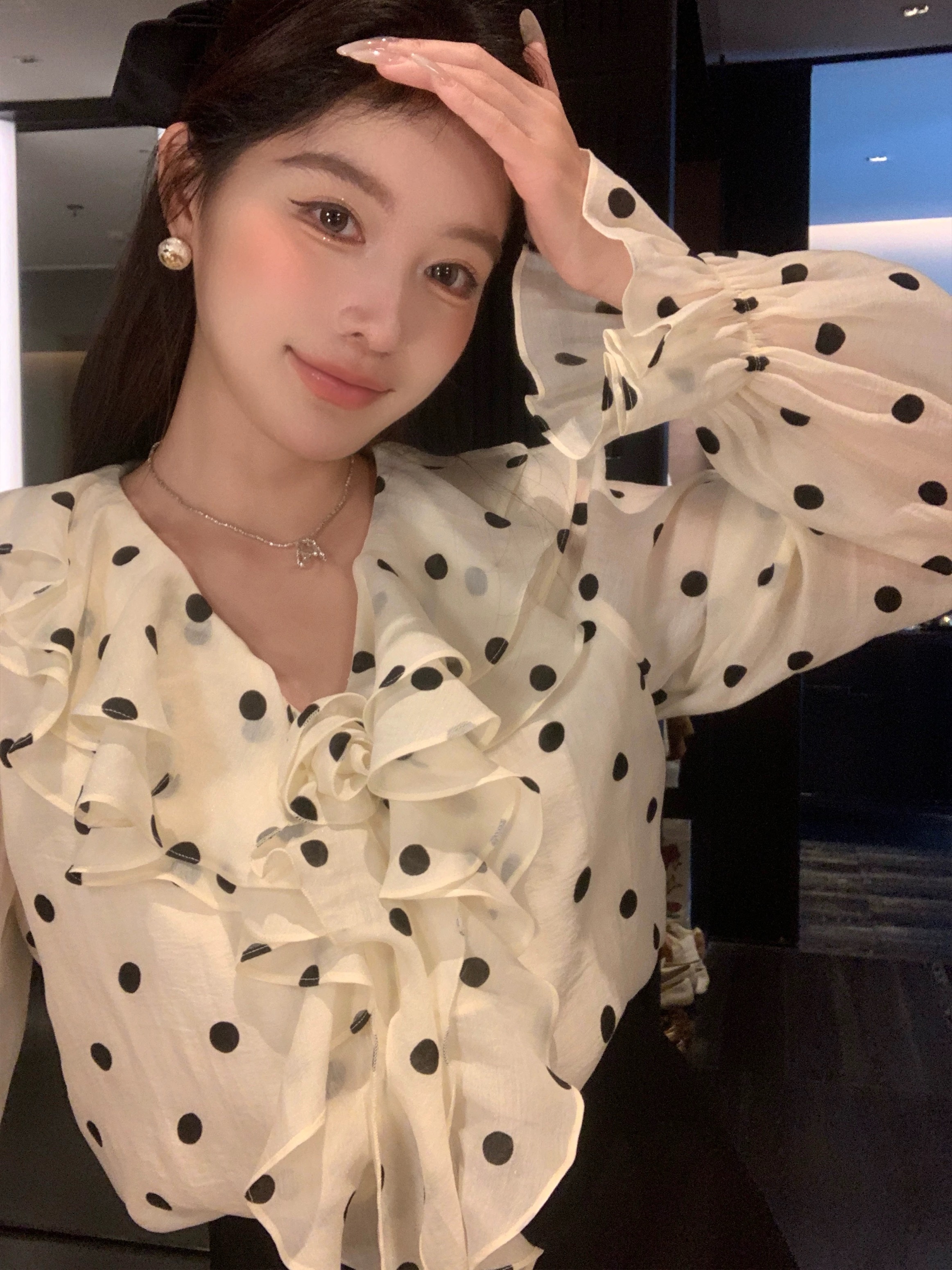 春日智性Crush爱心波点V领长袖衬衫韩系甜美荷叶边宽松显瘦衬衣女