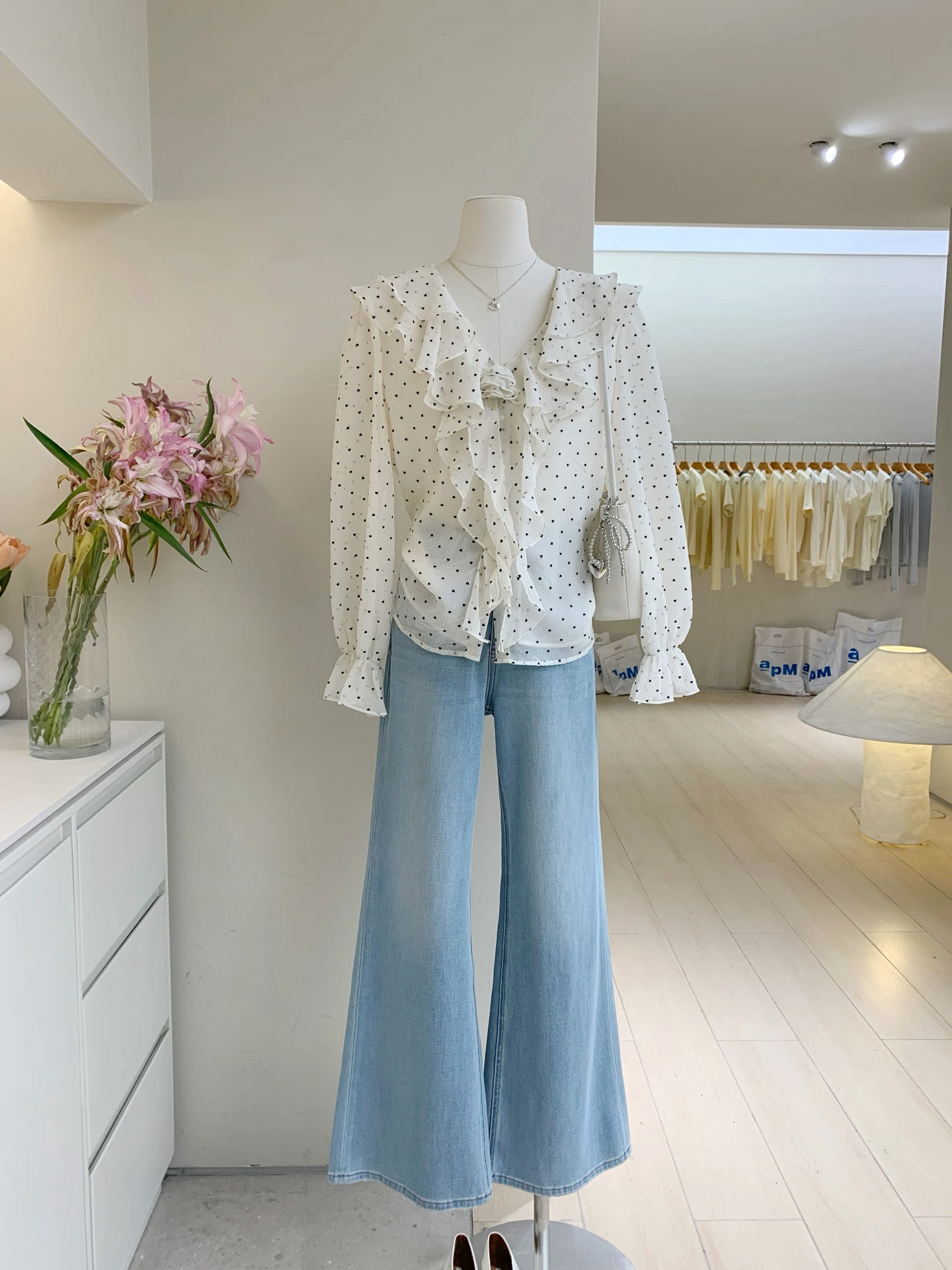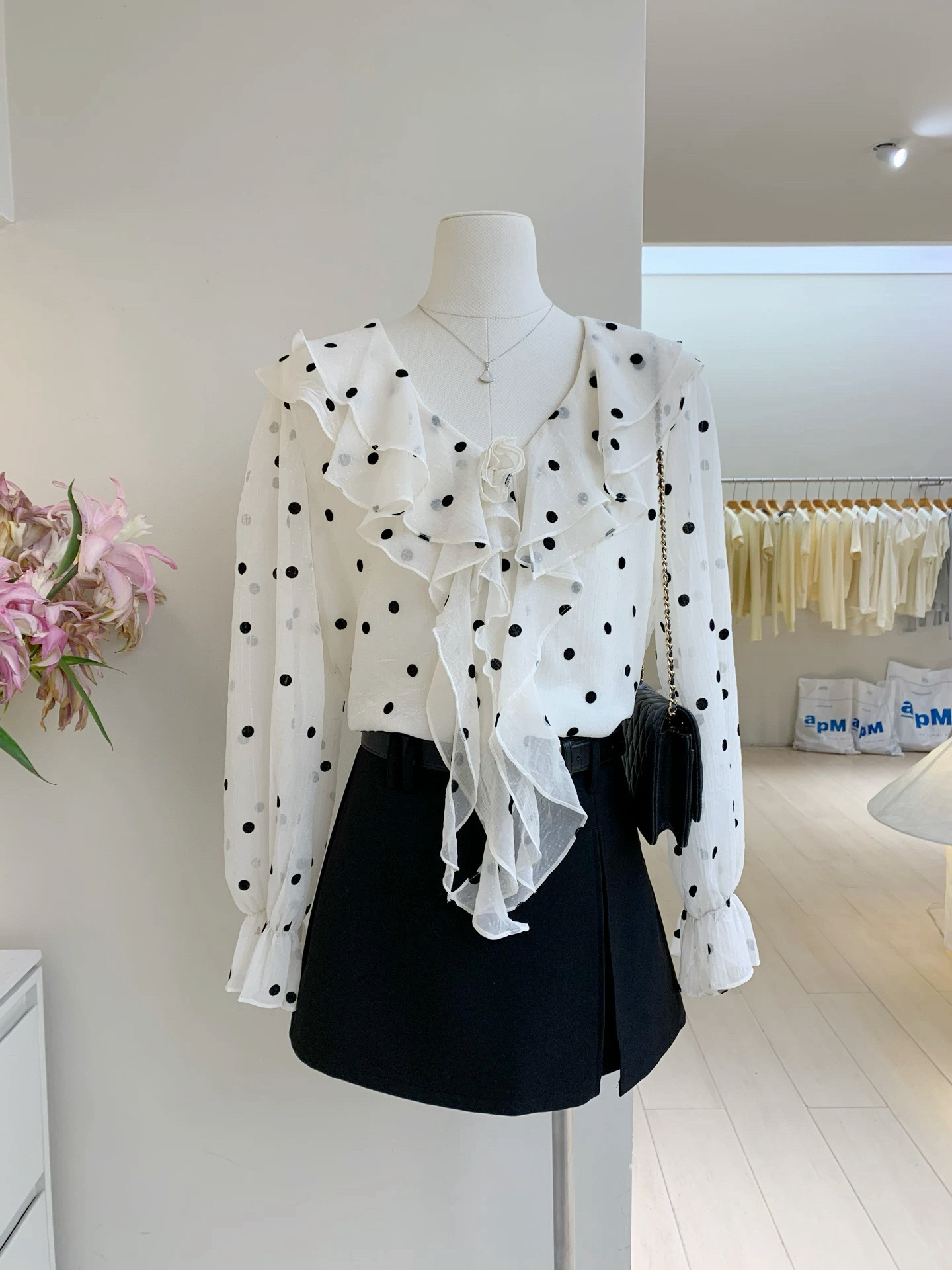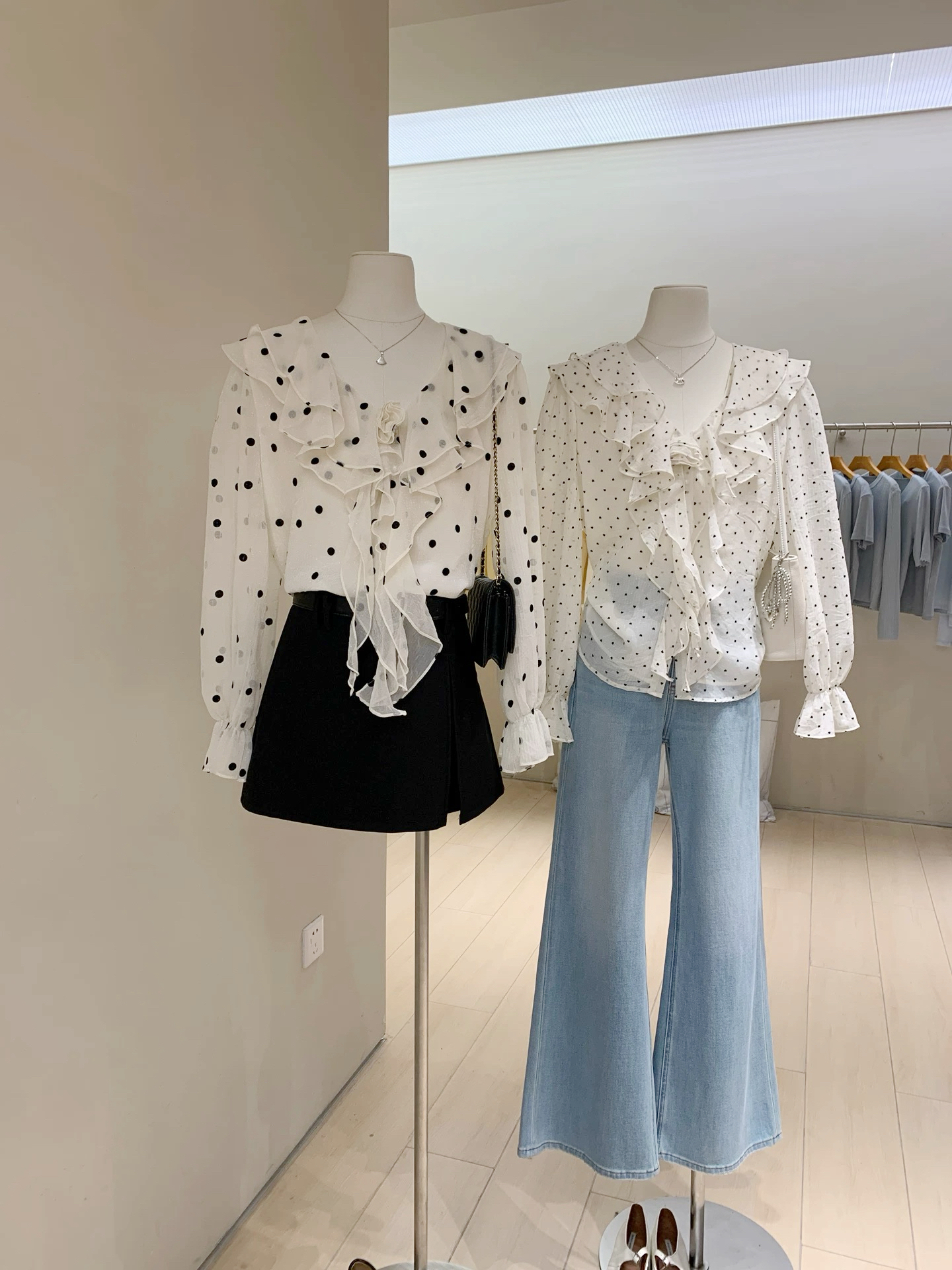 春日智性Crush爱心波点V领长袖衬衫韩系甜美荷叶边宽松显瘦衬衣女