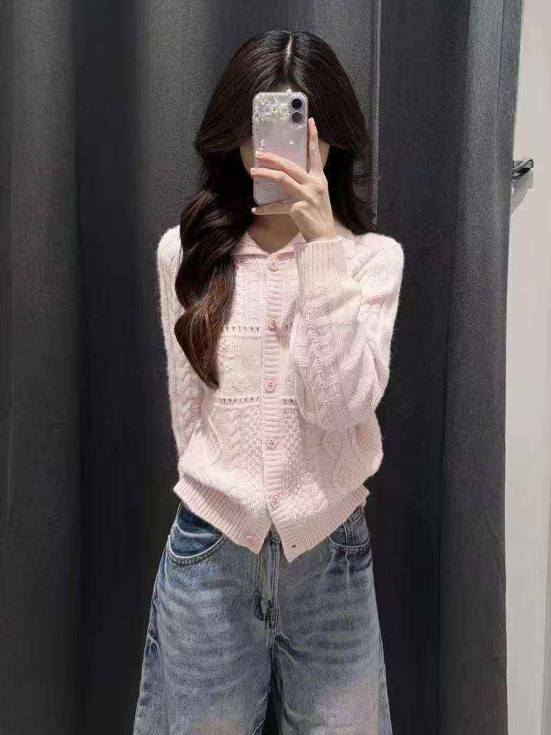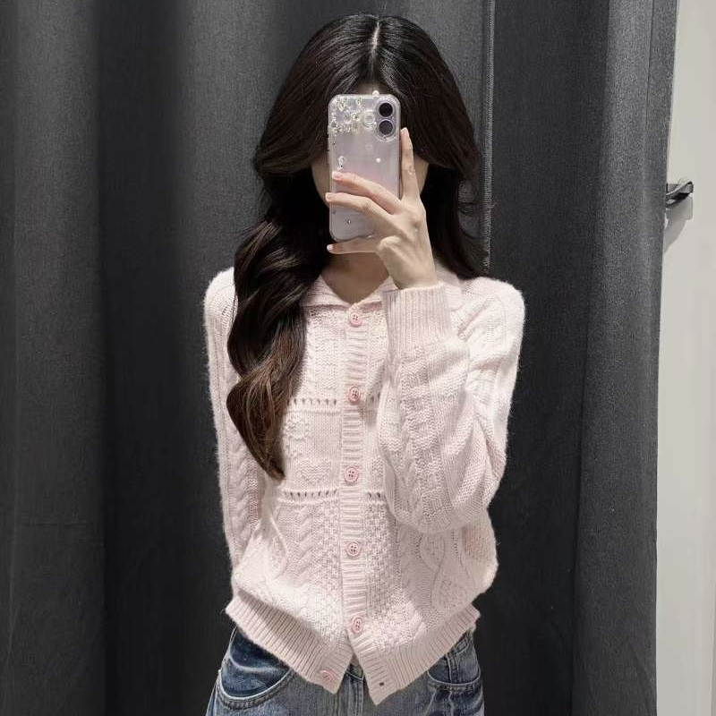 甜美粉色翻领毛衣外套女秋冬季2026新款独特漂亮镂空针织开衫上衣