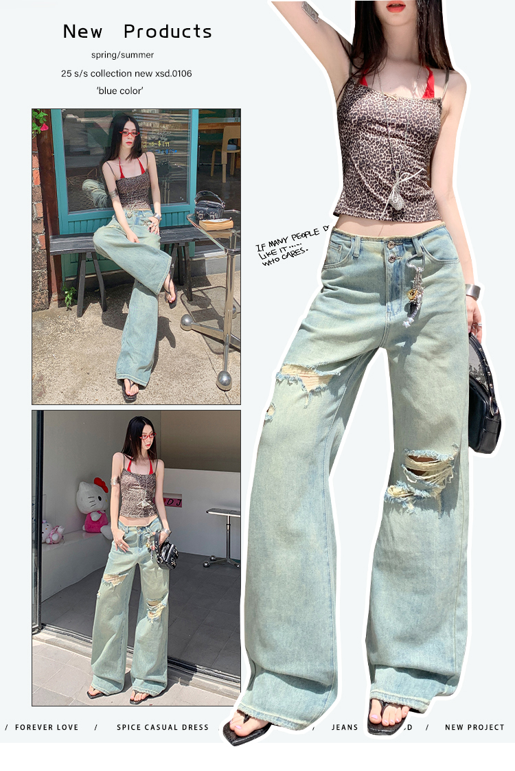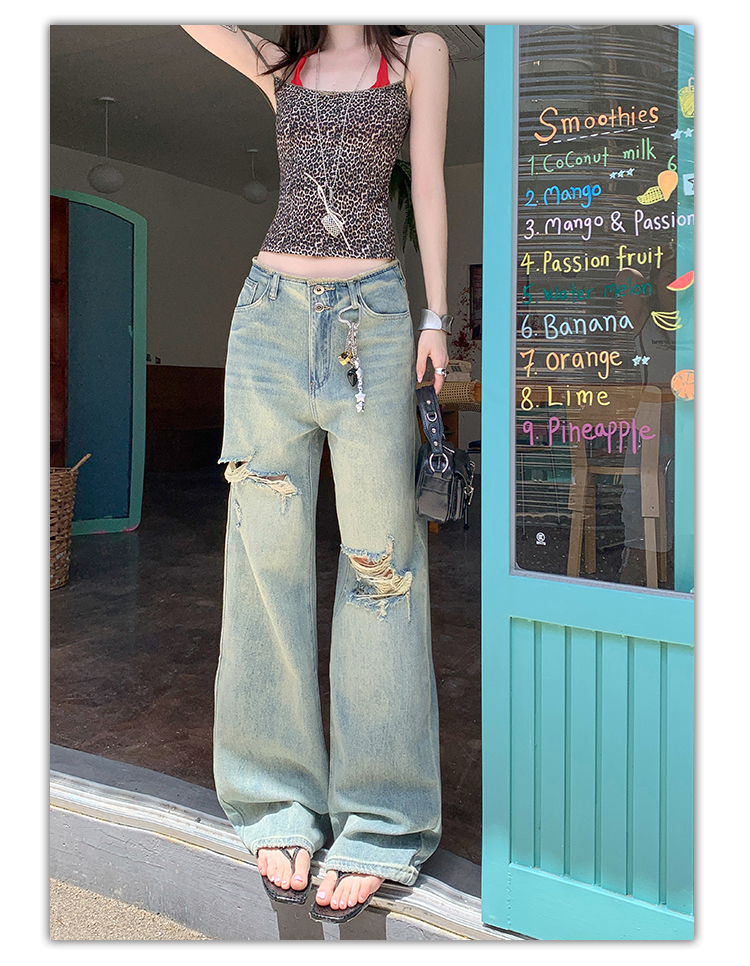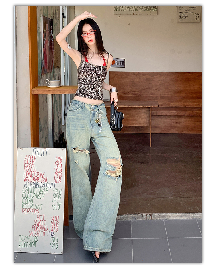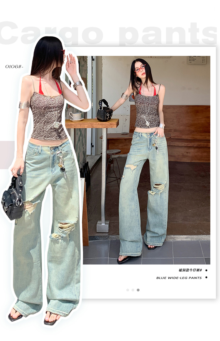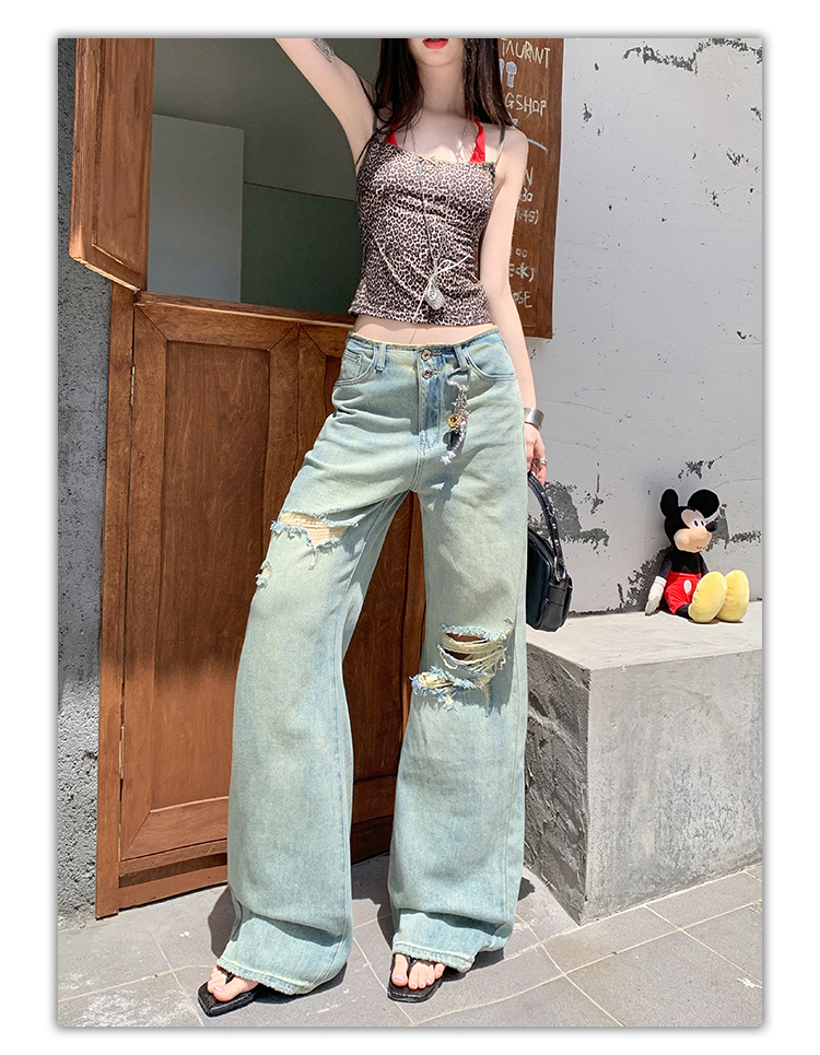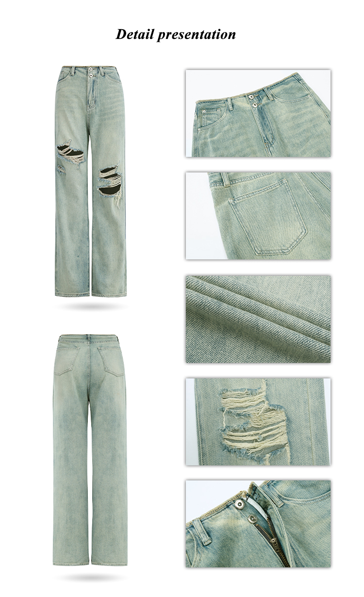 2026春夏新款街头双纽扣破洞水洗做旧宽松直筒阔腿牛仔裤