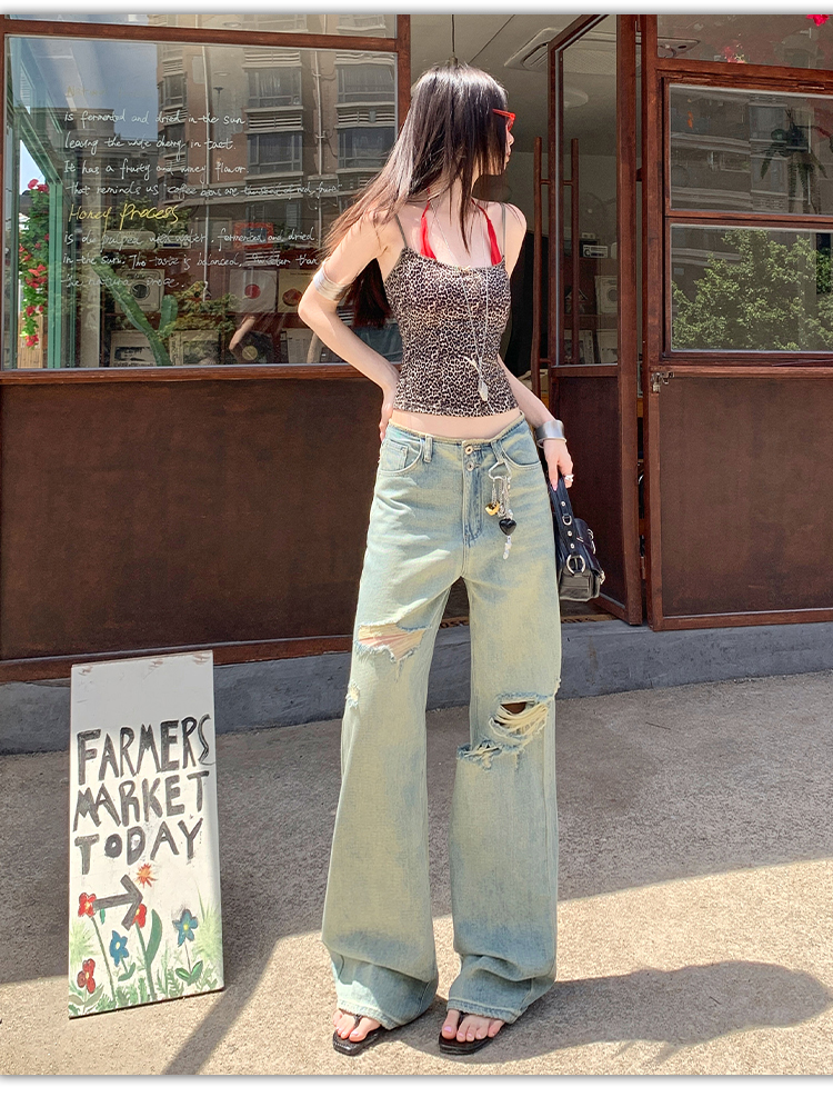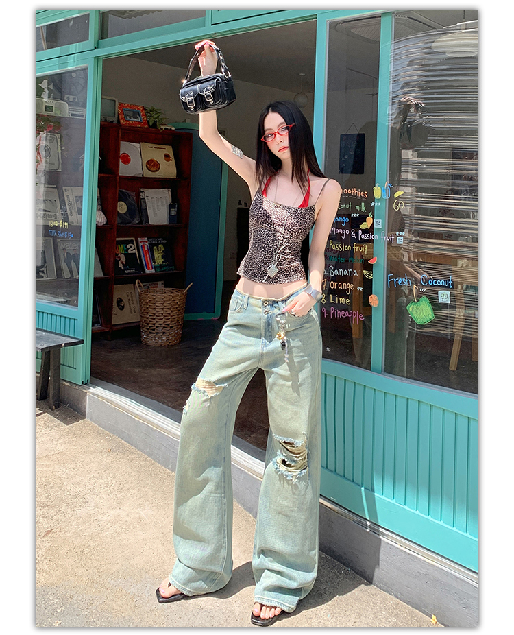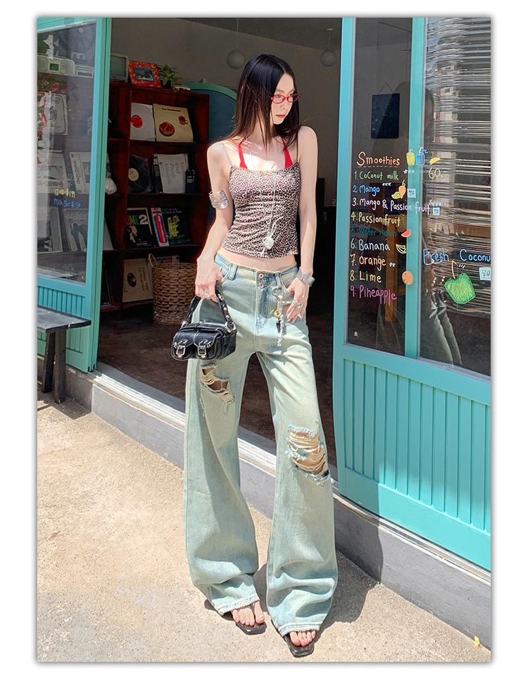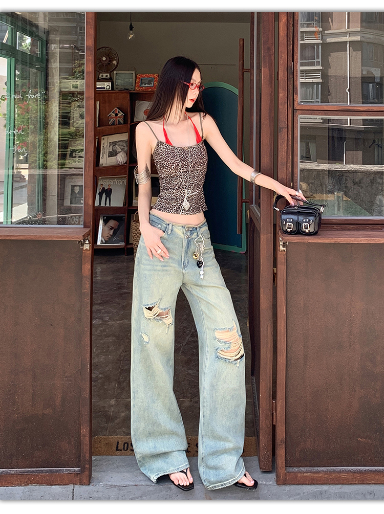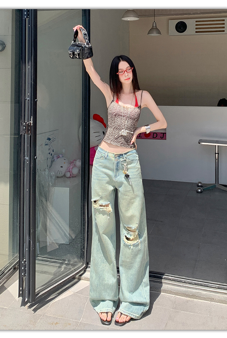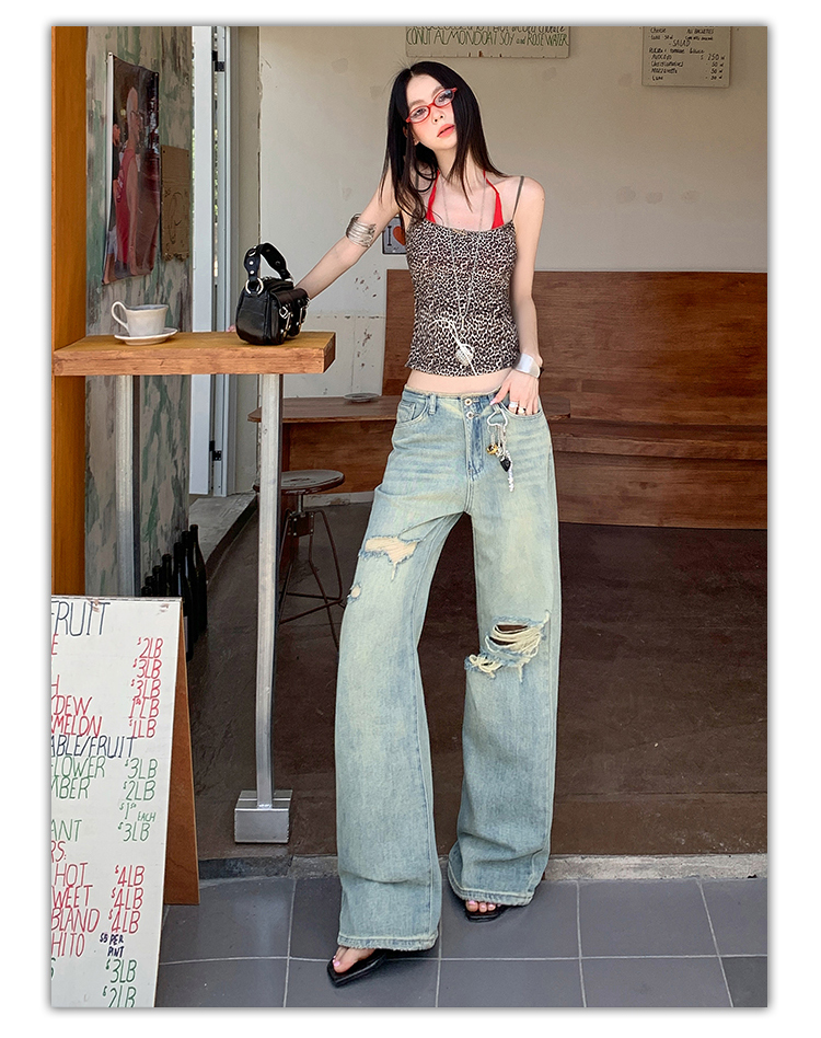 2026春夏新款街头双纽扣破洞水洗做旧宽松直筒阔腿牛仔裤
